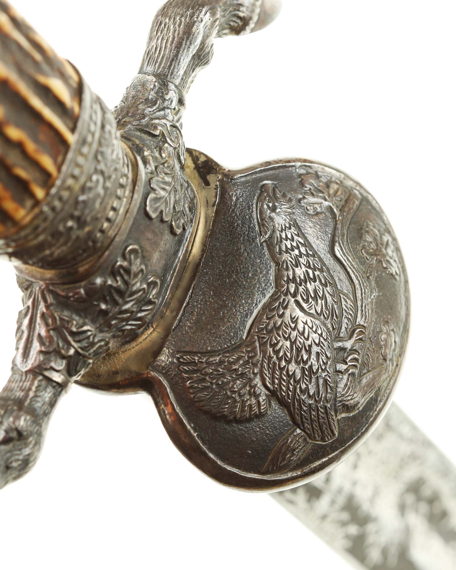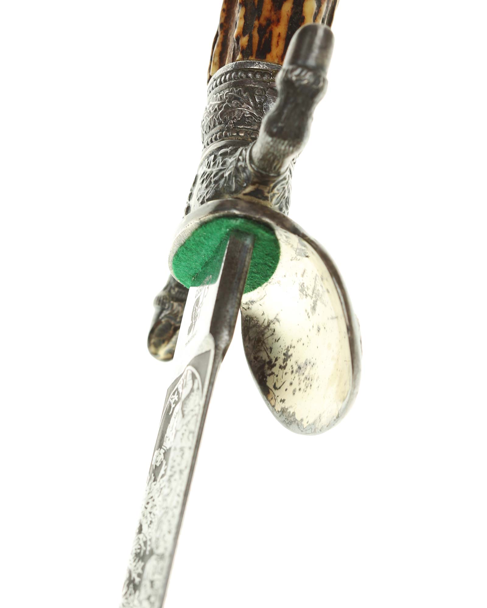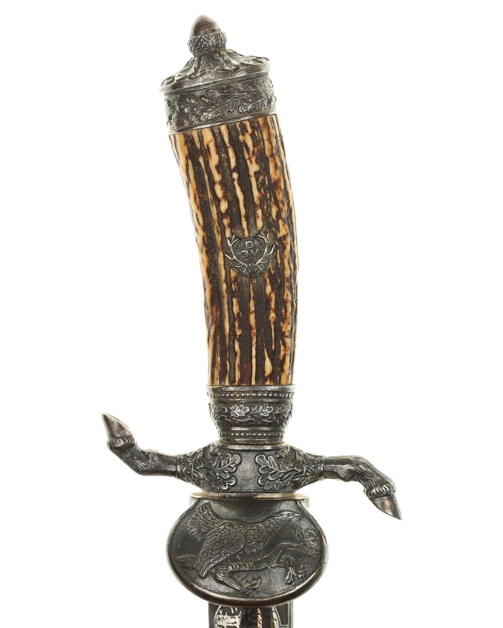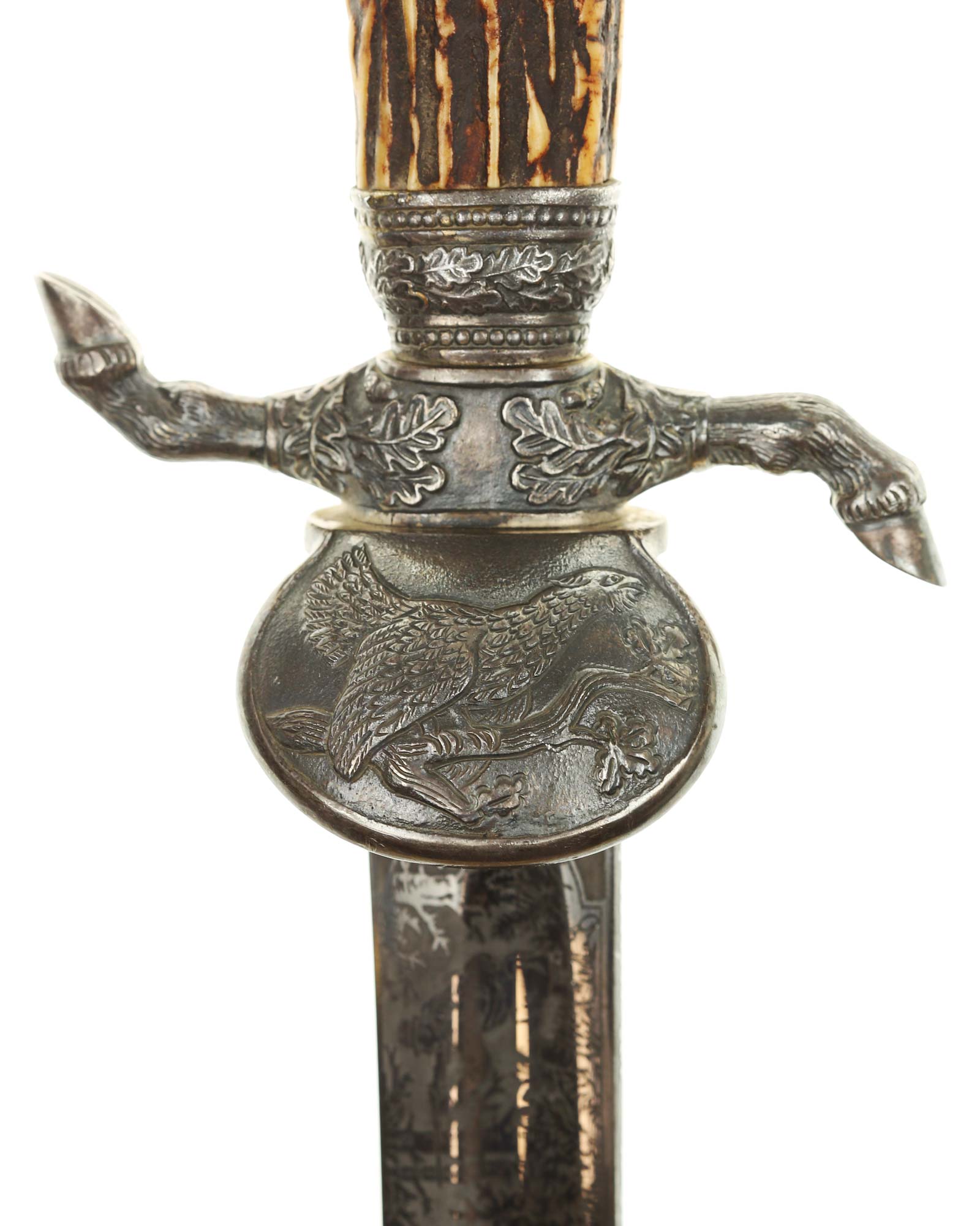 Кинжал охотничий Хиршфангер (нем. Deutscher Jägerverband (DJV) Hirschfänger). Кинжал с клеймом Original Eickhorn Solingen (Карл Айкхорн Золинген). Рукоять роговая, крепится на черенке клинка всадным способом. Навершие рукояти стальное, овальной формы, плоское, с декоративным винтом. Перекрестье рукояти стальное в виде стилизованных кабаньих копыт направленных в разные стороны. В центре перекрестья с одной стороны закреплен декоративный щитик, выполненный в форме раковины. Клинок стальной, прямой, двухлезвийный, ромбического сечения, без долов, у пяты плоский, с двух сторон богато украшен травлением со сценами охоты на кабана и оленя. На пяте клинка с обратной стороны имеется клеймо известной фирмы - Карл Айкхорн, г. Золинген, характерное для продукции, выпускаемой данным производителем в период с 1941-1945 гг. Обух клинка практически на всю длинну украшен орнаментом из дубовых листьев и именем бывшего владельца. Ножны деревянные, обтянуты темной кожей, со стальным прибором, состоящим из устья со шпеньком в виде желудя и наконечника. Внутри устья для дополнительной фиксации вставлена стальная распорка-фиксатор.