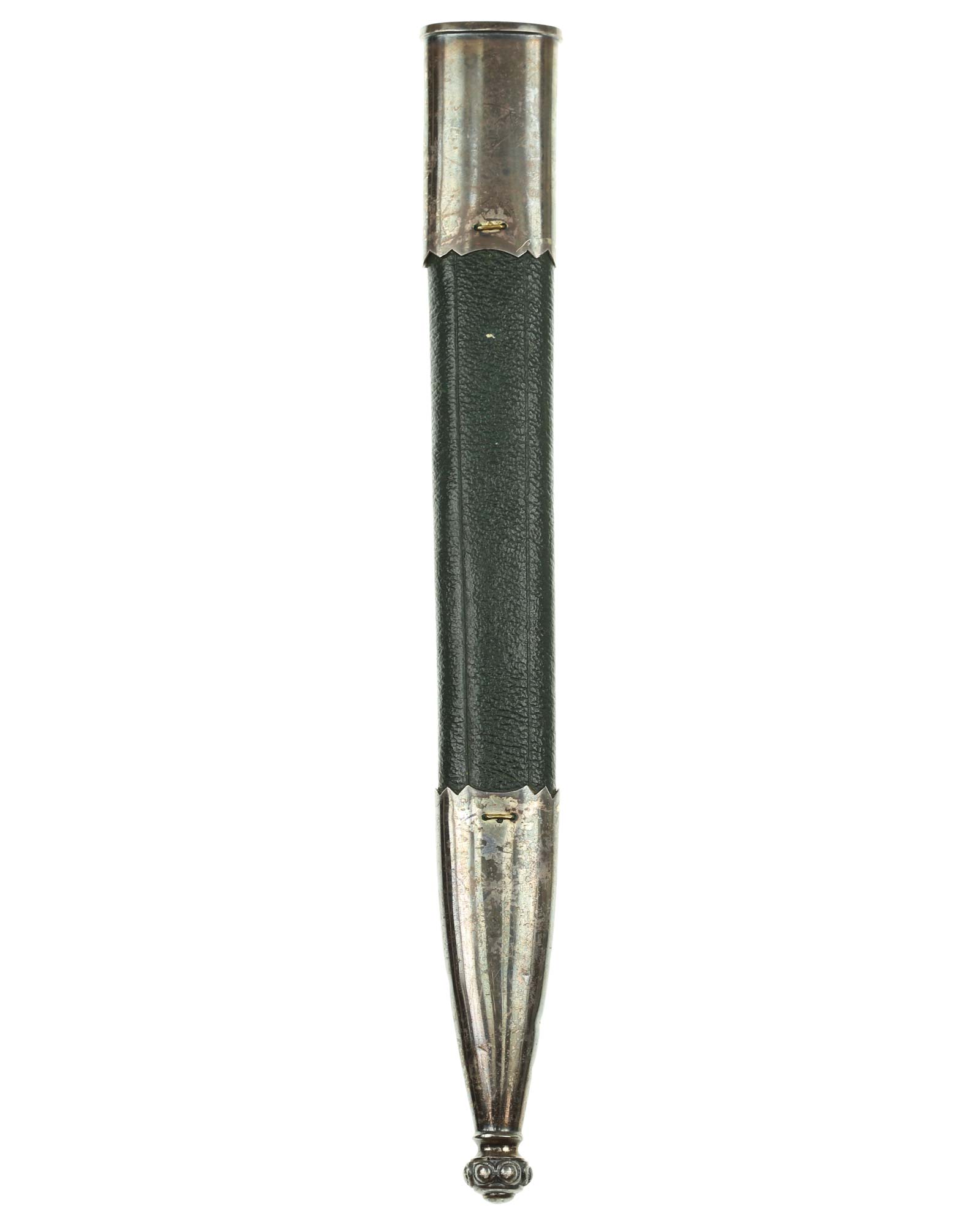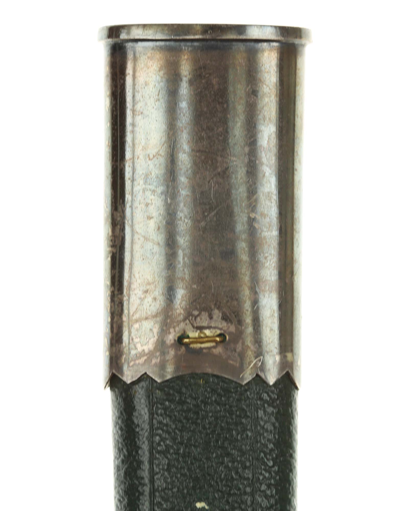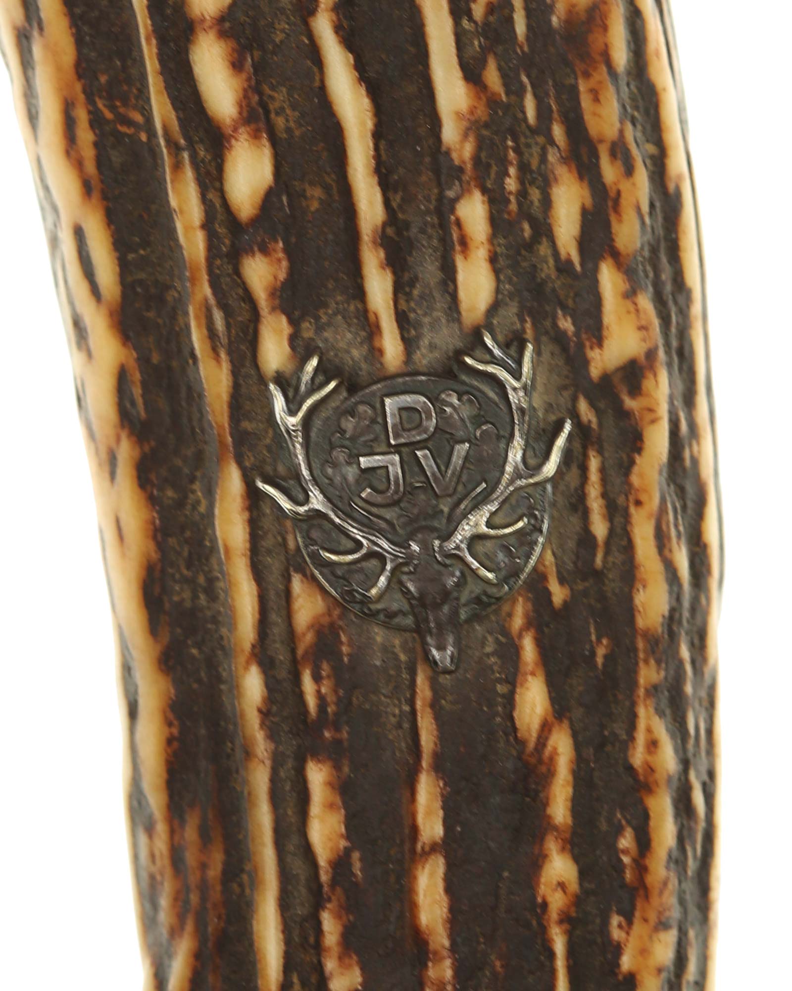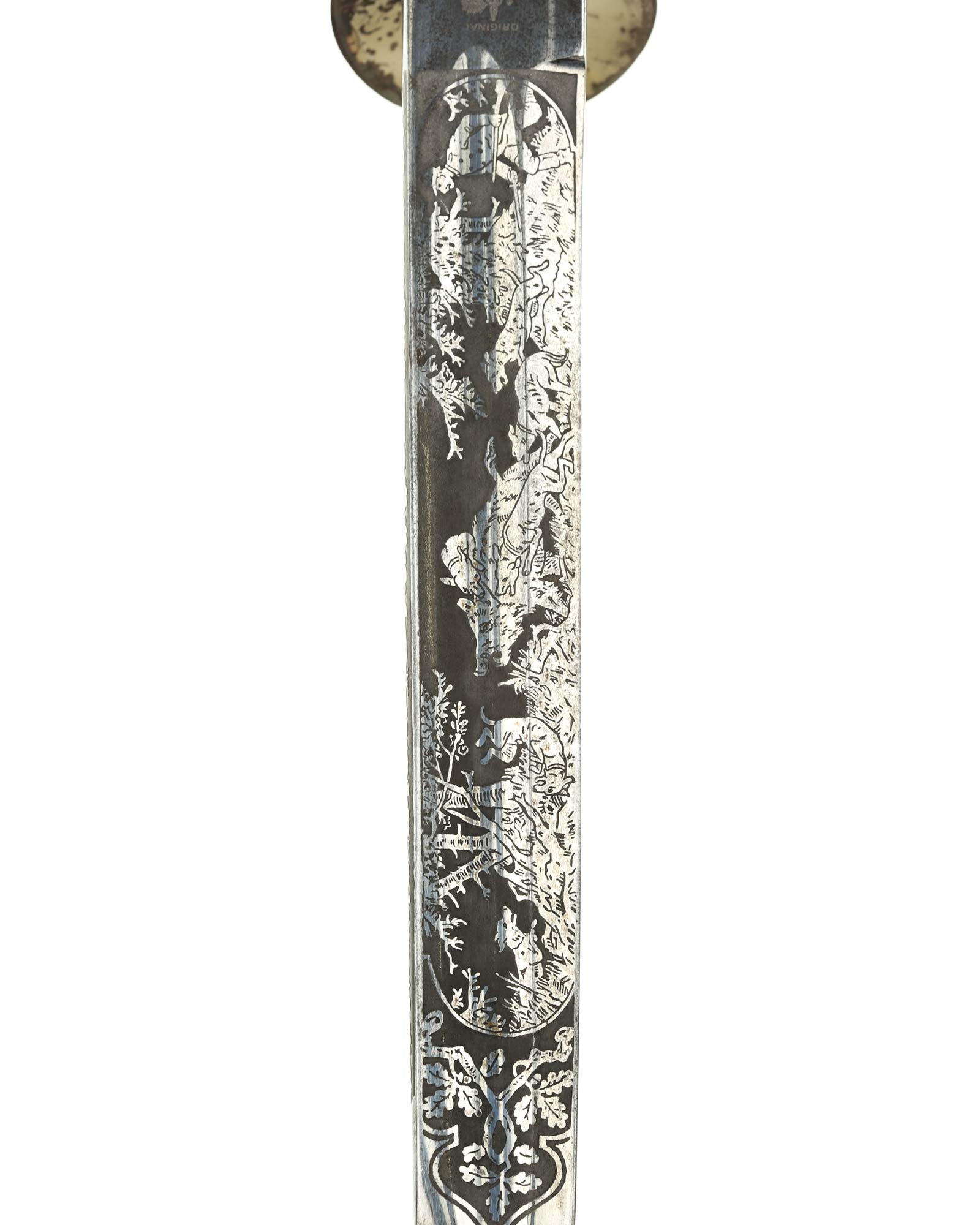 Кинжал охотничий Хиршфангер (нем. Deutscher Jägerverband (DJV) Hirschfänger). Кинжал с клеймом Original Eickhorn Solingen (Карл Айкхорн Золинген). Рукоять роговая, крепится на черенке клинка всадным способом. Навершие рукояти стальное, овальной формы, плоское, с декоративным винтом. Перекрестье рукояти стальное в виде стилизованных кабаньих копыт направленных в разные стороны. В центре перекрестья с одной стороны закреплен декоративный щитик, выполненный в форме раковины. Клинок стальной, прямой, двухлезвийный, ромбического сечения, без долов, у пяты плоский, с двух сторон богато украшен травлением со сценами охоты на кабана и оленя. На пяте клинка с обратной стороны имеется клеймо известной фирмы - Карл Айкхорн, г. Золинген, характерное для продукции, выпускаемой данным производителем в период с 1941-1945 гг. Обух клинка практически на всю длинну украшен орнаментом из дубовых листьев и именем бывшего владельца. Ножны деревянные, обтянуты темной кожей, со стальным прибором, состоящим из устья со шпеньком в виде желудя и наконечника. Внутри устья для дополнительной фиксации вставлена стальная распорка-фиксатор.