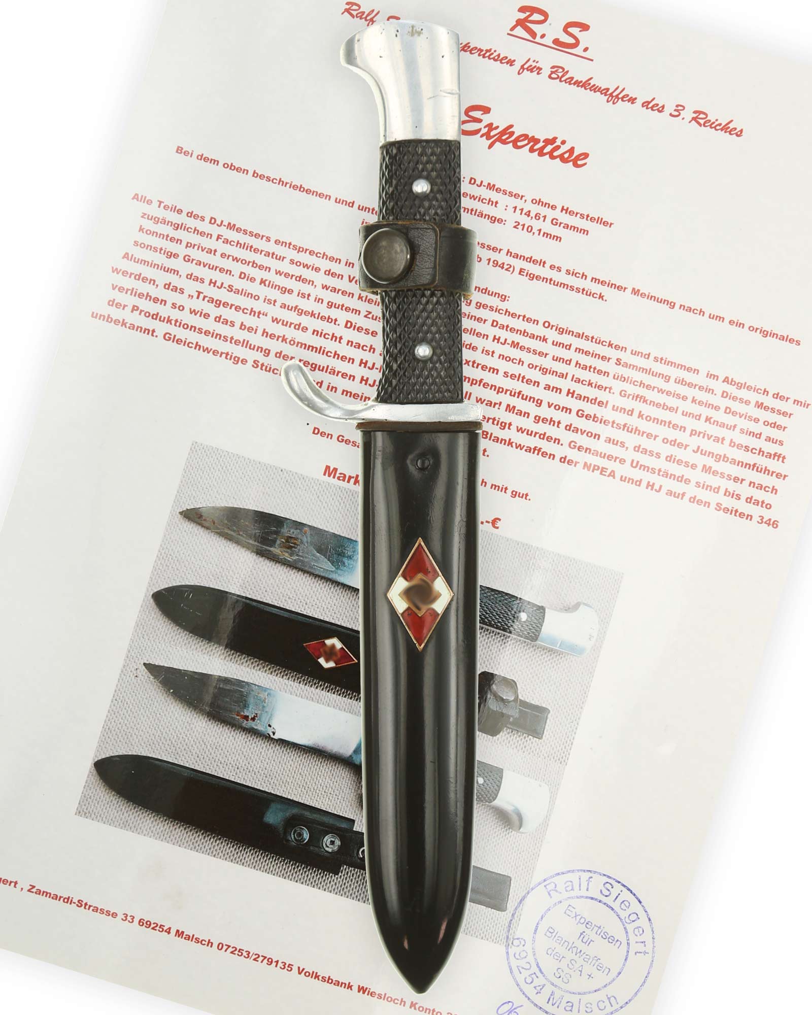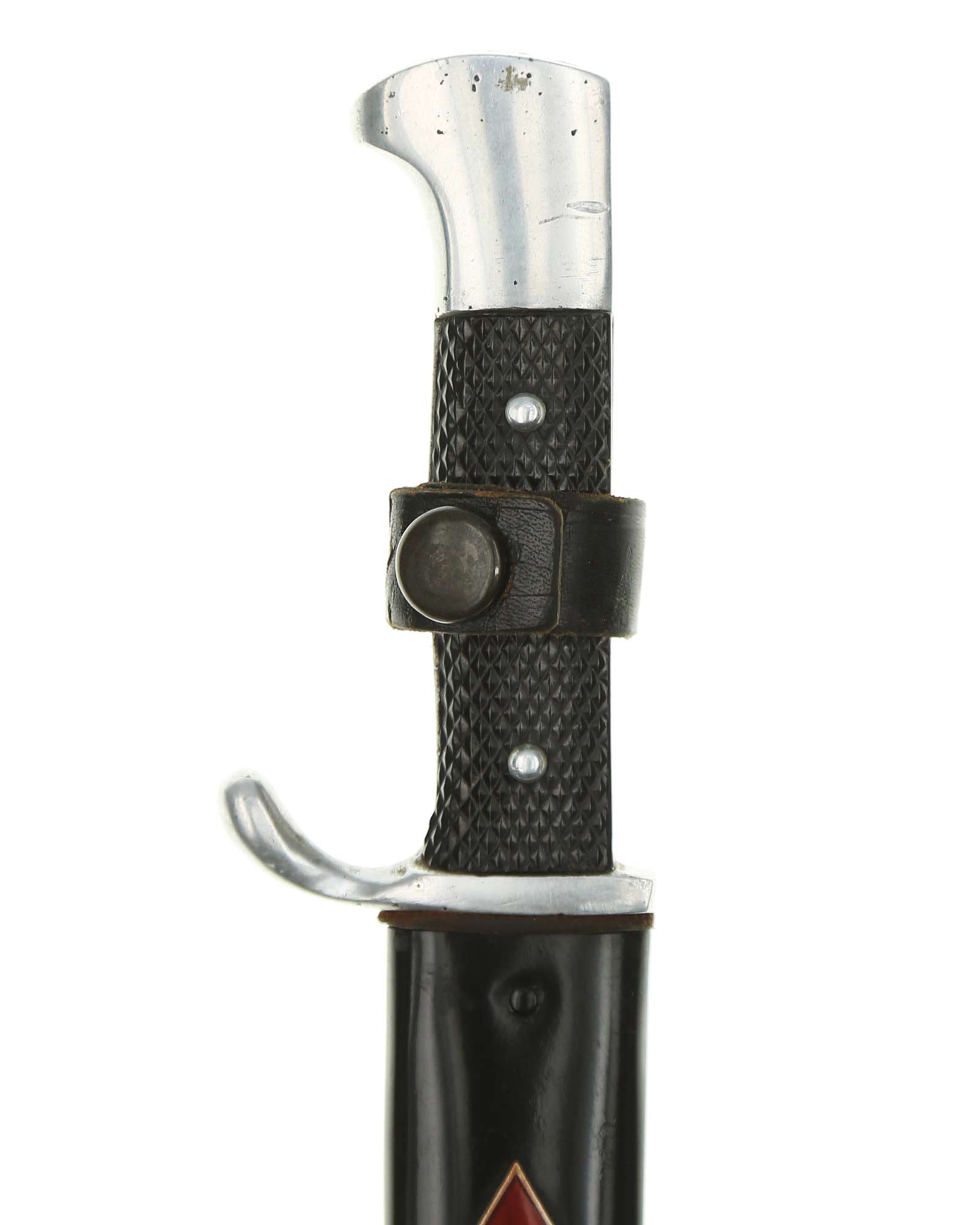 Ножны: Ножны изготовлены из окрашенной в черный цвет стали. На лицевой стороне в центре эмблема организации «Гитлерюгенд» (также HJ-ромб).. Для плотного удержания клинка изнутри расположены две пружины, прикрепленные с помощью заклепок к внутренней стороне ножен. Устройство для ношения состоит из петли, состоящей из двухслойной кожаной ленты, крепящейся к ножнам двумя заклепками. В верхней части подвеса имеется ремешок, обращенный наружу, прикрепленныйс помощью заклепки, закрывающияся кнопкой.