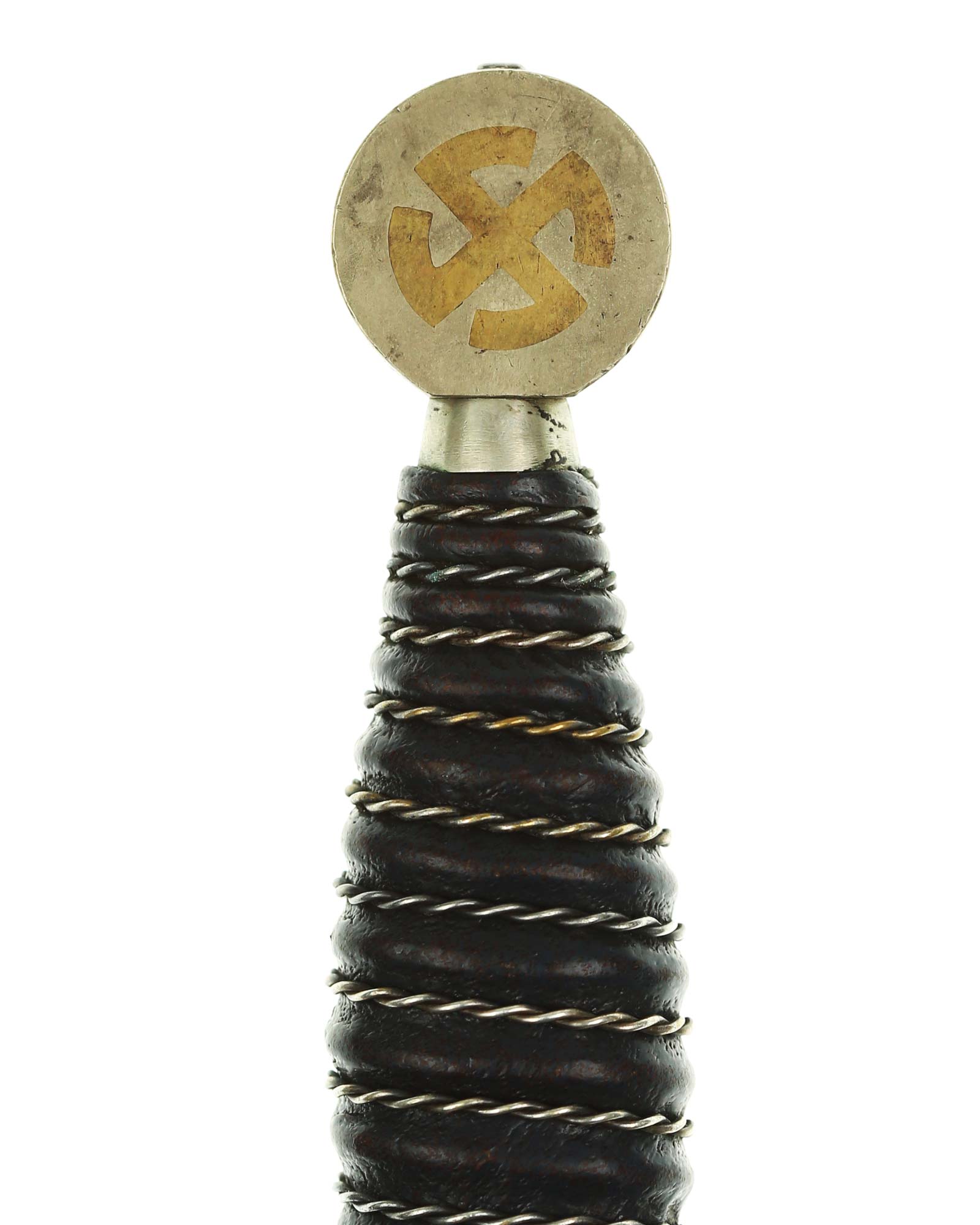 Рукоять: Рукоять деревянная, бочкообразная, покрытая темносиней кожей. Нижняя гайка цилиндрическая, верхняя гайка коническая и составляет одно целое с круглой плоской головкой, навинчивающейся на хвостовик клинка. На обеих сторонах головки имеются вписанные в круг медные свастики. Крестовина литая, в виде трех наложенных друг на друга дужек, с загнутыми вниз концами. На перекрестье с обеих сторон на круглых медальонах имеется уменьшенное изображение свастики, как на головке. Под перекрестьем расположена массивная овальная шайба, отлитая вместе с крестовиной. Все металлические детали эфеса изготавливались из мельхиора с серебряным покрытием.