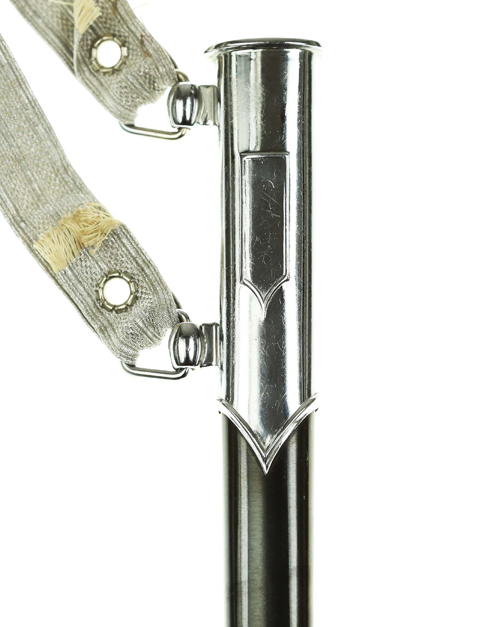 Ножны: из металла, вороненые. Прибор ножен из латуни, длинного устья и наконечника с шариком. Устье и наконечник с рельефными краями острой формы. На устье находится рельефное изображение государственного герба ГДР и рисунком в виде дубового листа с желудем. Прикрепляется пара подвижных колец в форме трапеции для крепления ремней портупеи.