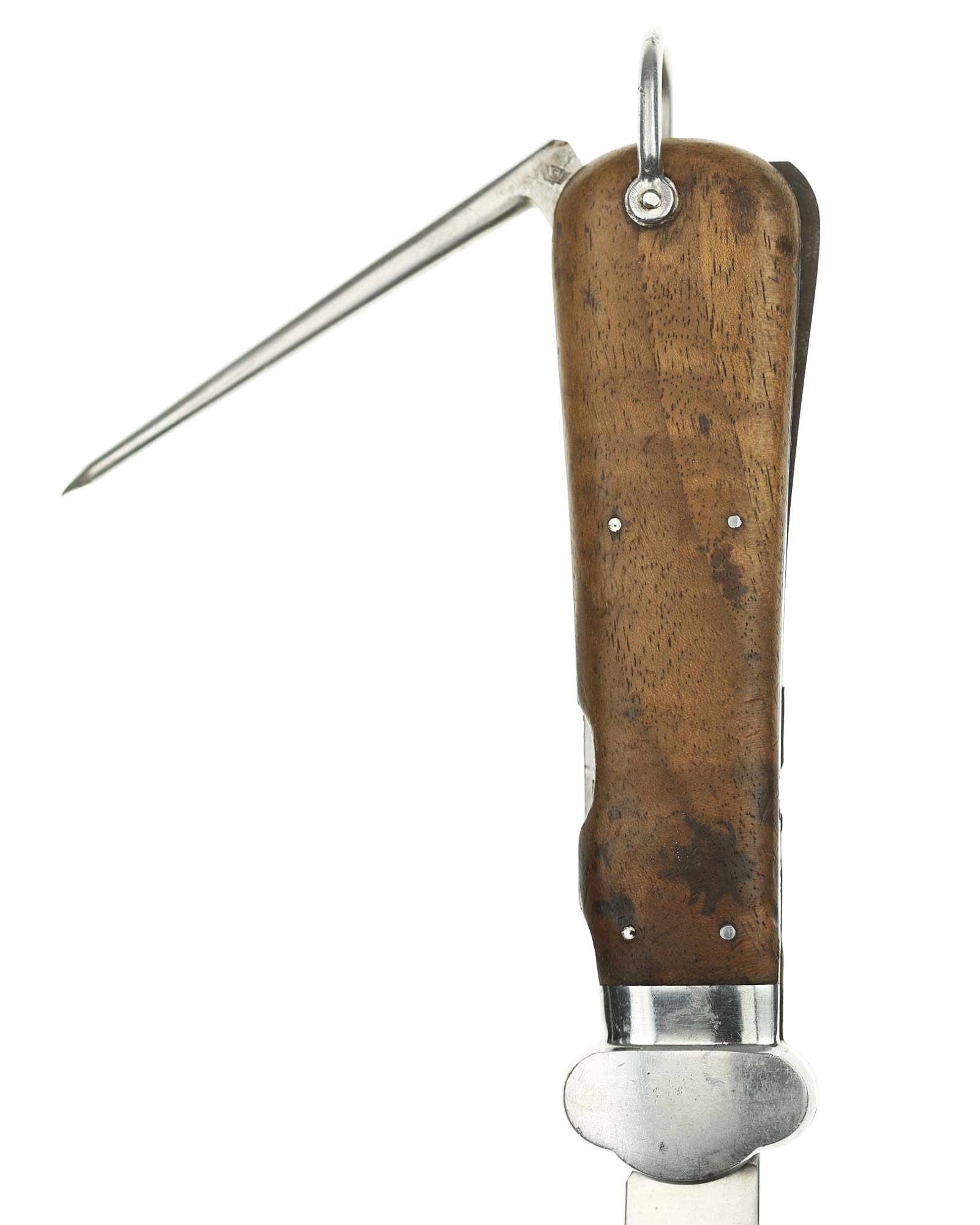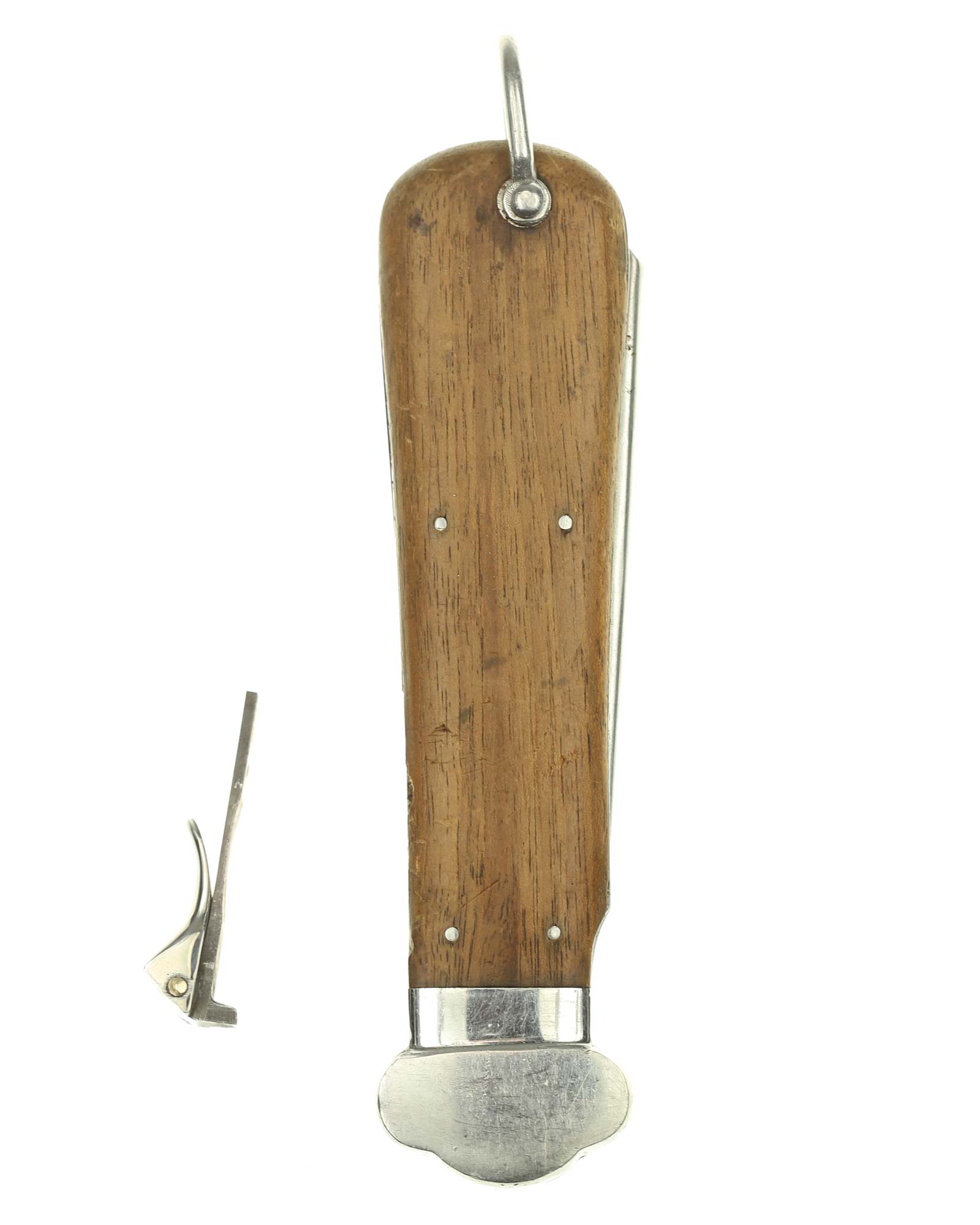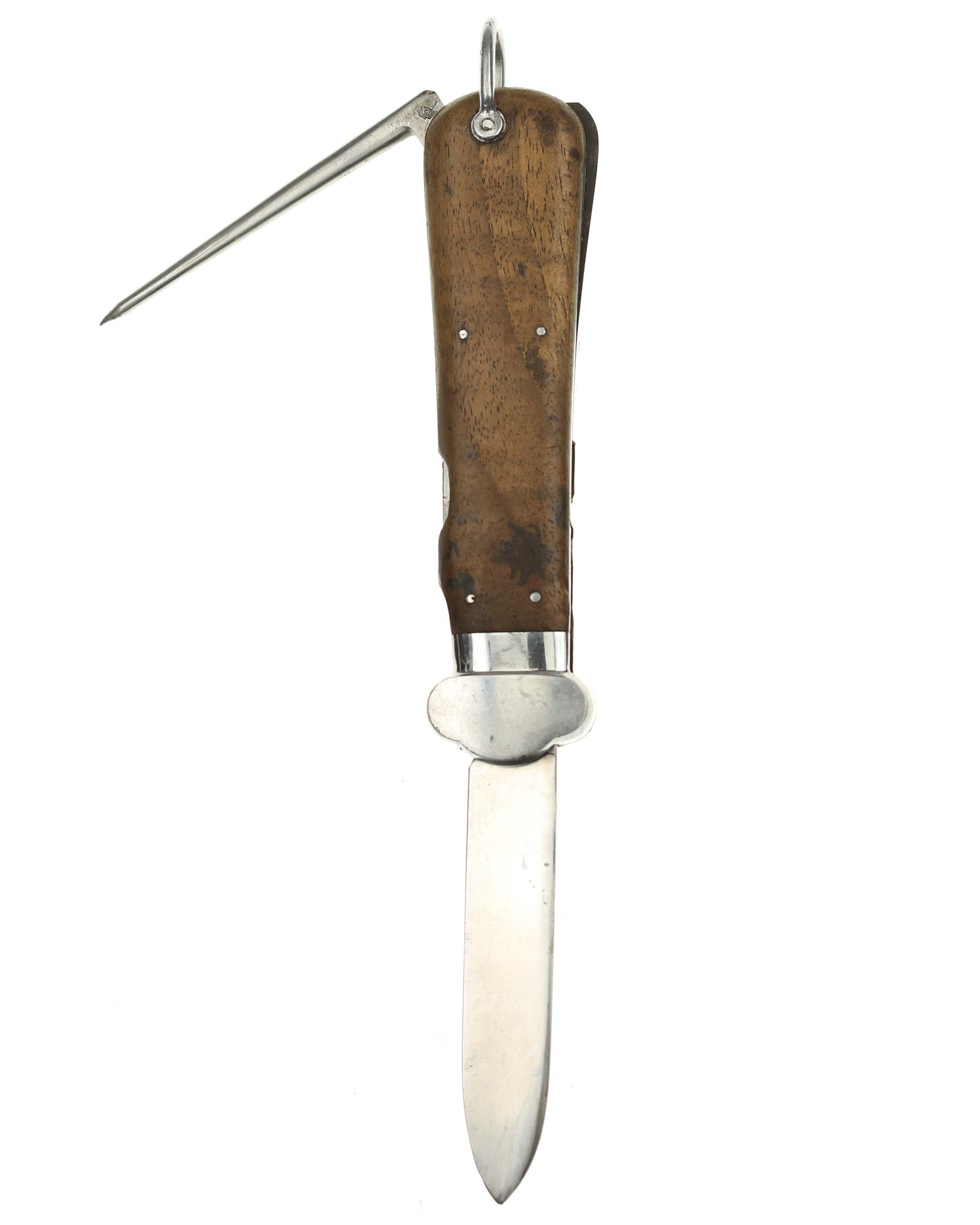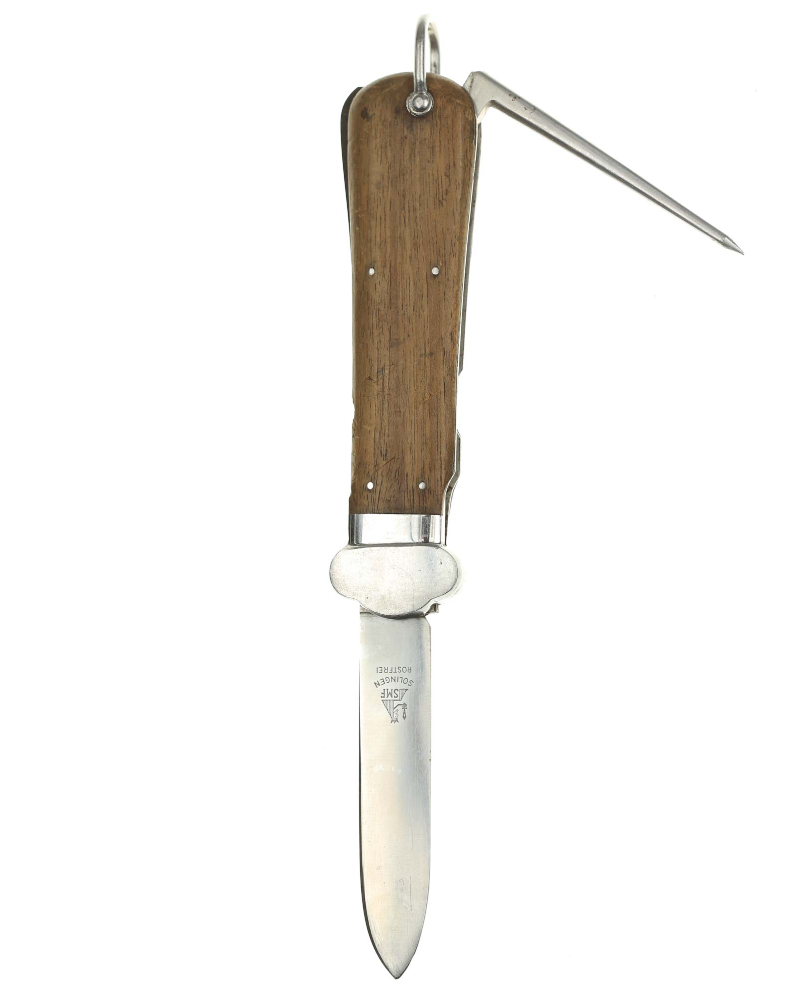 Складной нож-стропорез, изготовленный специально для парашютно-десантных войск Германии периода Третьего рейха. Клинок ножа стальной, прямой, однолезвийный. Щечки рукояти изготовлены из ореха. Стропорез снабжен фиксатором, удерживающим лезвие внутри рукояти (оно выезжает под силой собственной тяжести - достаточно отжать фиксатор до упора и встряхнуть). Имеется также стальное складывающееся шило для распутывания строп.