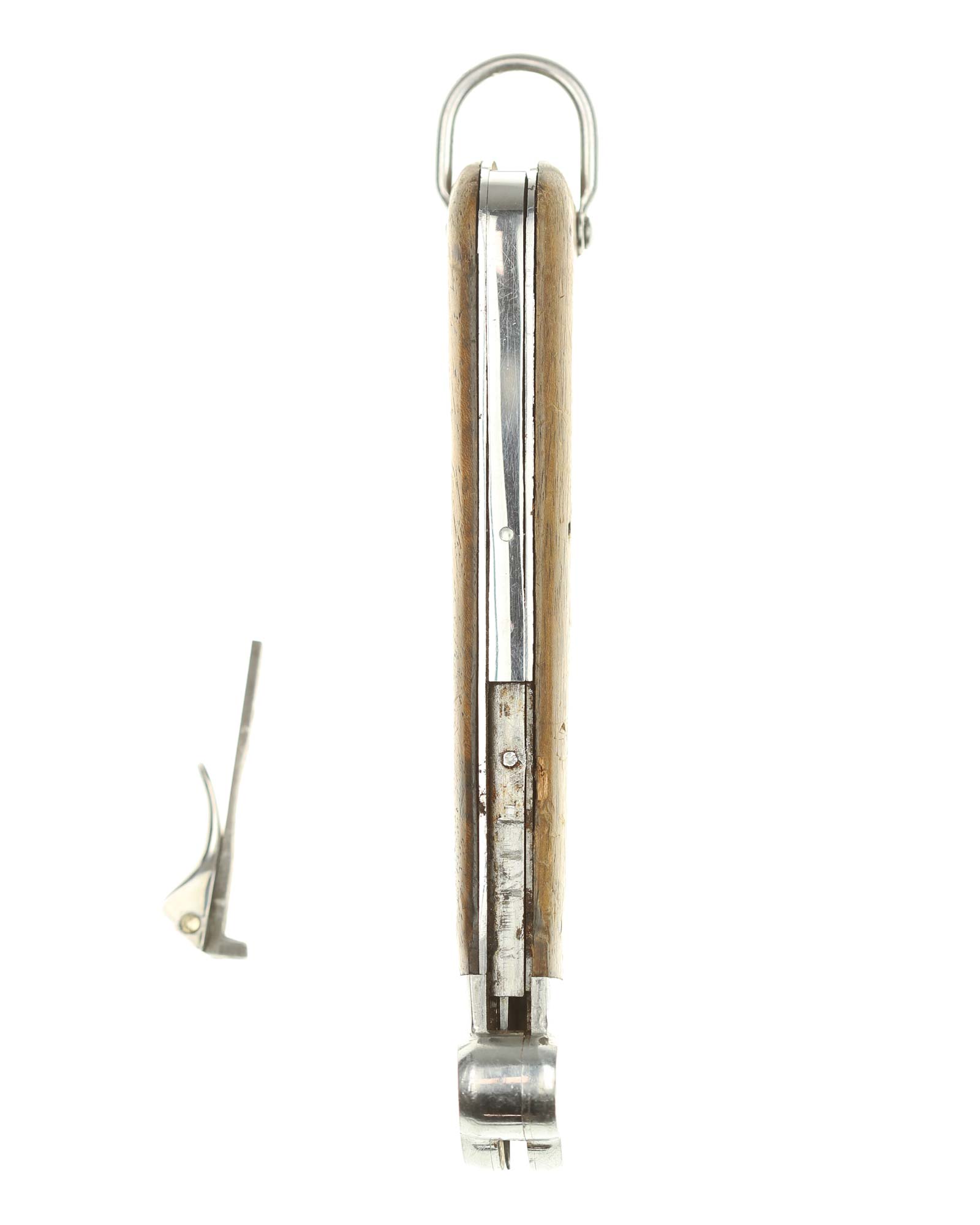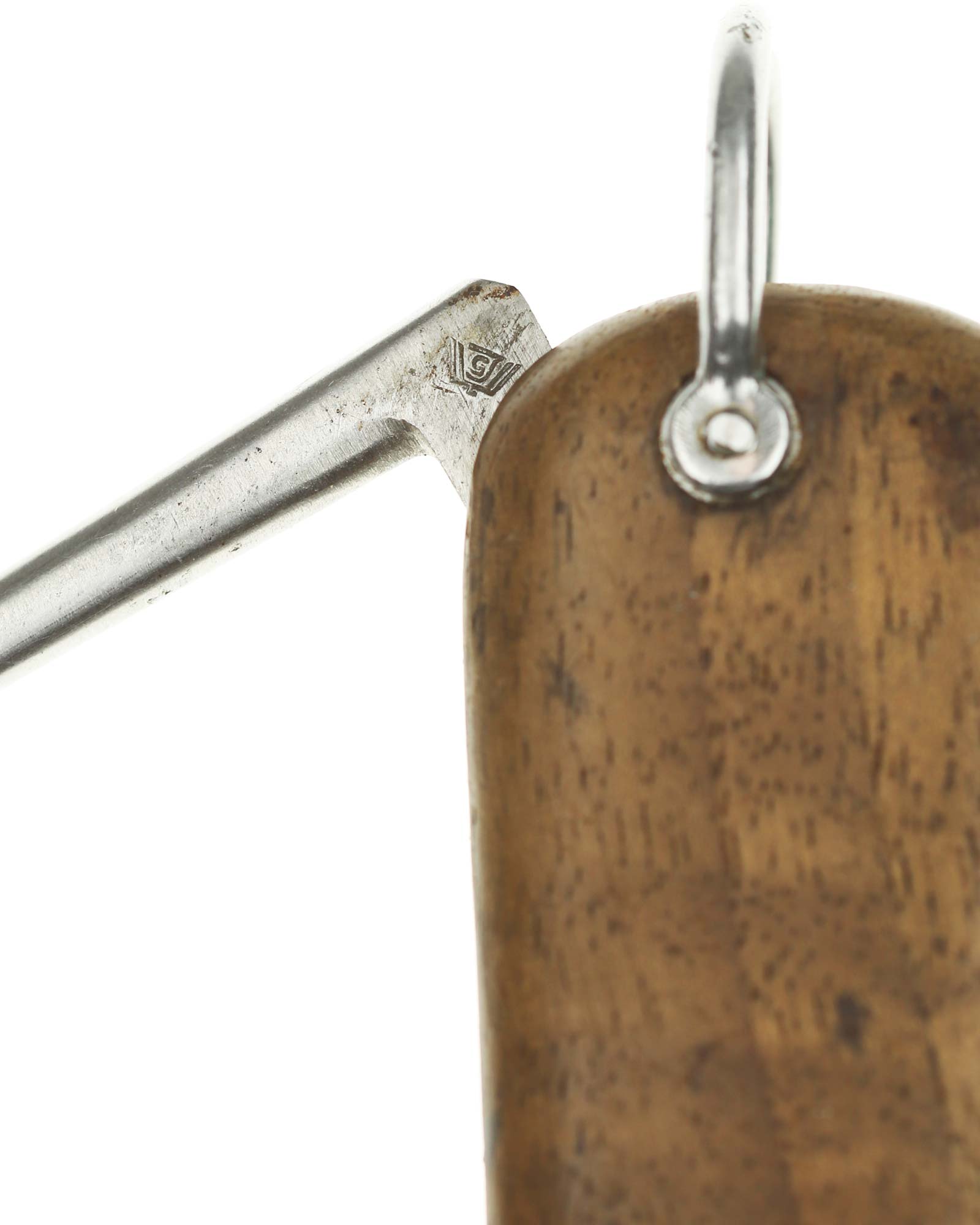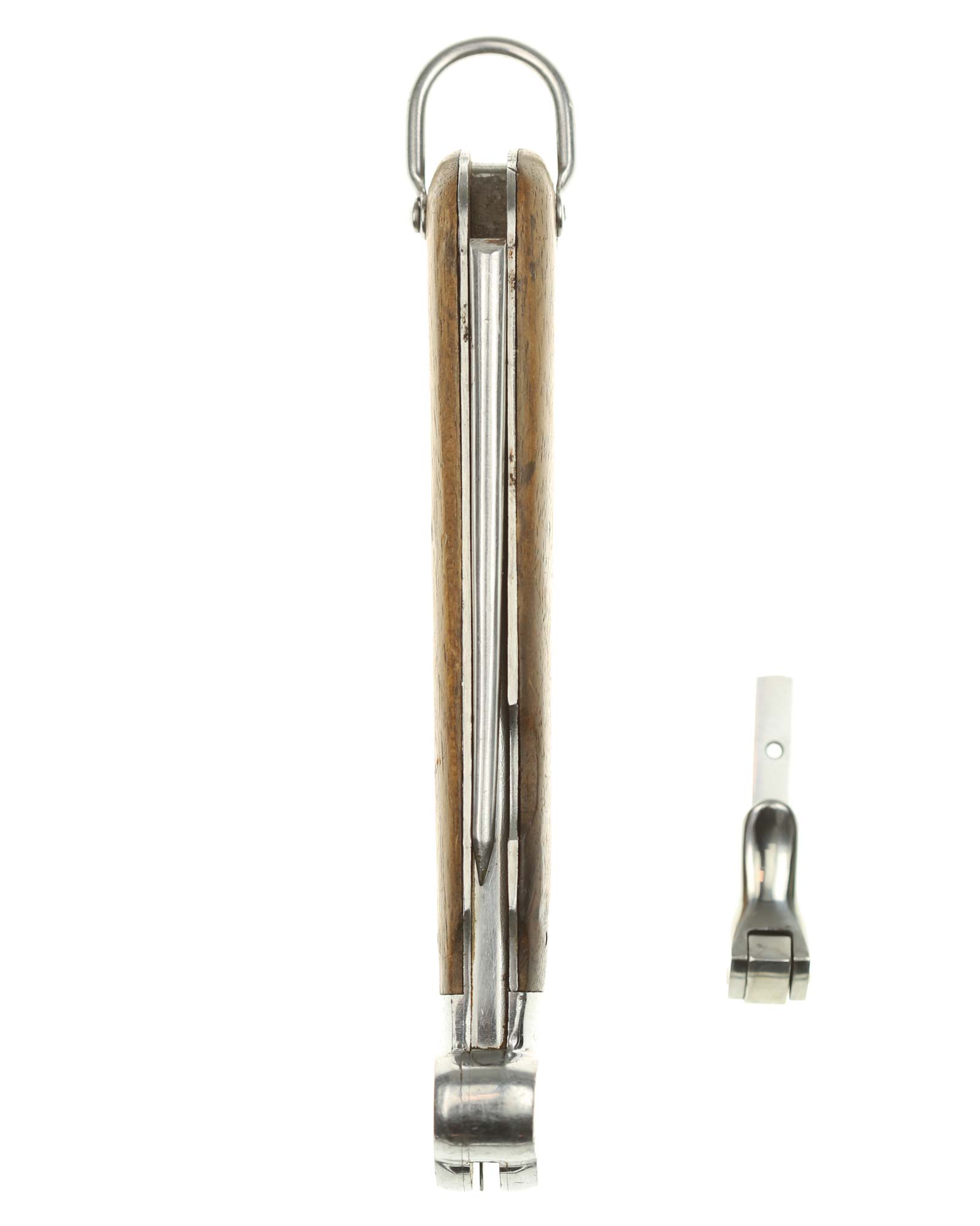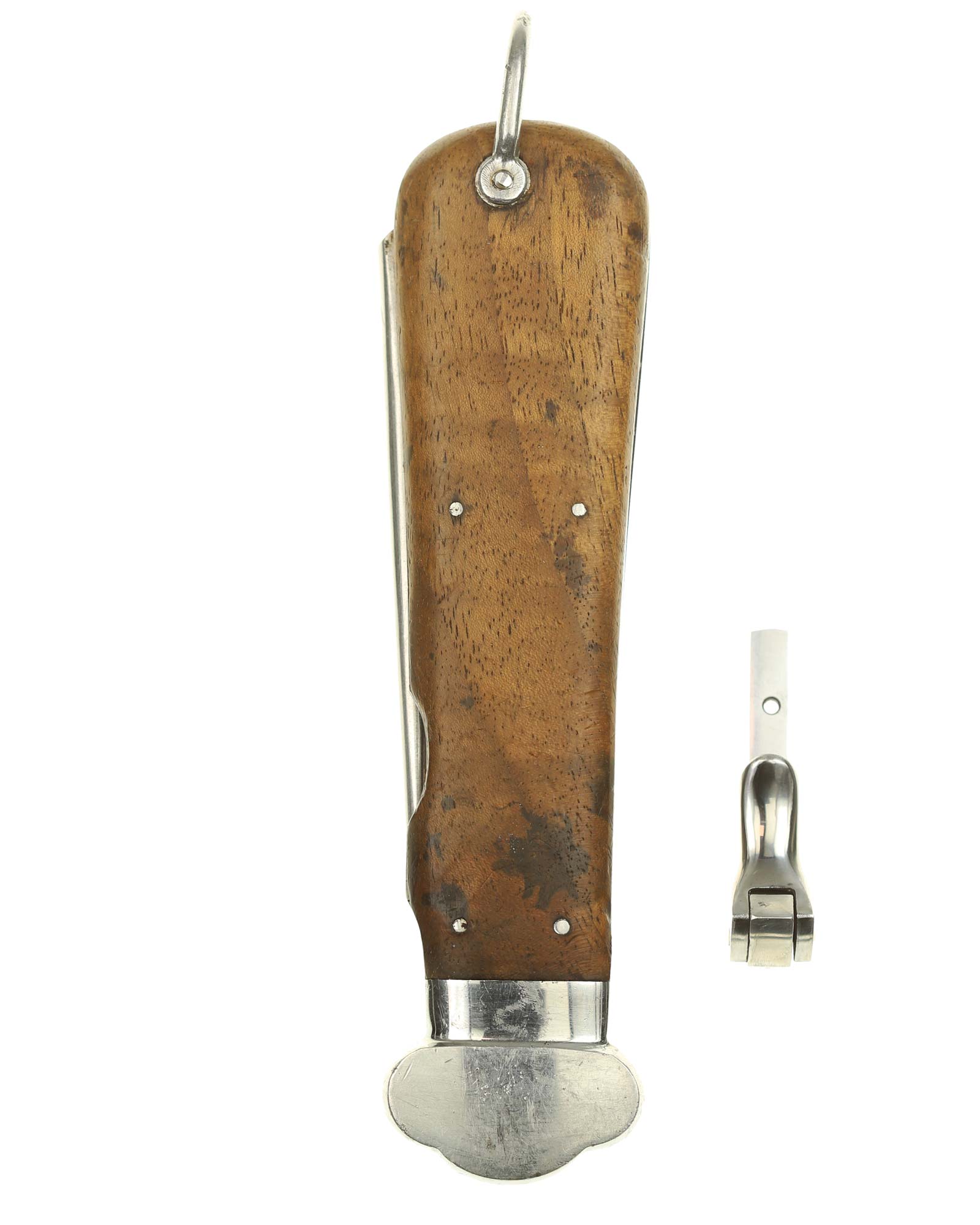 Складной нож-стропорез, изготовленный специально для парашютно-десантных войск Германии периода Третьего рейха. Клинок ножа стальной, прямой, однолезвийный. Щечки рукояти изготовлены из ореха. Стропорез снабжен фиксатором, удерживающим лезвие внутри рукояти (оно выезжает под силой собственной тяжести - достаточно отжать фиксатор до упора и встряхнуть). Имеется также стальное складывающееся шило для распутывания строп.