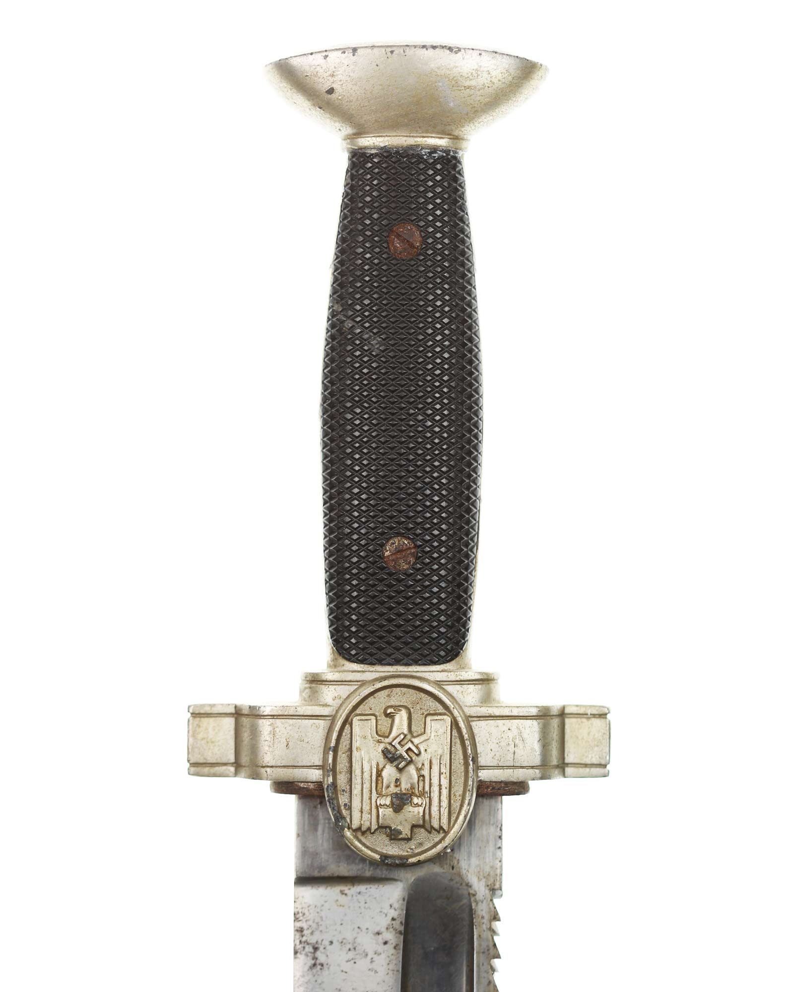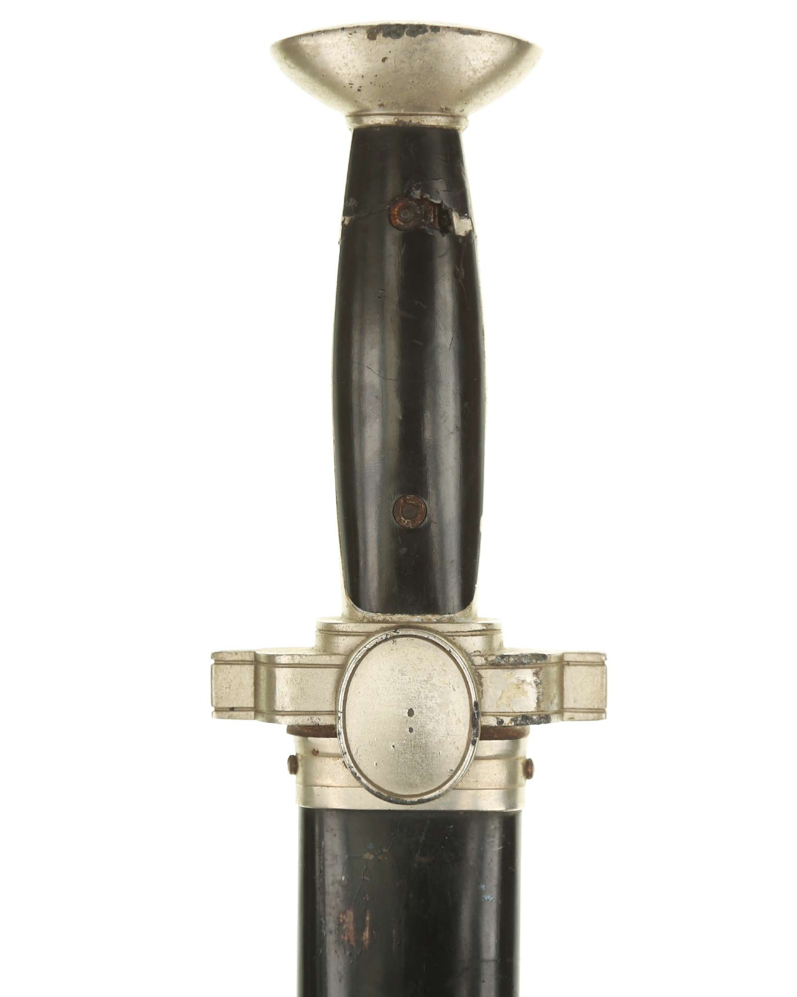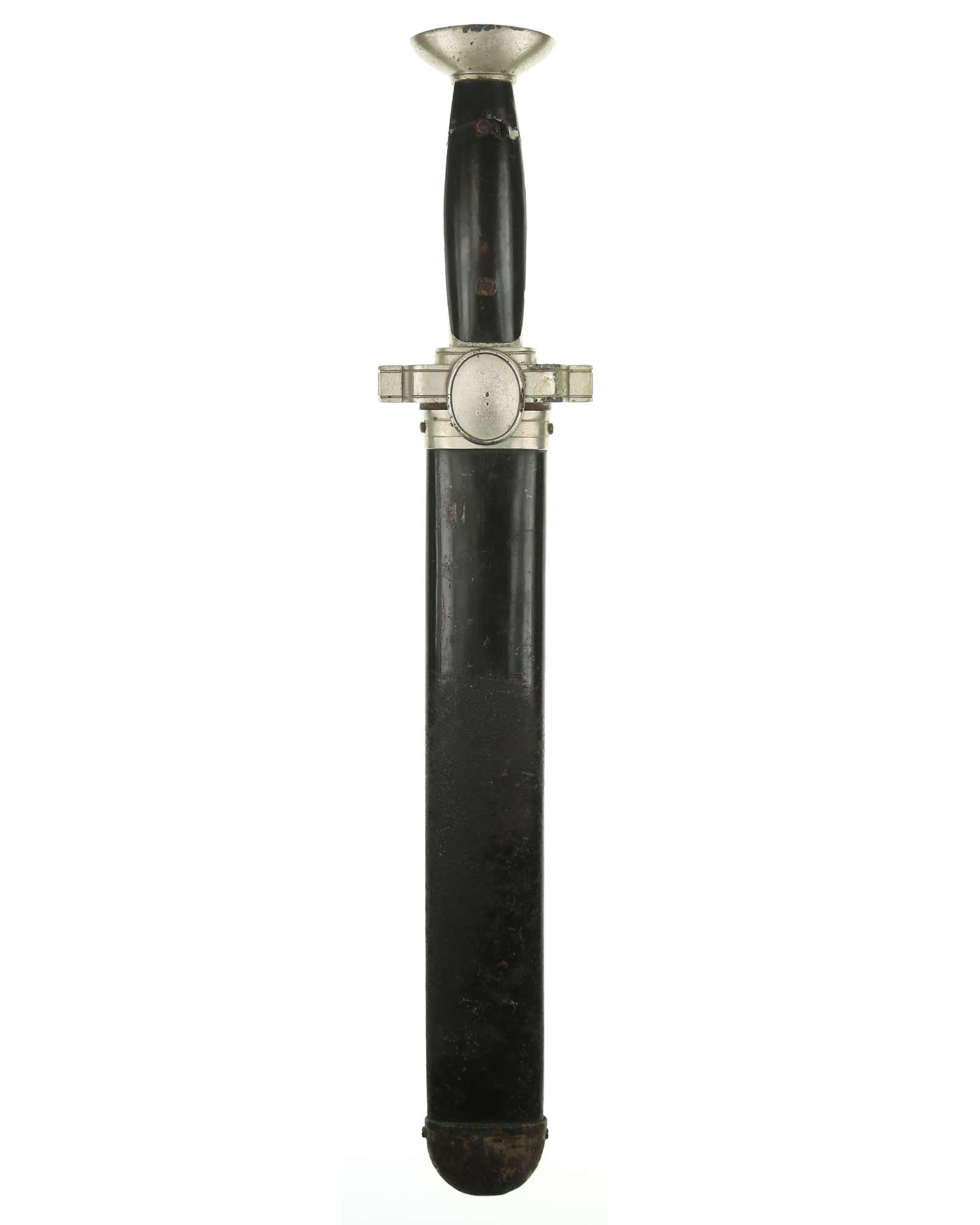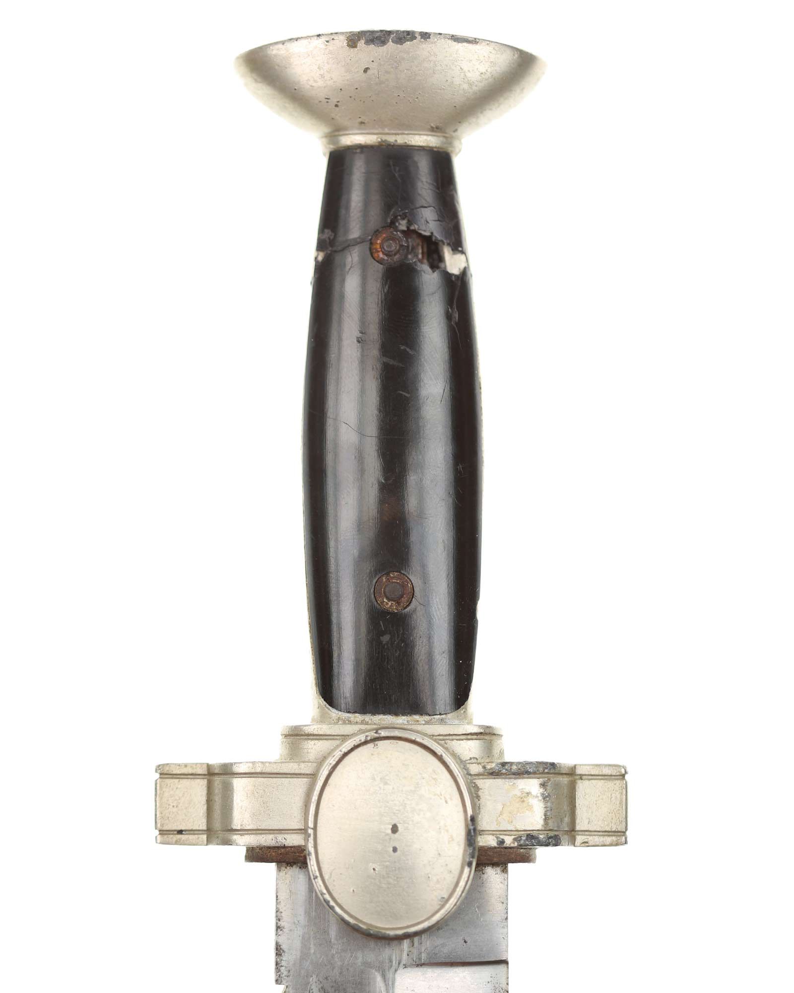 Рукоять: Рукоять металлическая, с двумя накладными пластиковыми щечками, одна из которых покрыта перекрестными насечками, другая – гладкая. Щечки закреплены при помощи двух винтов. Навершие рукояти выполнено в форме трапеции. Крестовина рукояти металлическая, прямая, с декоративными щитиками, на одном из которых отлито рельефное изображение эмблемы германского Красного Креста в виде орла со свастикой в когтях и свастикой на груди.