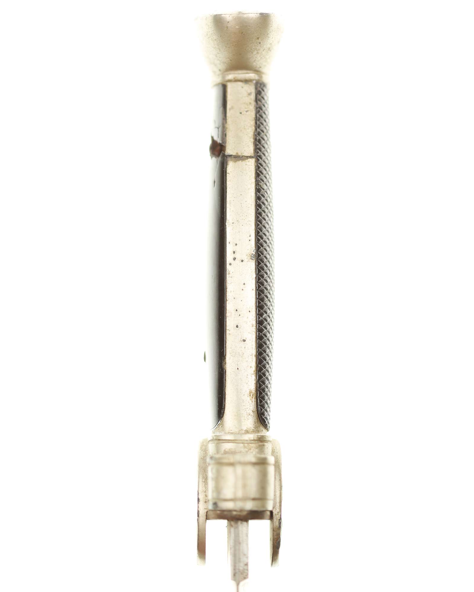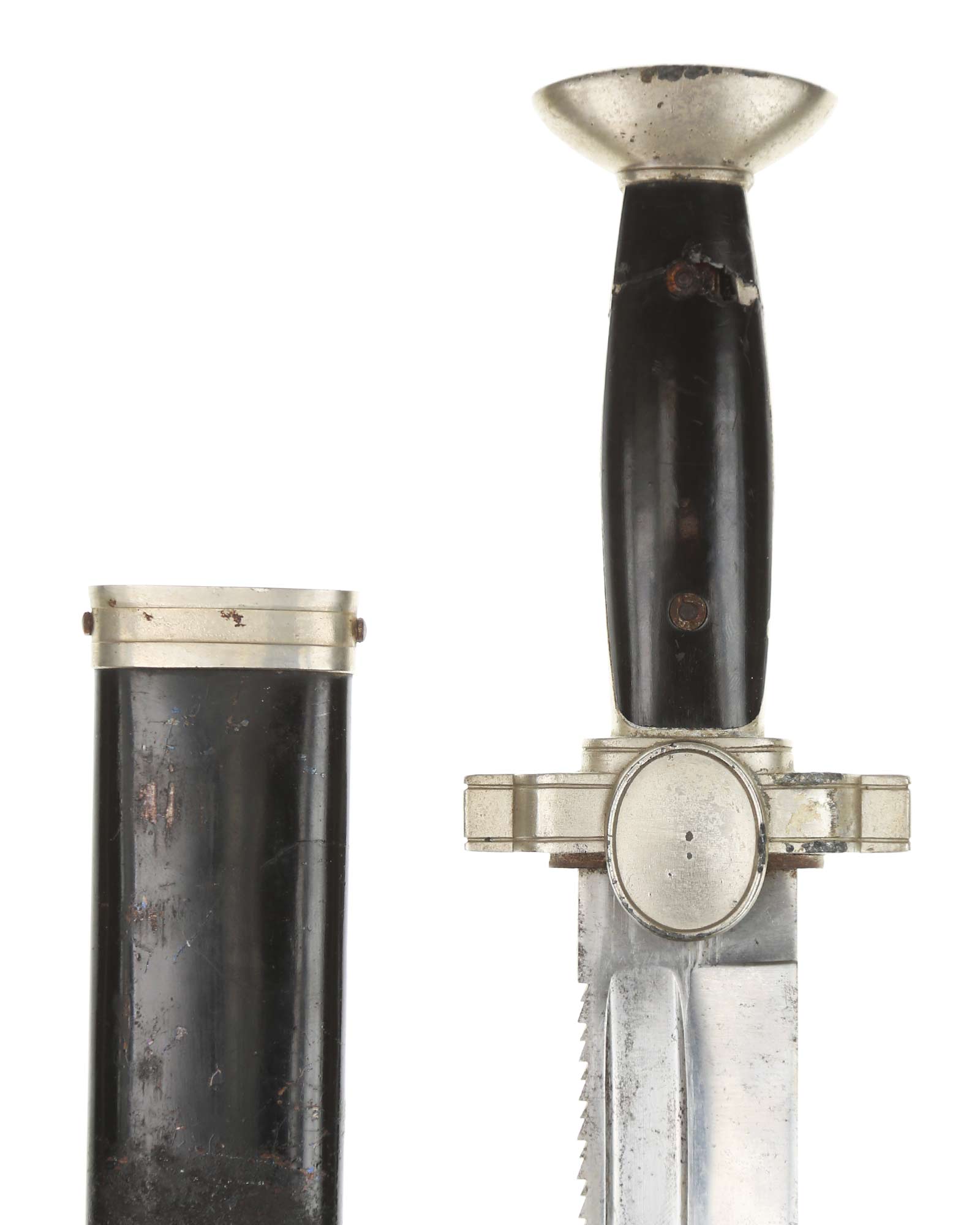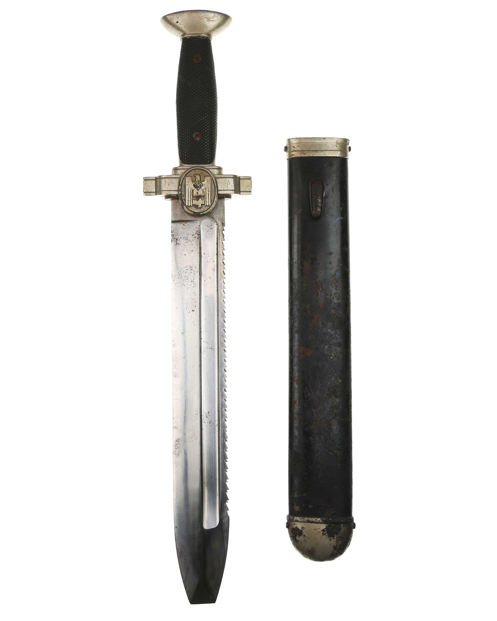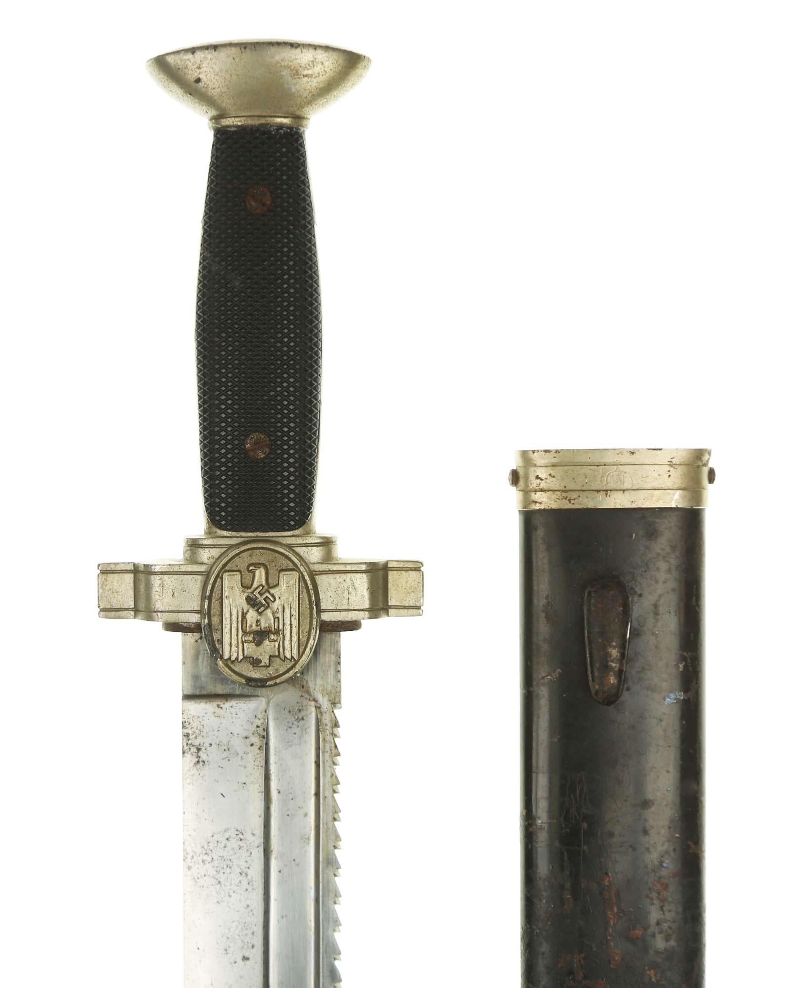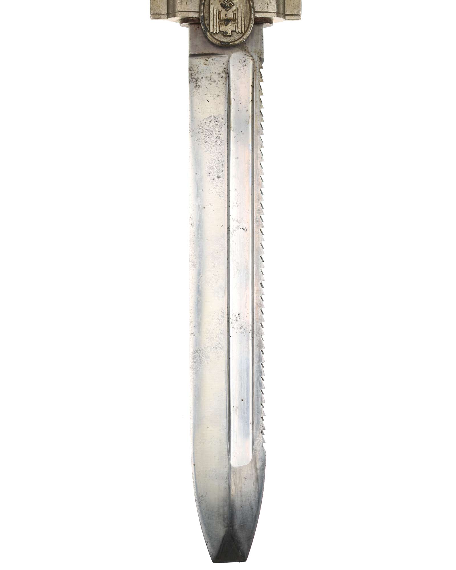 Рукоять: Рукоять металлическая, с двумя накладными пластиковыми щечками, одна из которых покрыта перекрестными насечками, другая – гладкая. Щечки закреплены при помощи двух винтов. Навершие рукояти выполнено в форме трапеции. Крестовина рукояти металлическая, прямая, с декоративными щитиками, на одном из которых отлито рельефное изображение эмблемы германского Красного Креста в виде орла со свастикой в когтях и свастикой на груди.