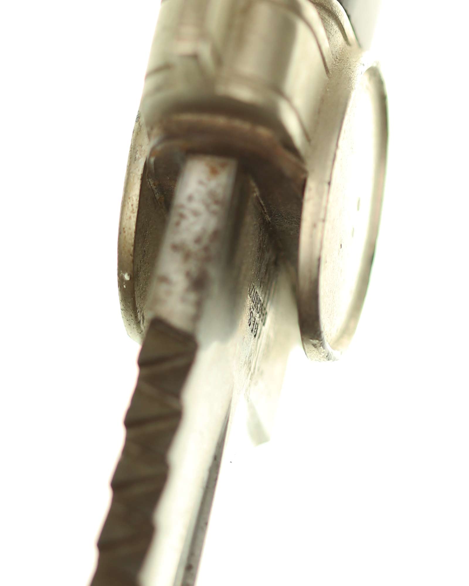 Клинок: Клинок прямой, стальной, однолезвийный, с одним долом и пилой на обухе. Боевой конец срезан.