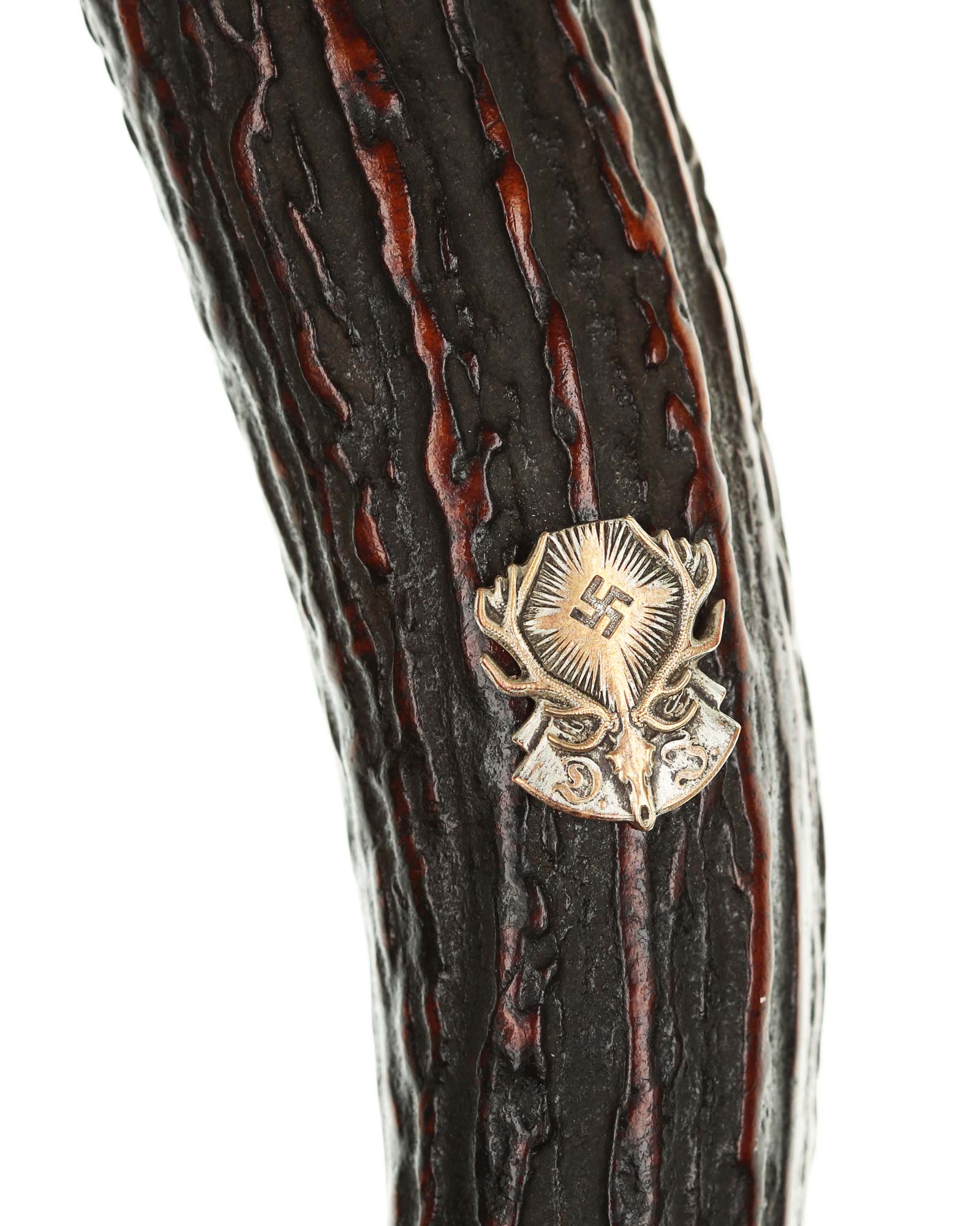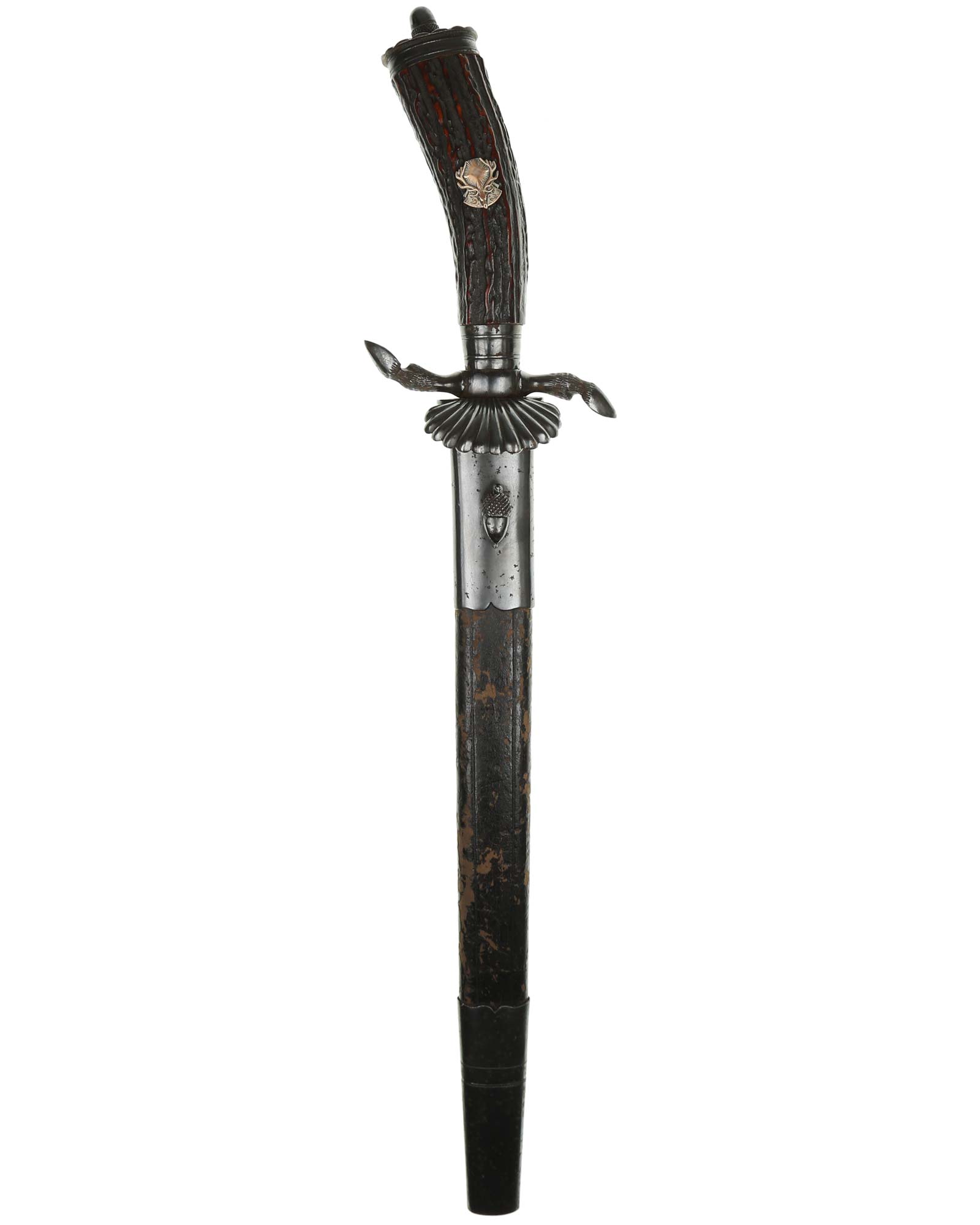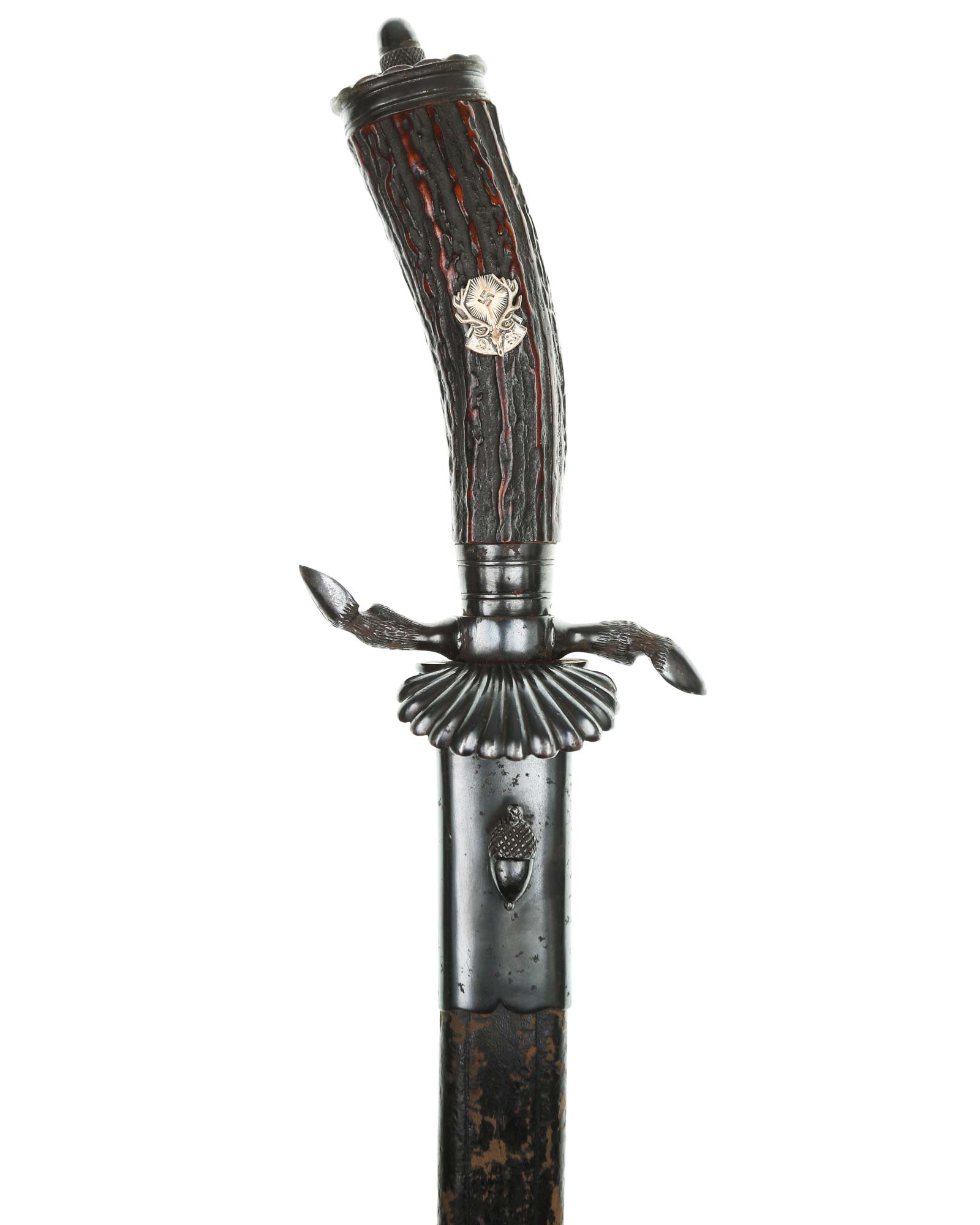 Рукоять: Рукоять роговая, крепится на черенке клинка всадным способом. Навершие рукояти стальное, овальной формы, плоское, с декоративным винтом. Перекрестье рукояти стальное в виде стилизованных кабаньих копыт направленных в разные стороны. В центре перекрестья с одной стороны закреплен декоративный щитик, выполненный в форме раковины.