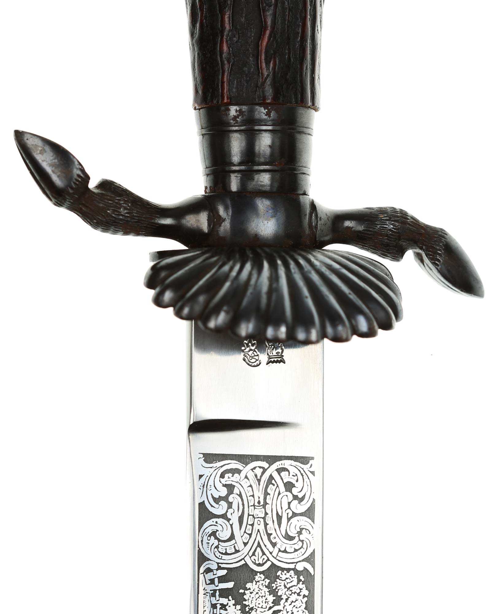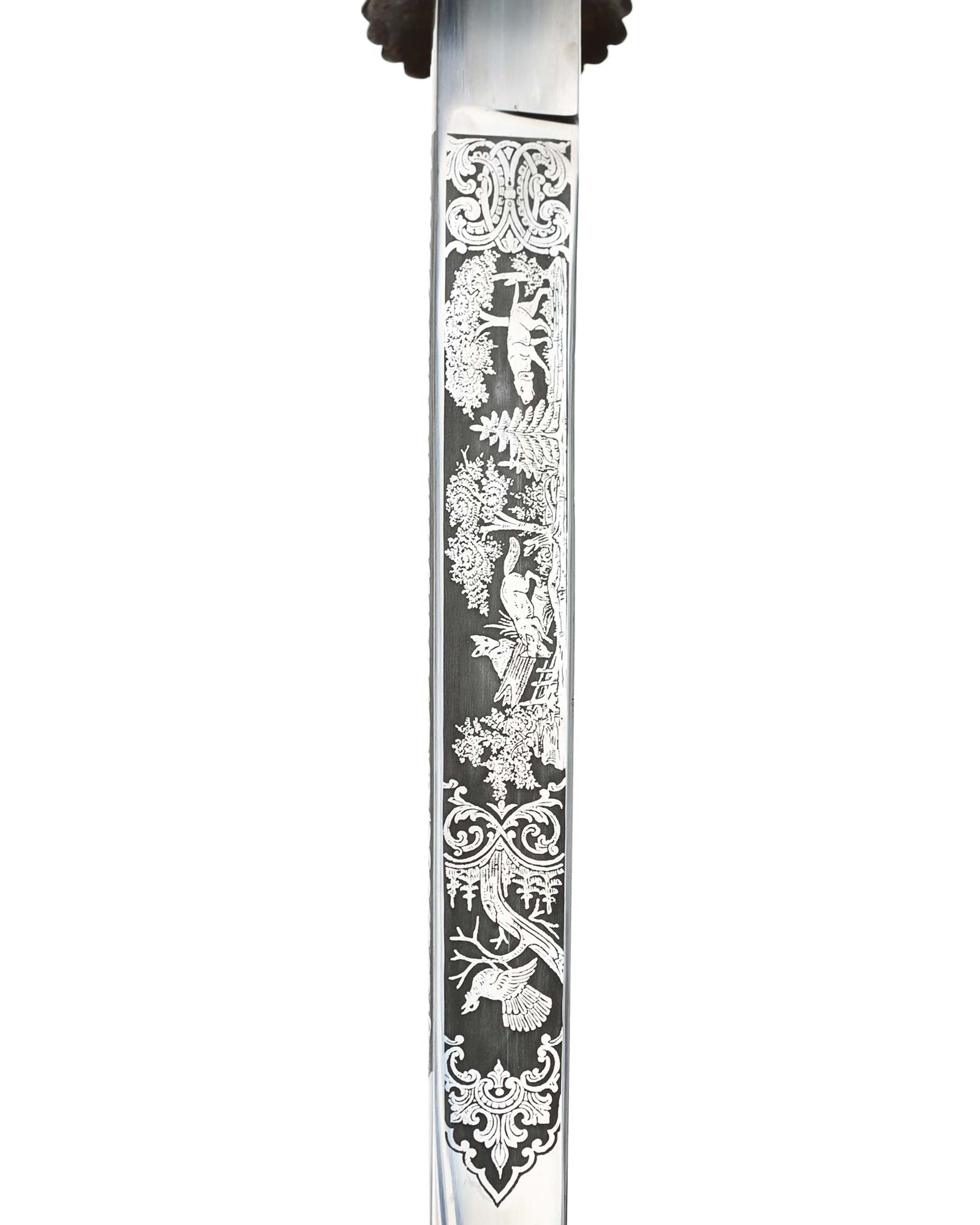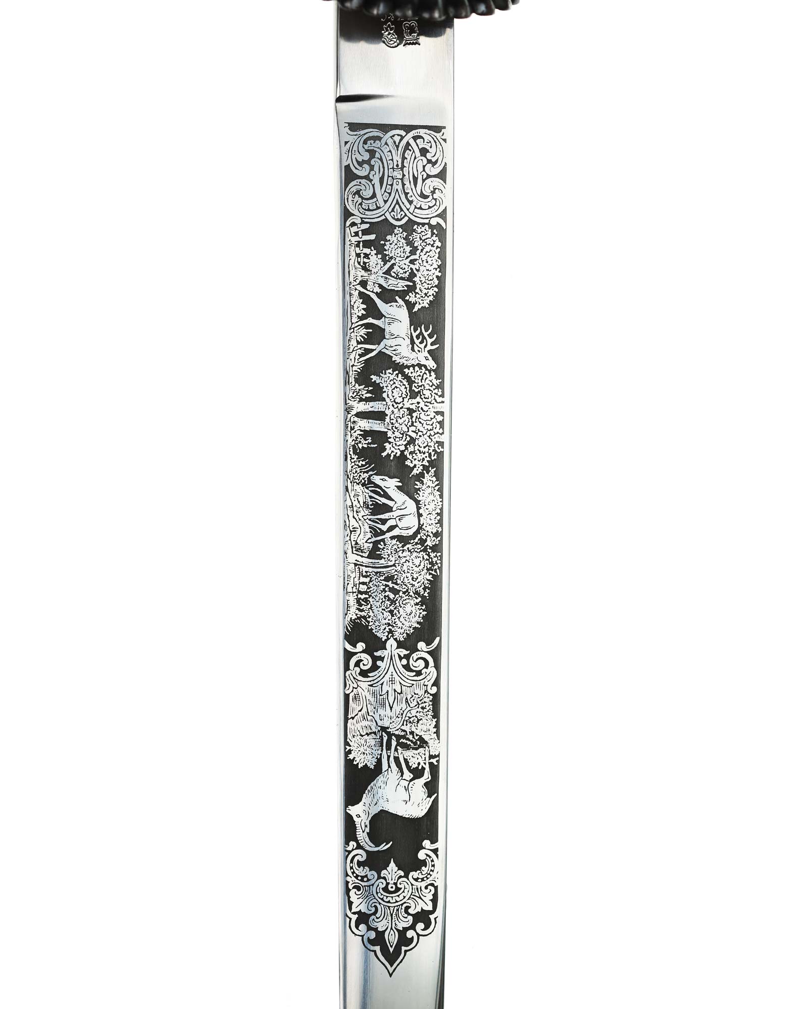 Клинок: Клинок прямой, стальной, двулезвийный, плоский, с двух сторон украшен травленым орнаментом с изображением охотничьих сцен.
