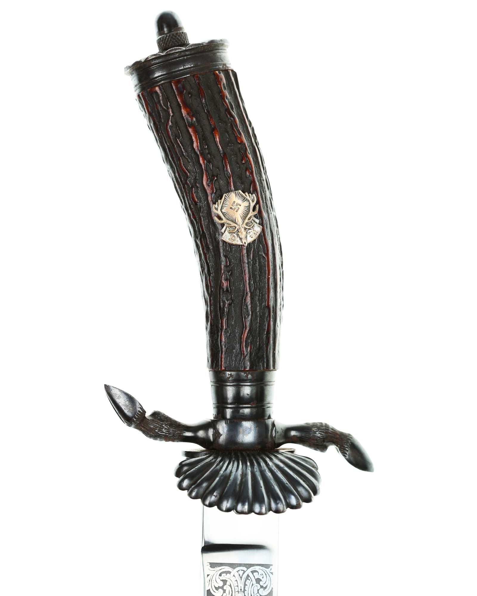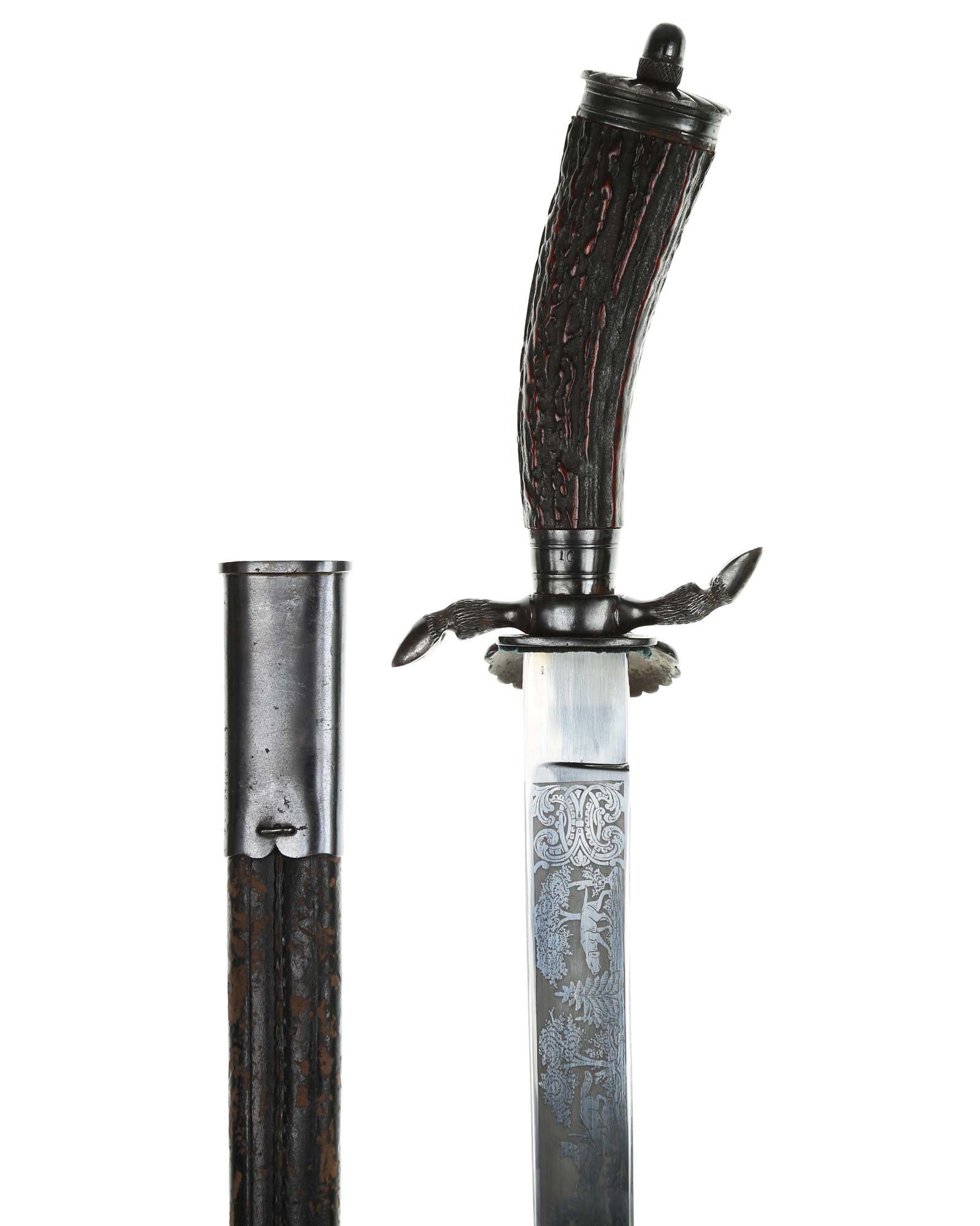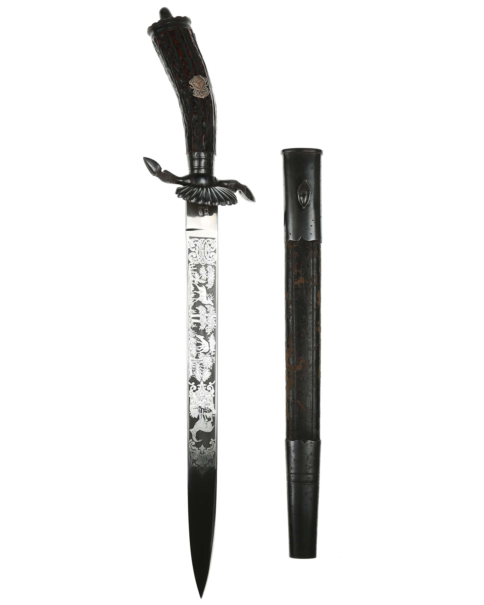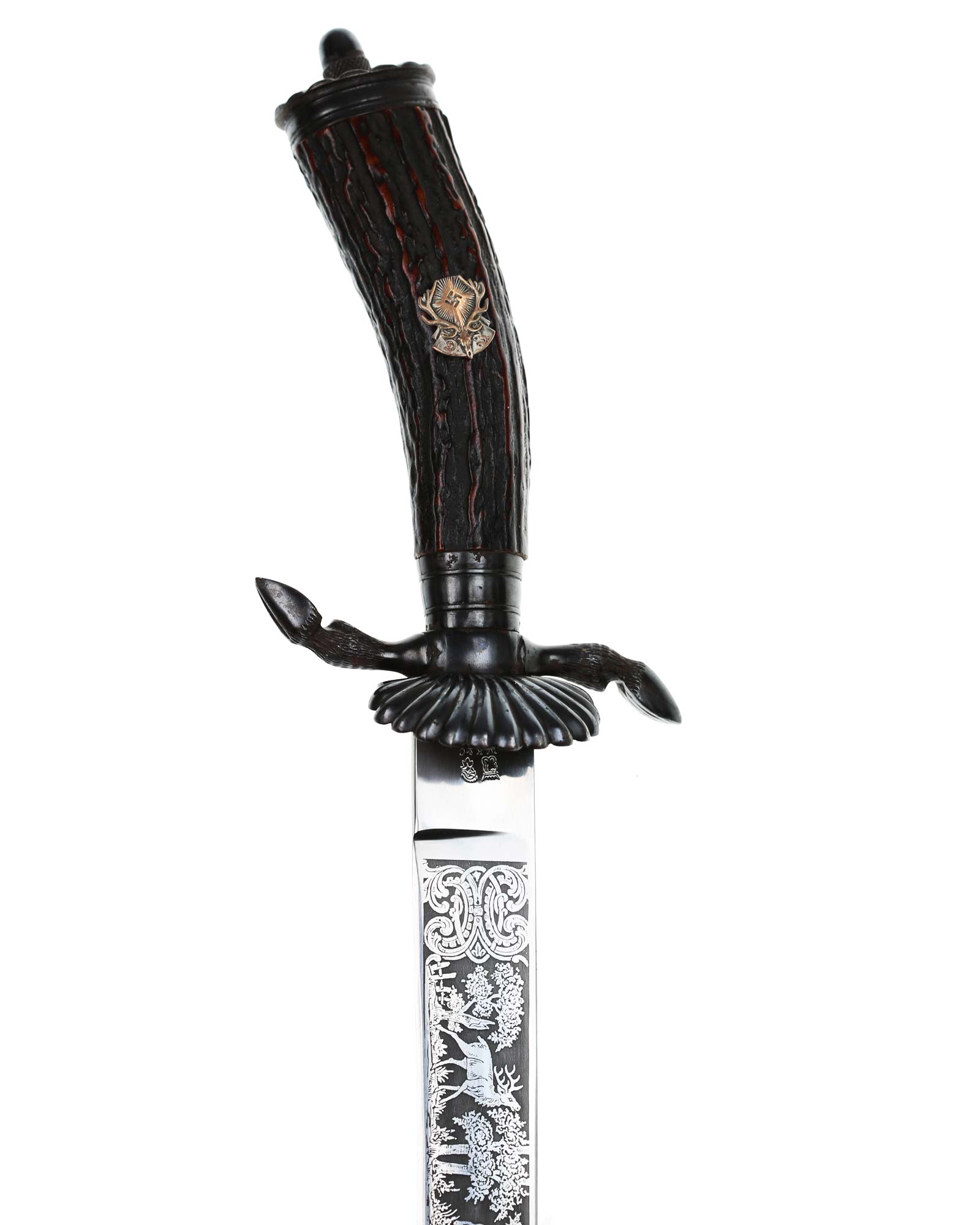 Клинок: Клинок прямой, стальной, двулезвийный, плоский, с двух сторон украшен травленым орнаментом с изображением охотничьих сцен.