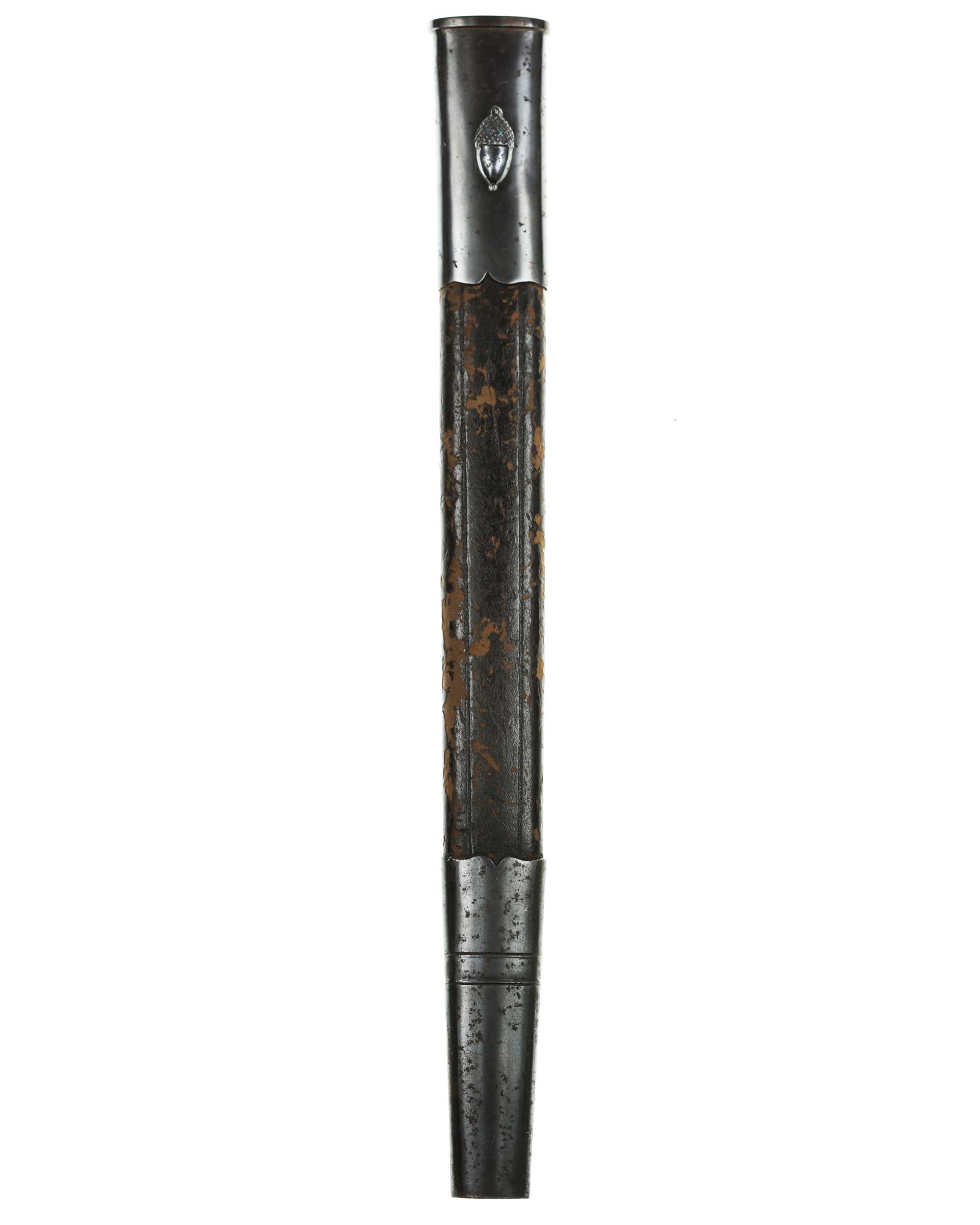 Ножны: Ножны обтянуты черной кожей. Прибор ножен состоит из устья со шпеньком и наконечника.