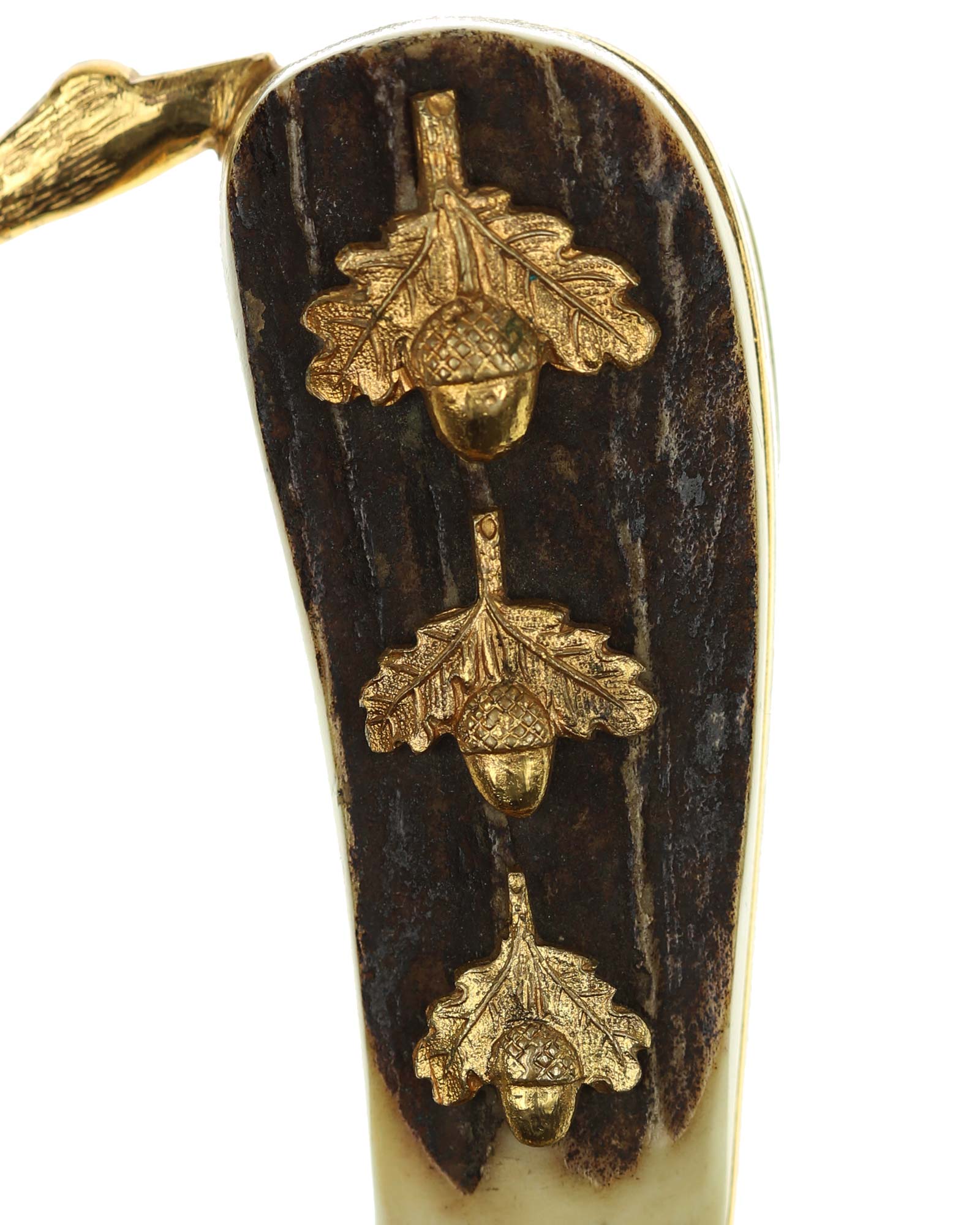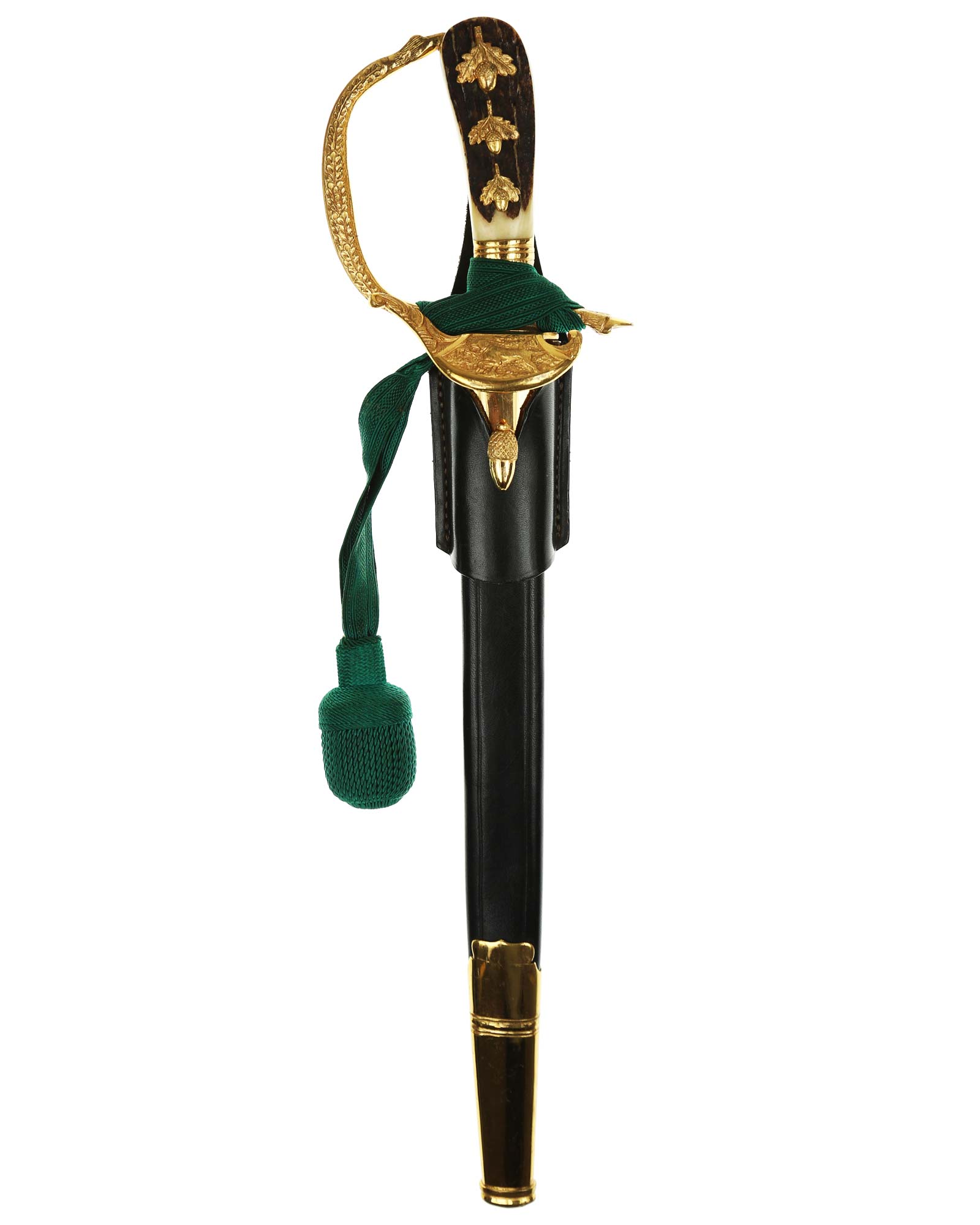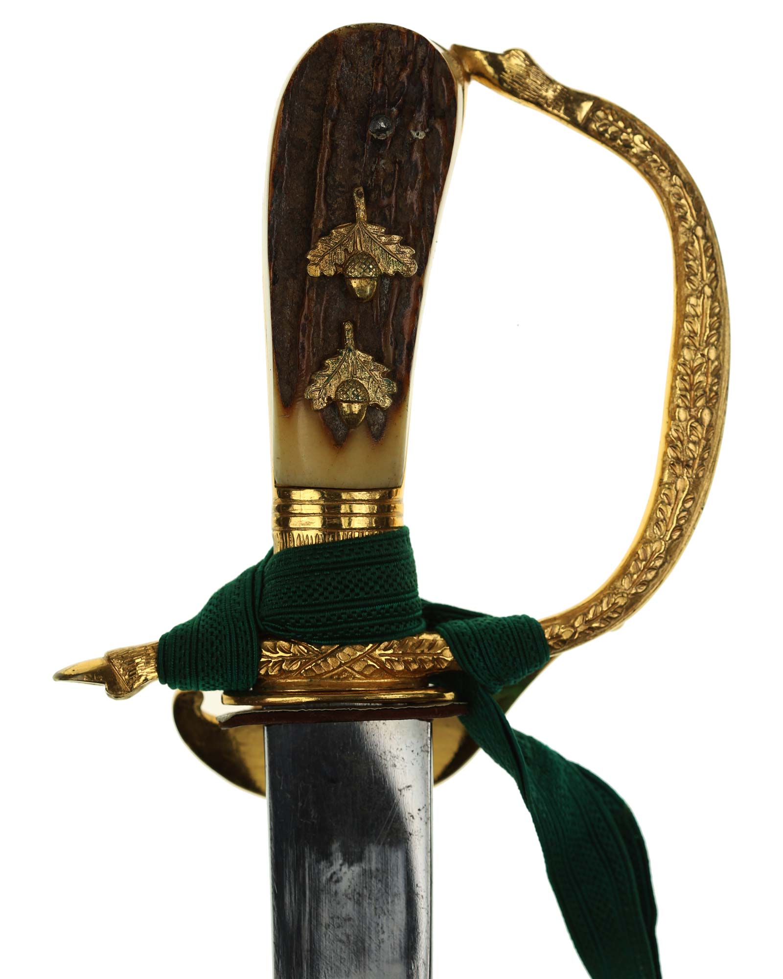 Рукоять: Эфес состоит из гарды, рукояти и щитка. Прибор эфеса выполнен из белого металла и покрыт золотым лаком. Крестовина образована защитной дужкой, направленной одной стороной к навершию, а второй в противоположную сторону. Под крестовиной установлен щитик. Рукоять образована двумя щечками из кости. На щечках с двух сторон расположены бронзовые накладки в виде желудей.