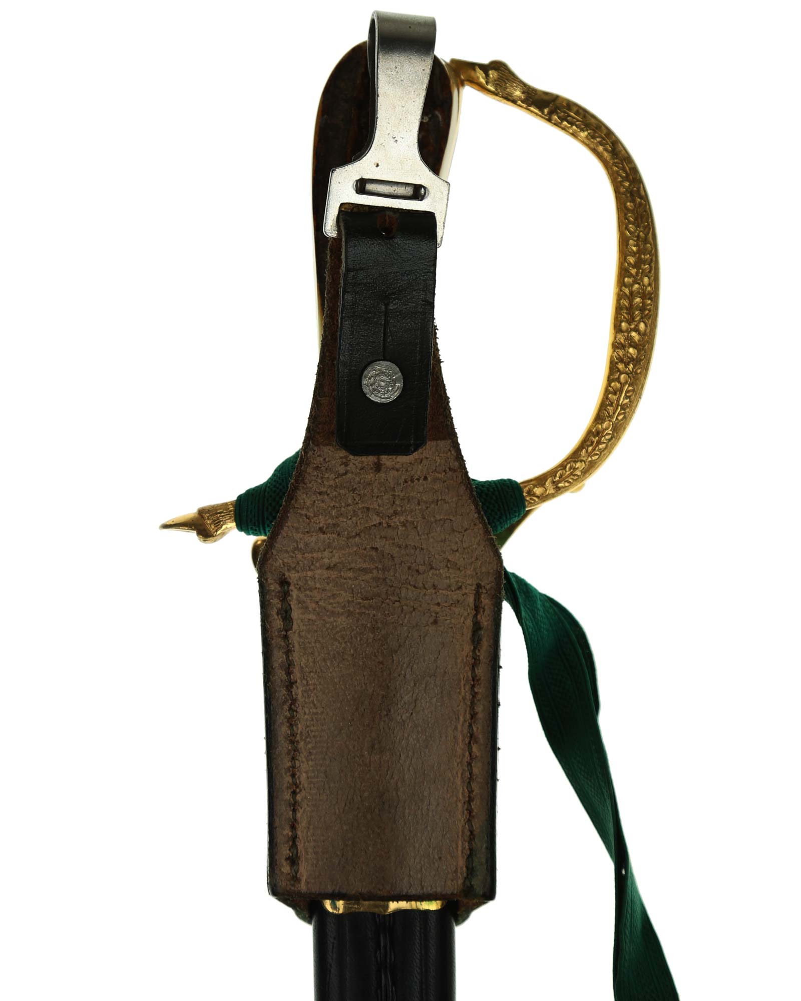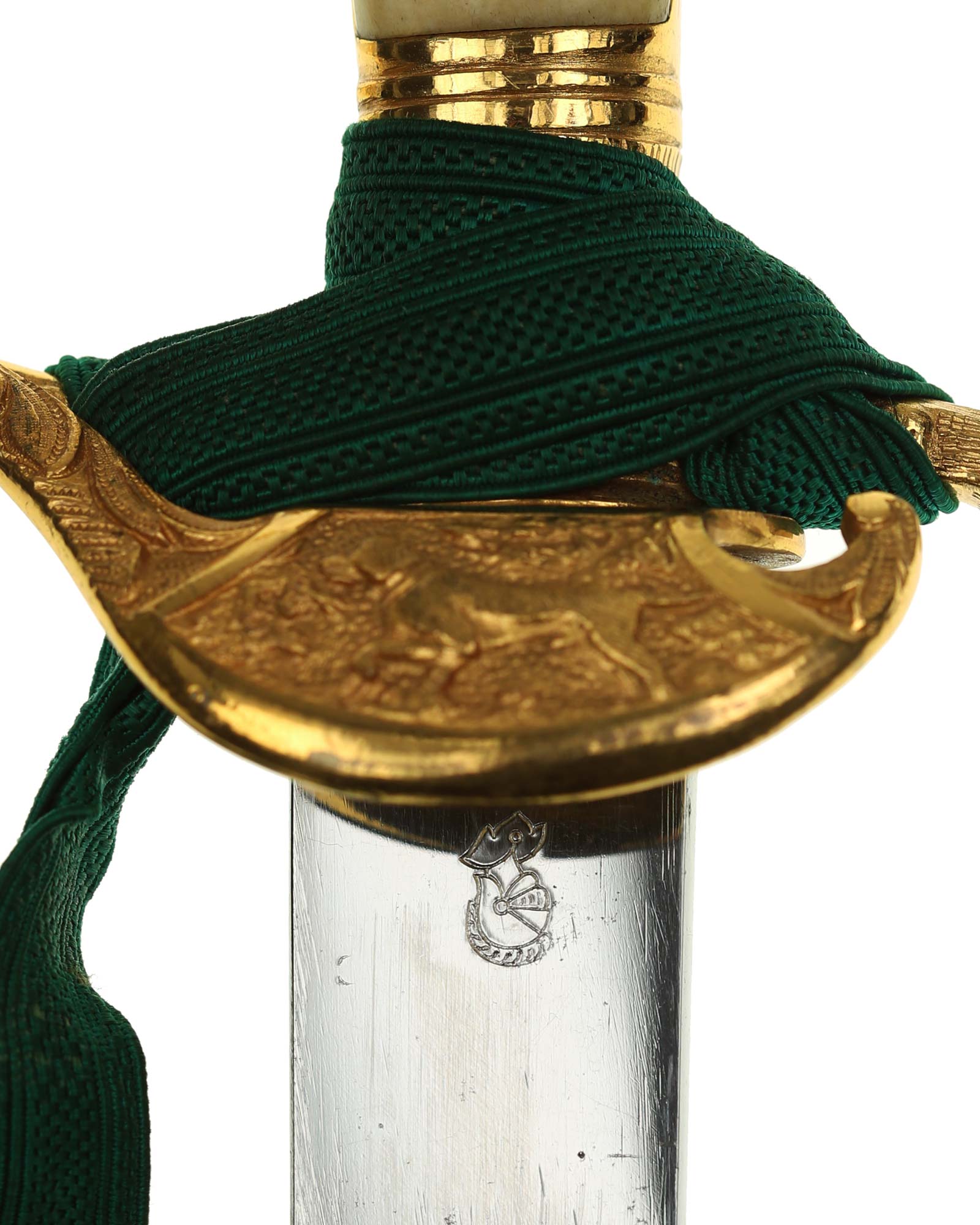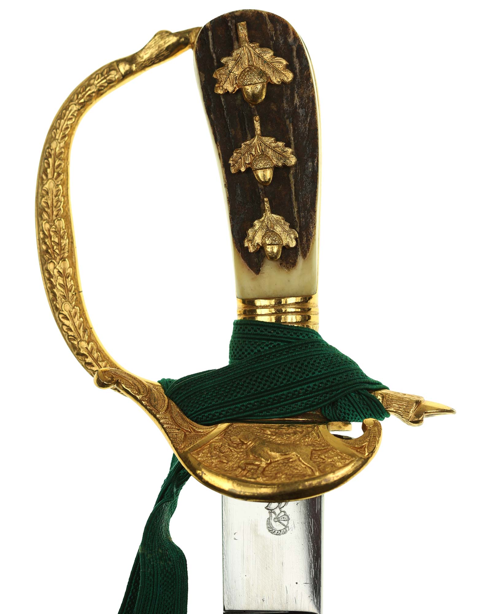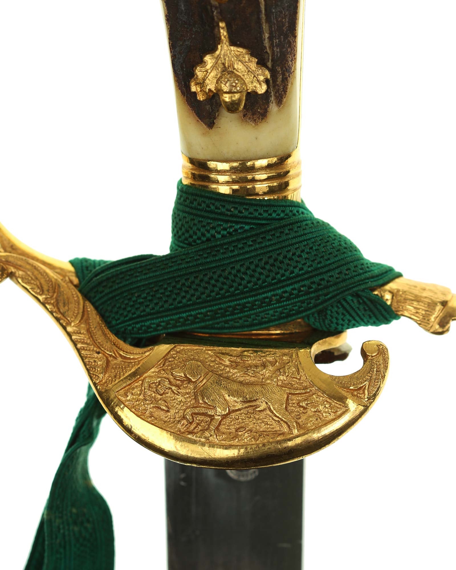 Рукоять: Эфес состоит из гарды, рукояти и щитка. Прибор эфеса выполнен из белого металла и покрыт золотым лаком. Крестовина образована защитной дужкой, направленной одной стороной к навершию, а второй в противоположную сторону. Под крестовиной установлен щитик. Рукоять образована двумя щечками из кости. На щечках с двух сторон расположены бронзовые накладки в виде желудей.