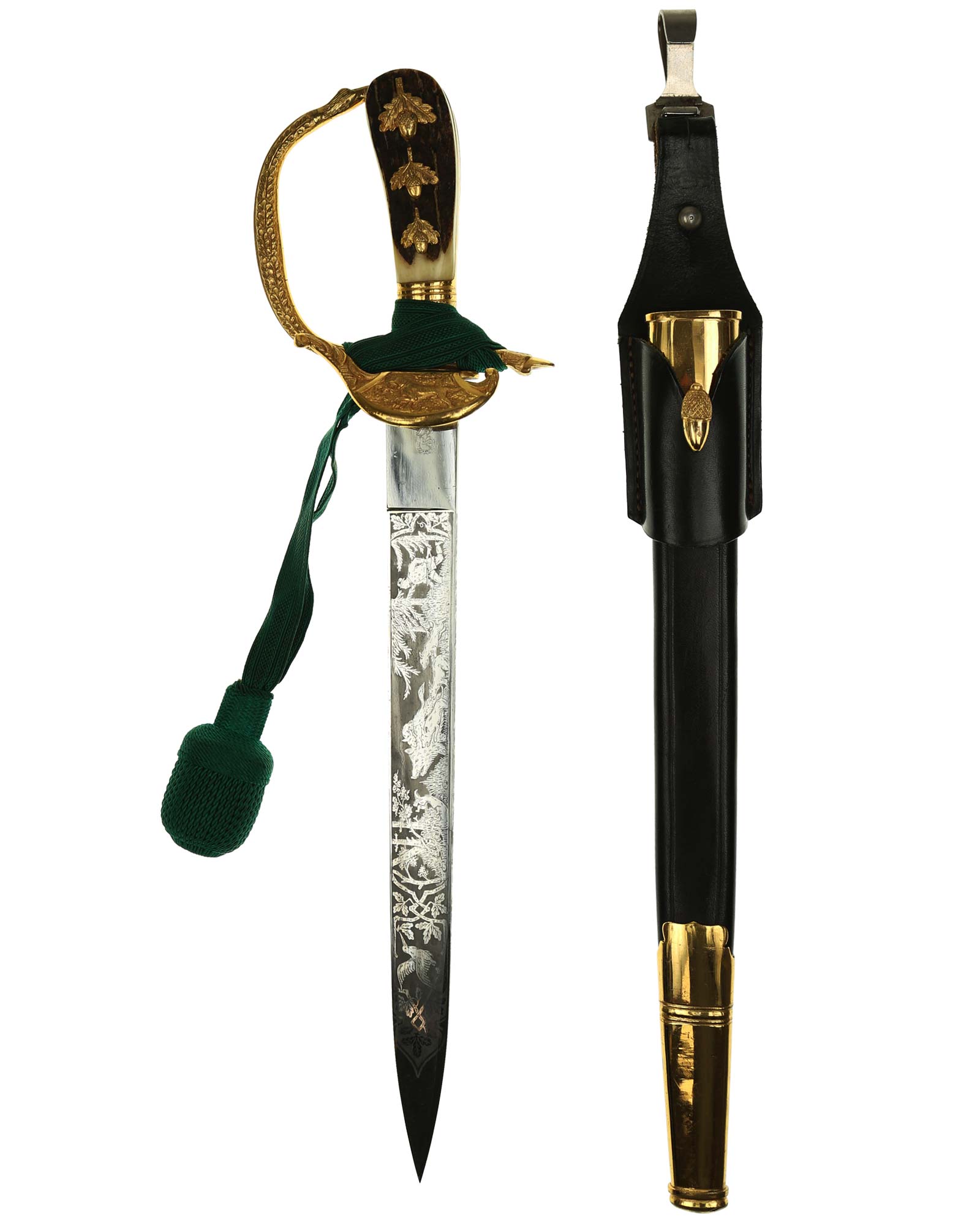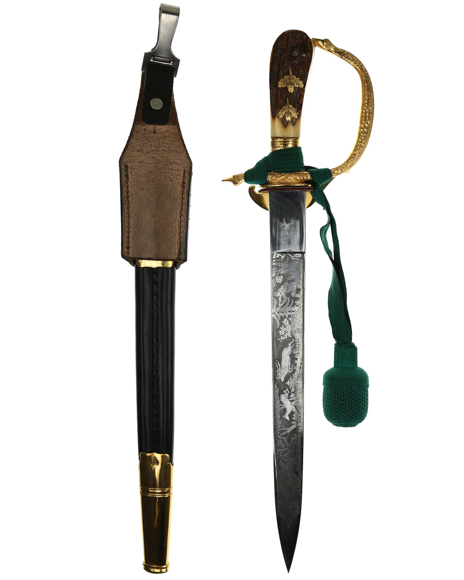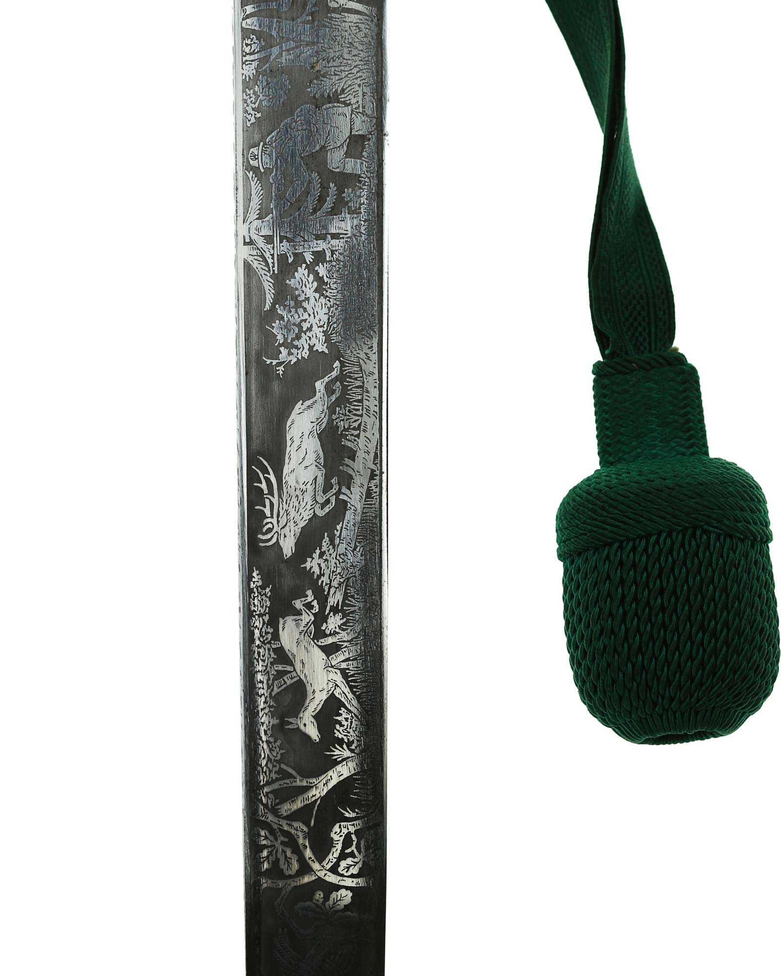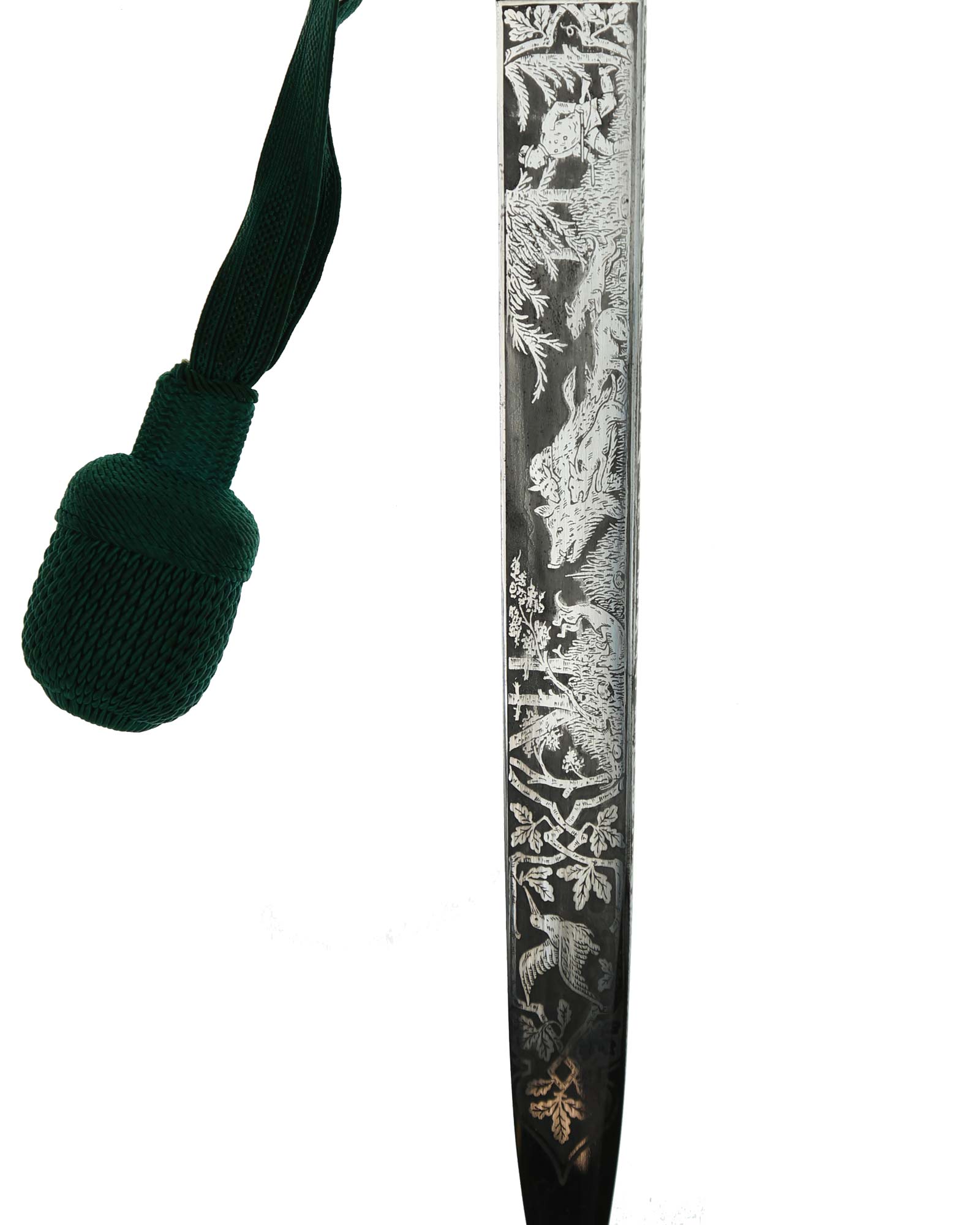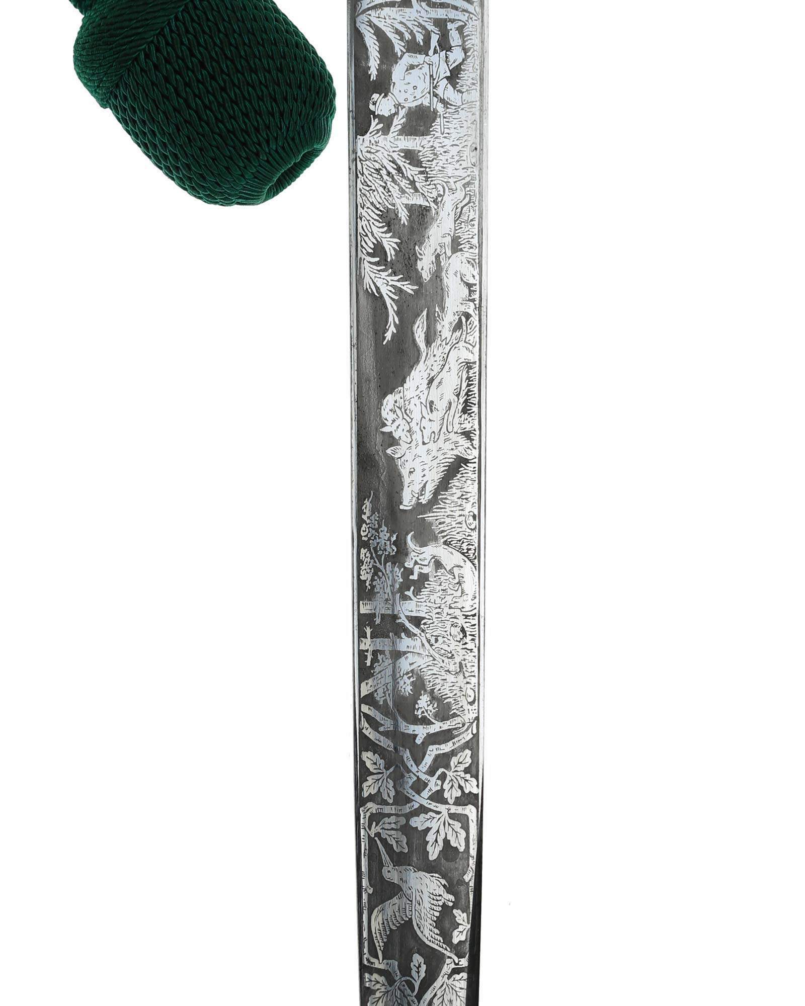 Клинок: Клинок прямой, стальной, двулезвийный, плоский, с двух сторон украшен травленым орнаментом с изображением охотничьих сцен.