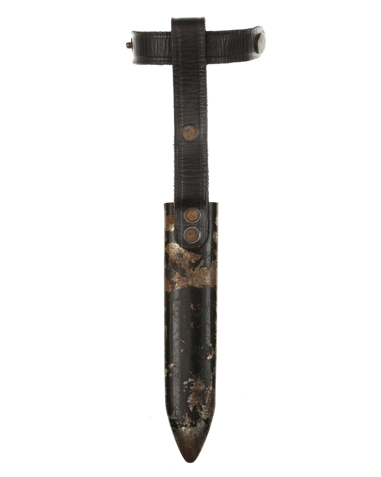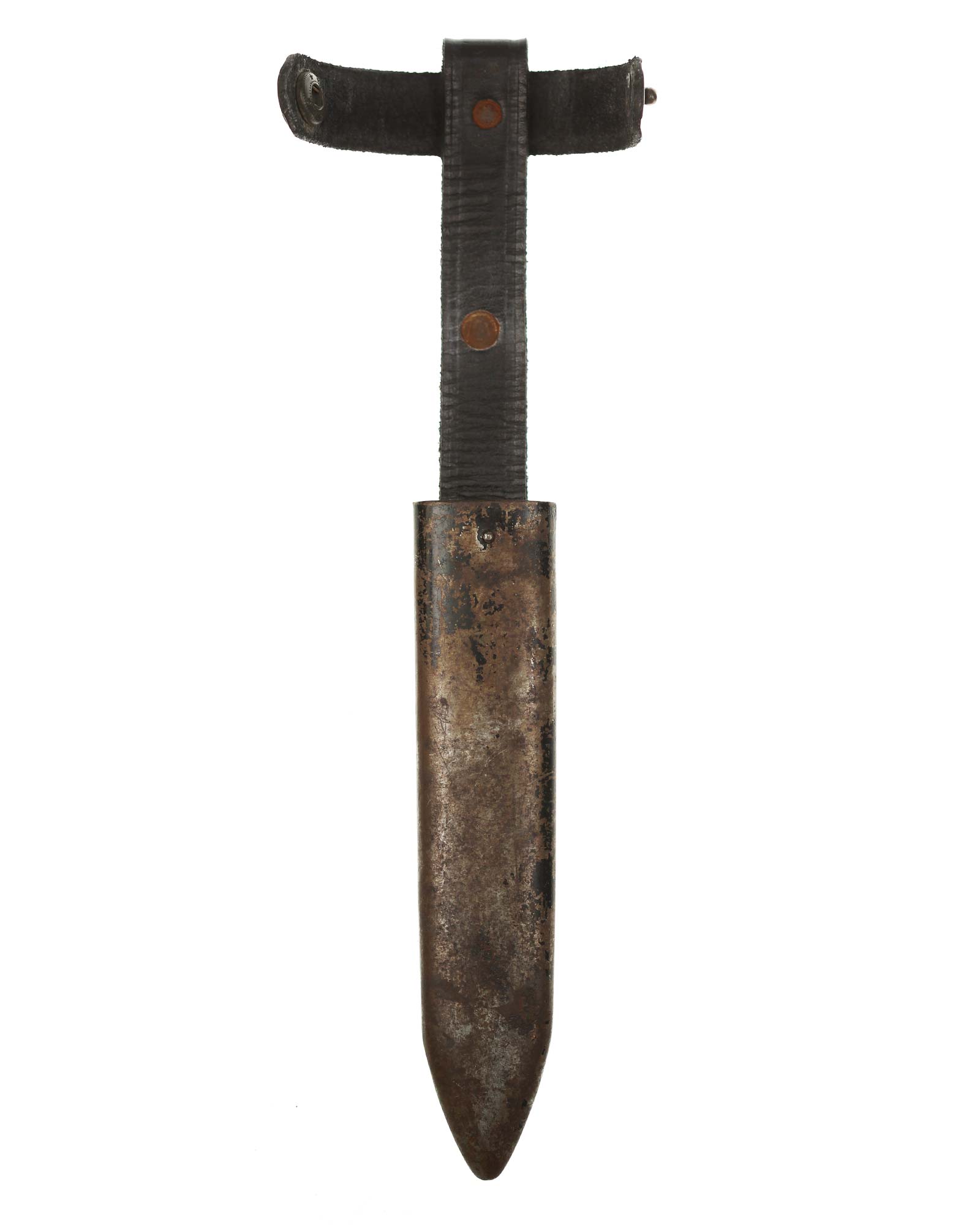 Ножны: Ножны изготовлены из окрашенной в черный цвет стали. Для плотного удержания клинка изнутри расположены две пружины, прикрепленные с помощью заклепок к внутренней стороне ножен. Устройство для ношения состоит из петли, состоящей из двухслойной кожаной ленты, крепящейся к ножнам двумя заклепками. В верхней части подвеса имеется ремешок, обращенный наружу, прикрепленныйс помощью заклепки, закрывающияся кнопкой.