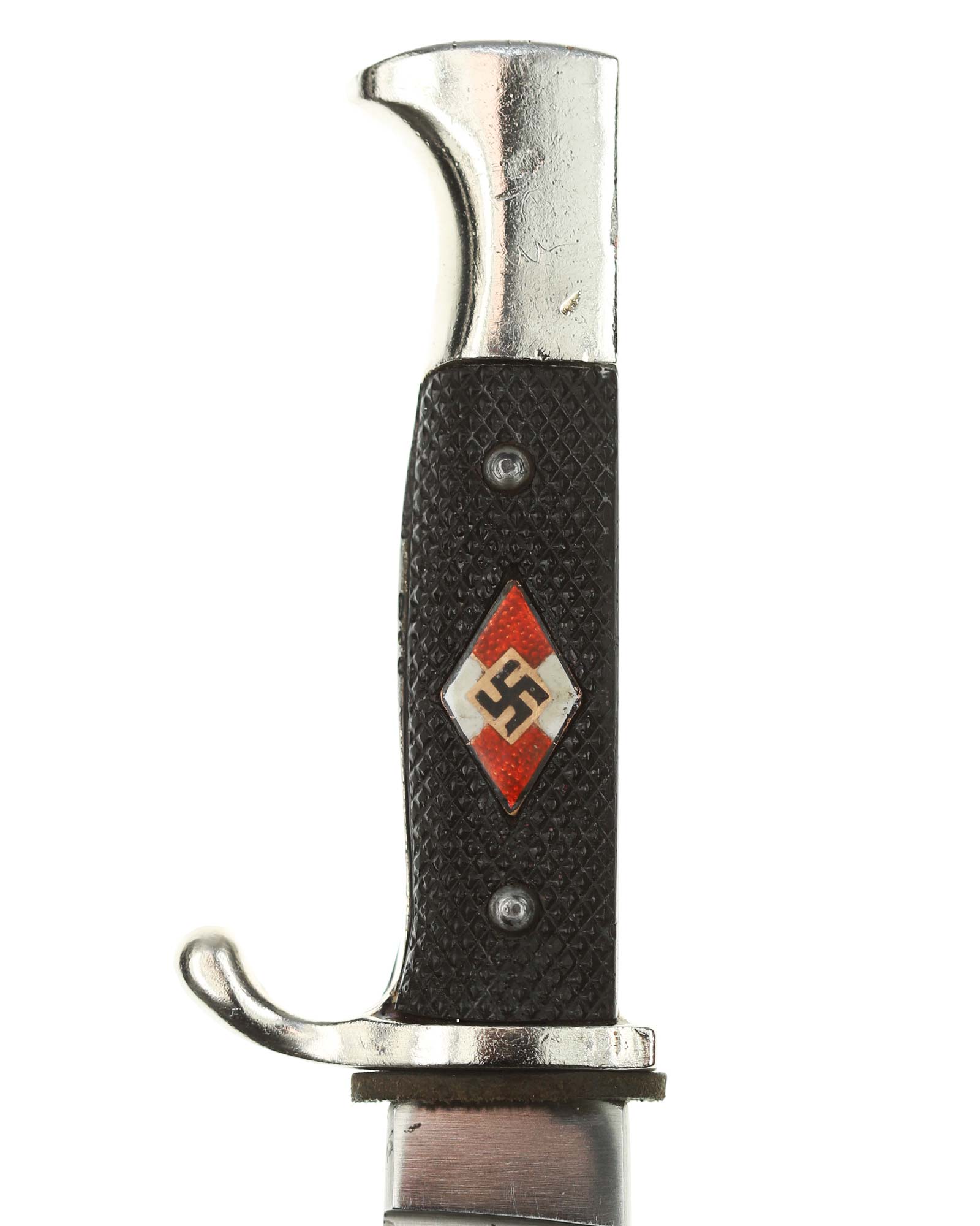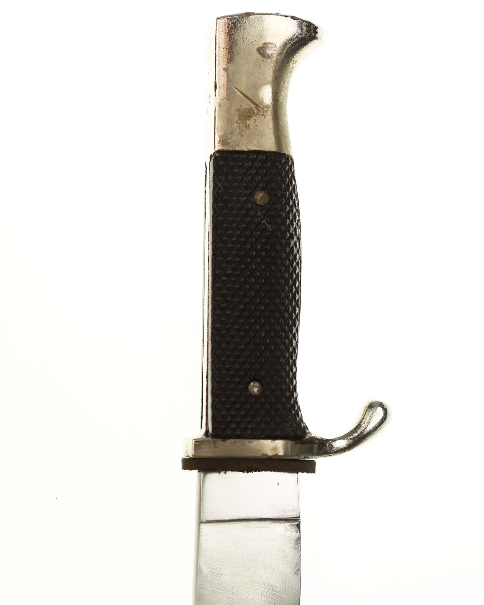 Рукоять: Рукоять ножа с черными пластиковыми щечками и эмалевой эмблемой "Гитлер Югенд". С обеих сторон бакелитовые накладки интенсивно чёрного цвета с рифленым рисунком. На лицевой стороне в центре эмблема организации «Гитлерюгенд» (также HJ-ромб).