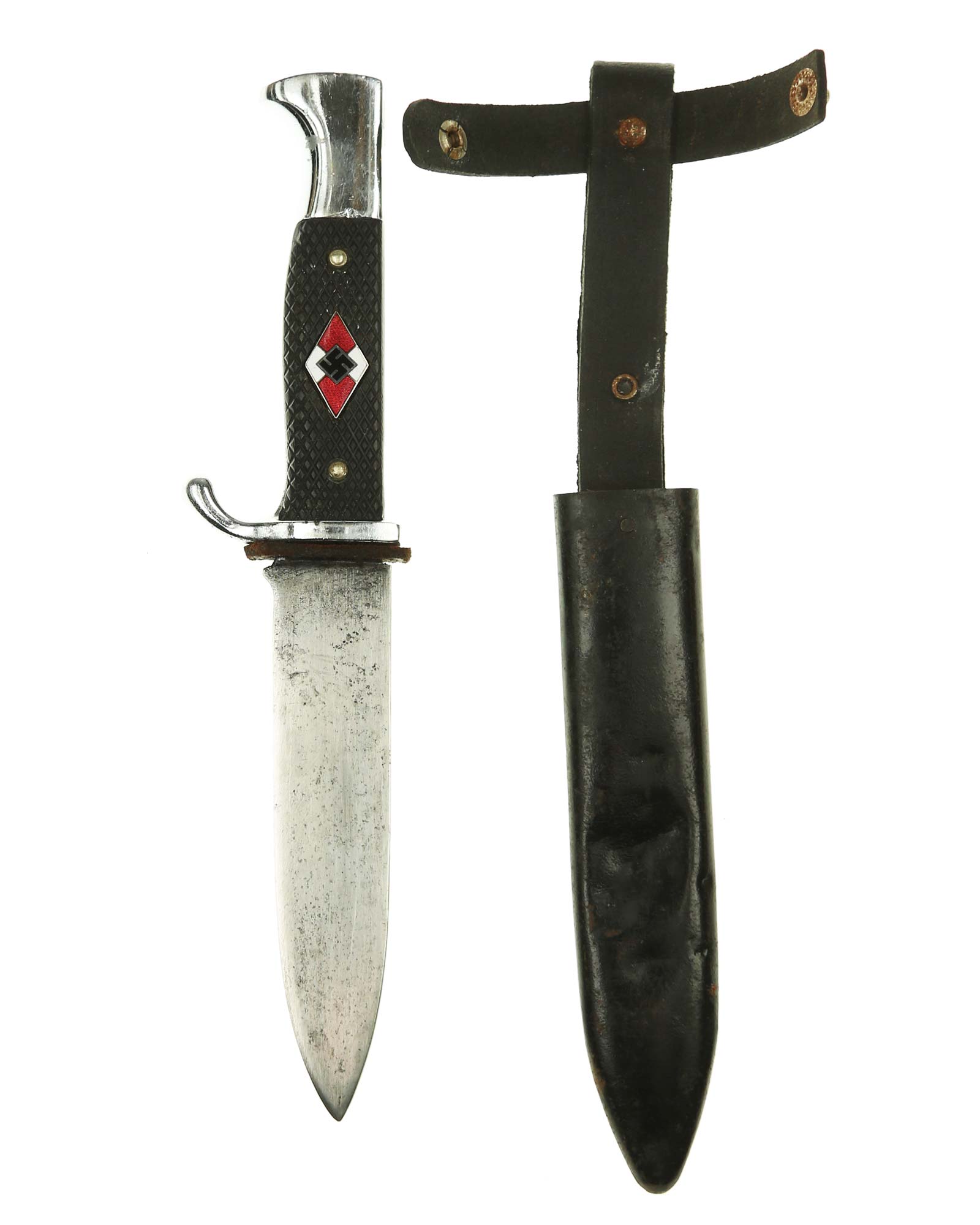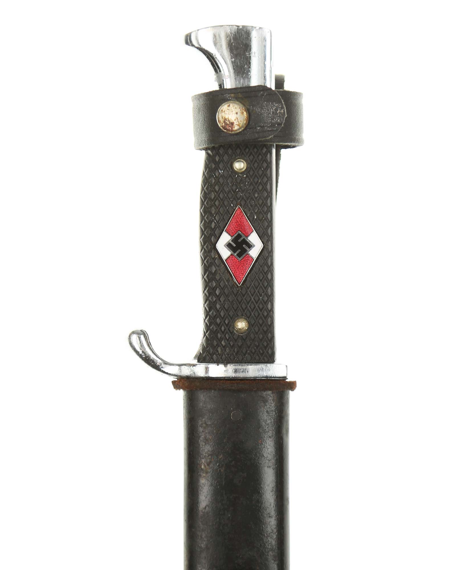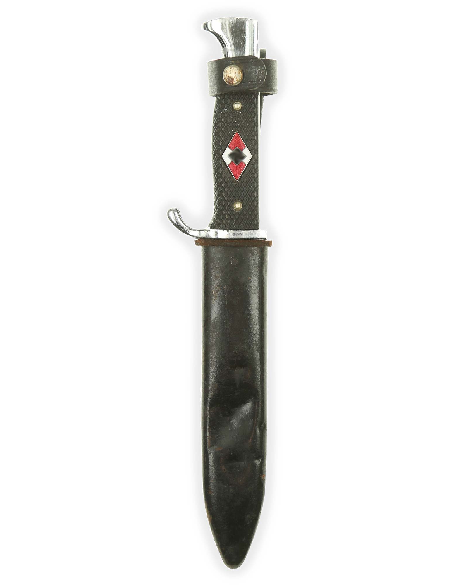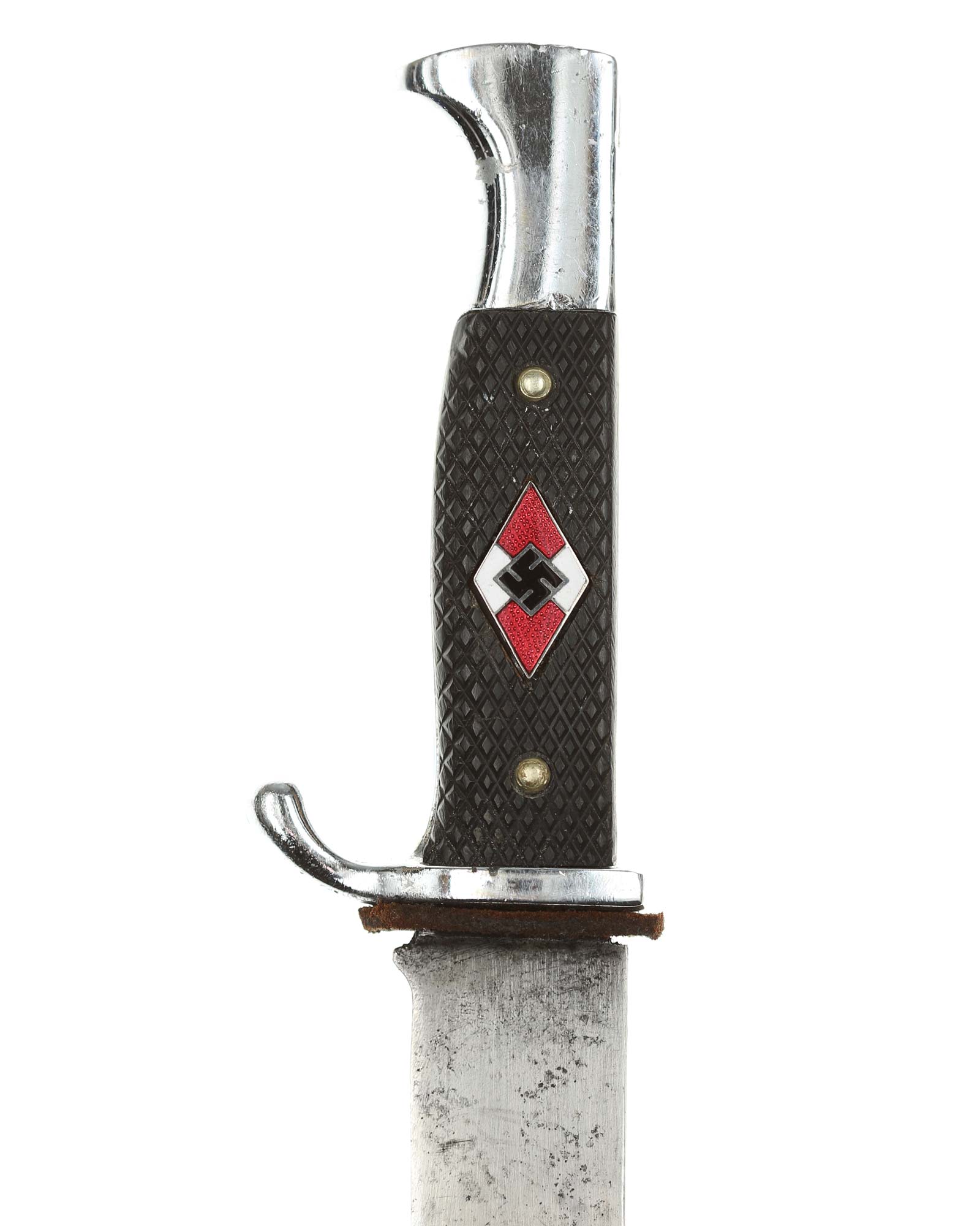 Рукоять: Рукоять ножа с черными пластиковыми щечками и эмалевой эмблемой "Гитлер Югенд". С обеих сторон бакелитовые накладки интенсивно чёрного цвета с рифленым рисунком. На лицевой стороне в центре эмблема организации «Гитлерюгенд» (также HJ-ромб). Крестовина литая непористая, отлита вместе с деталями рукояти из никелированного железа.