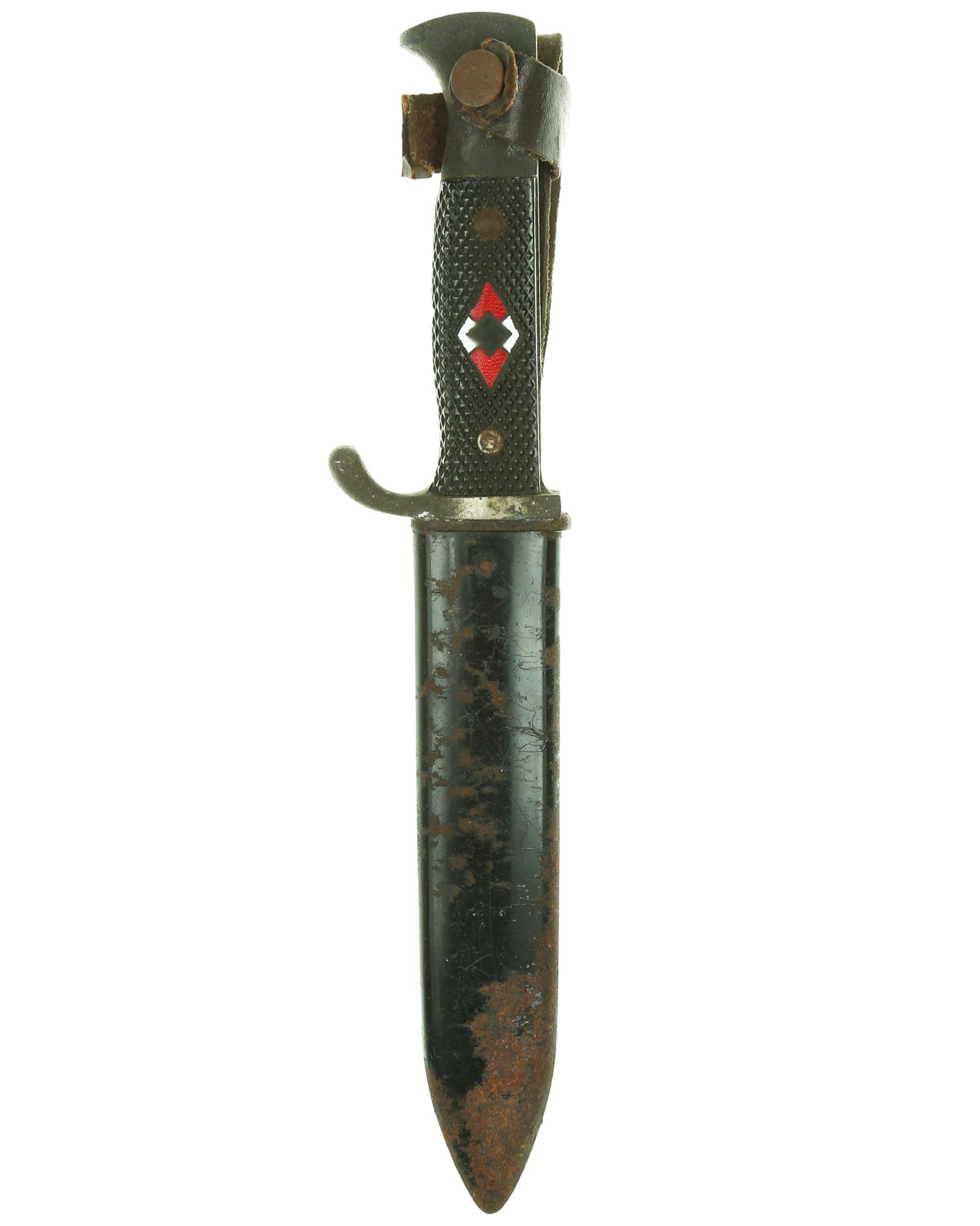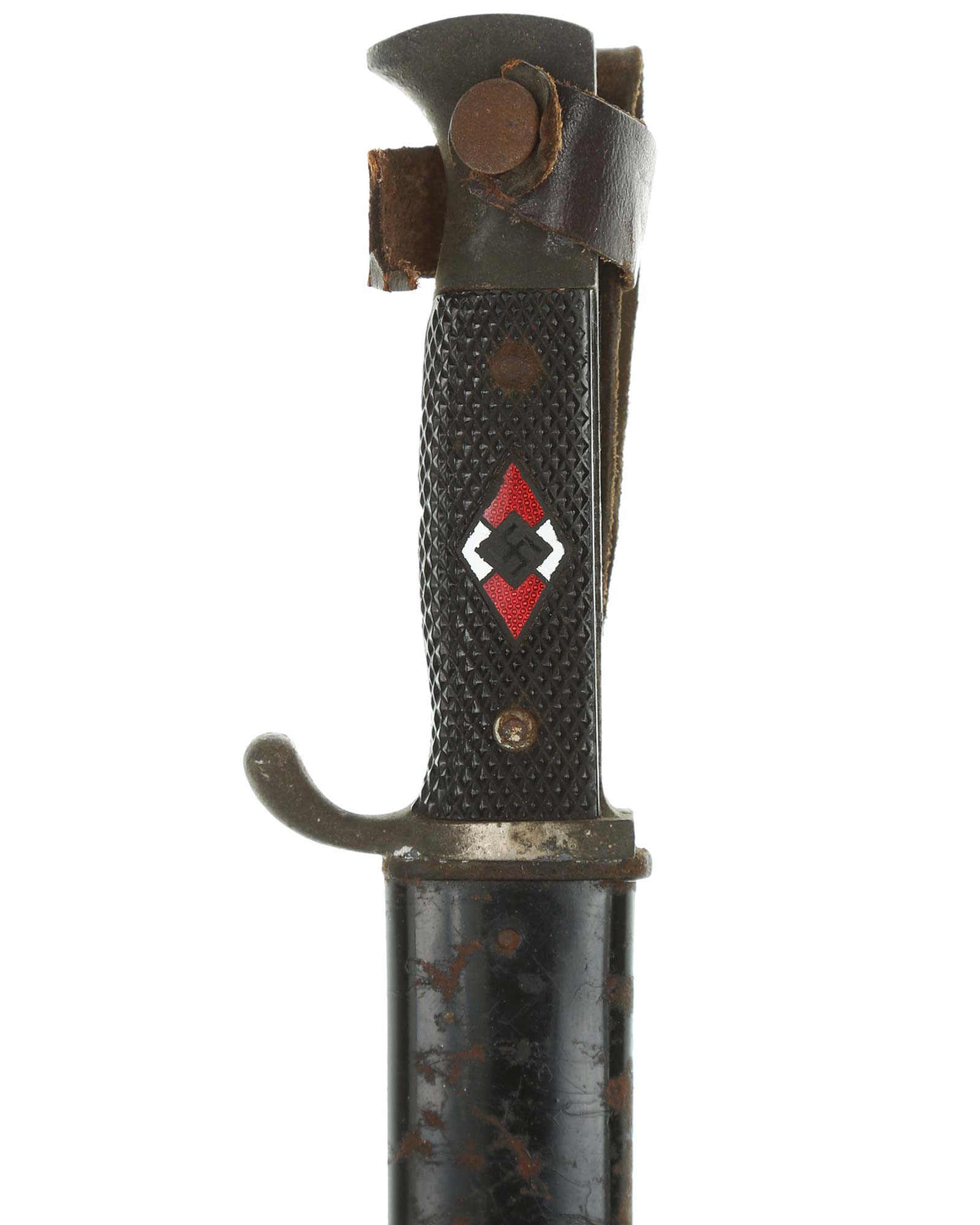 Рукоять: Рукоять ножа с черными пластиковыми щечками и эмалевой эмблемой "Гитлер Югенд". С обеих сторон бакелитовые накладки интенсивно чёрного цвета с рифленым рисунком. На лицевой стороне в центре эмблема организации «Гитлерюгенд» (также HJ-ромб). Крестовина литая непористая, отлита вместе с деталями рукояти из никелированного железа (магнитная).