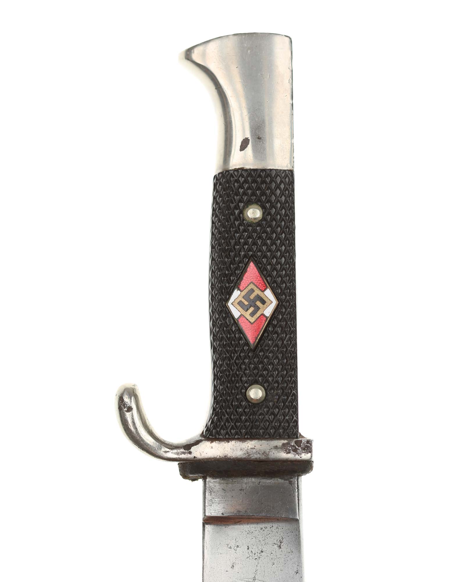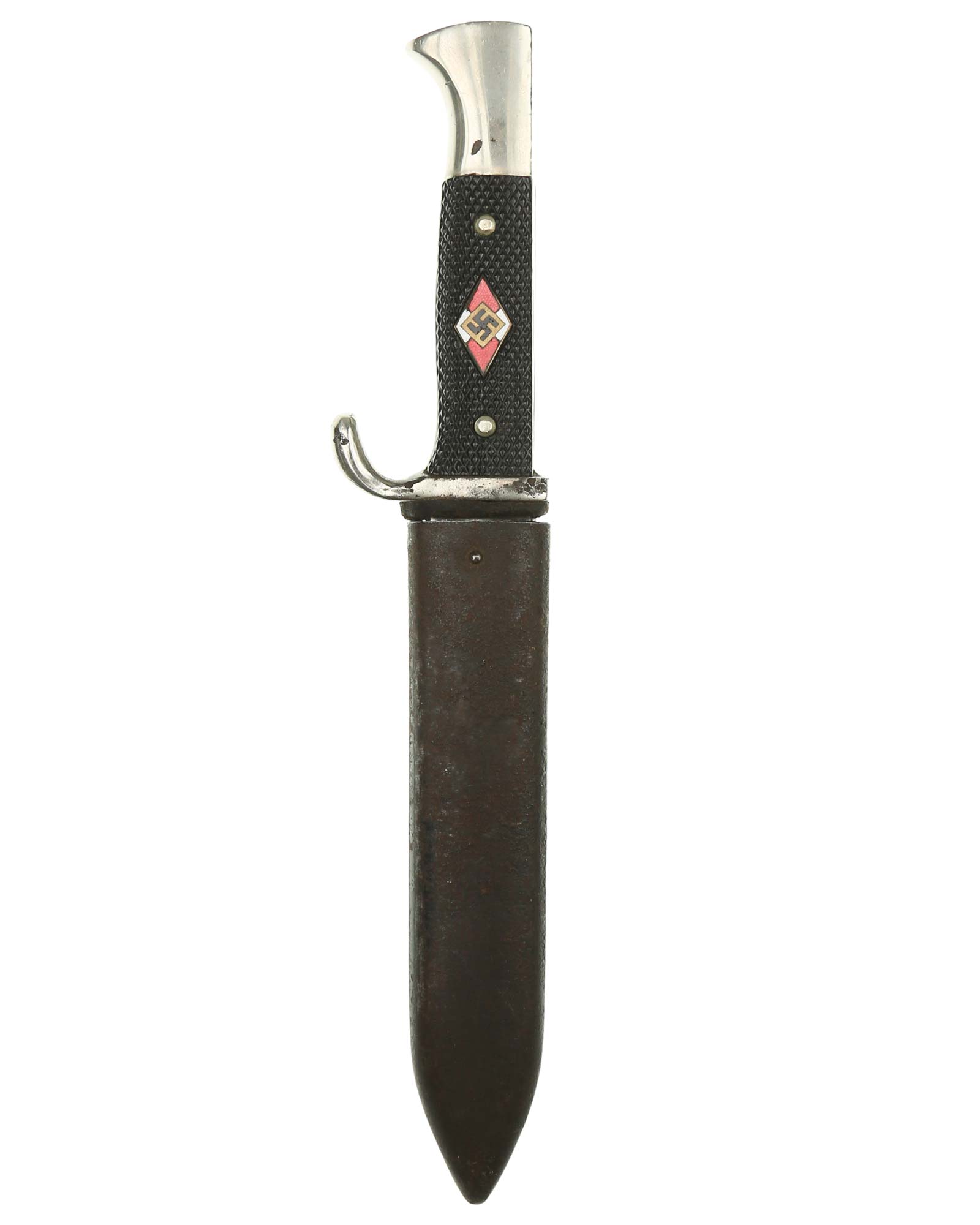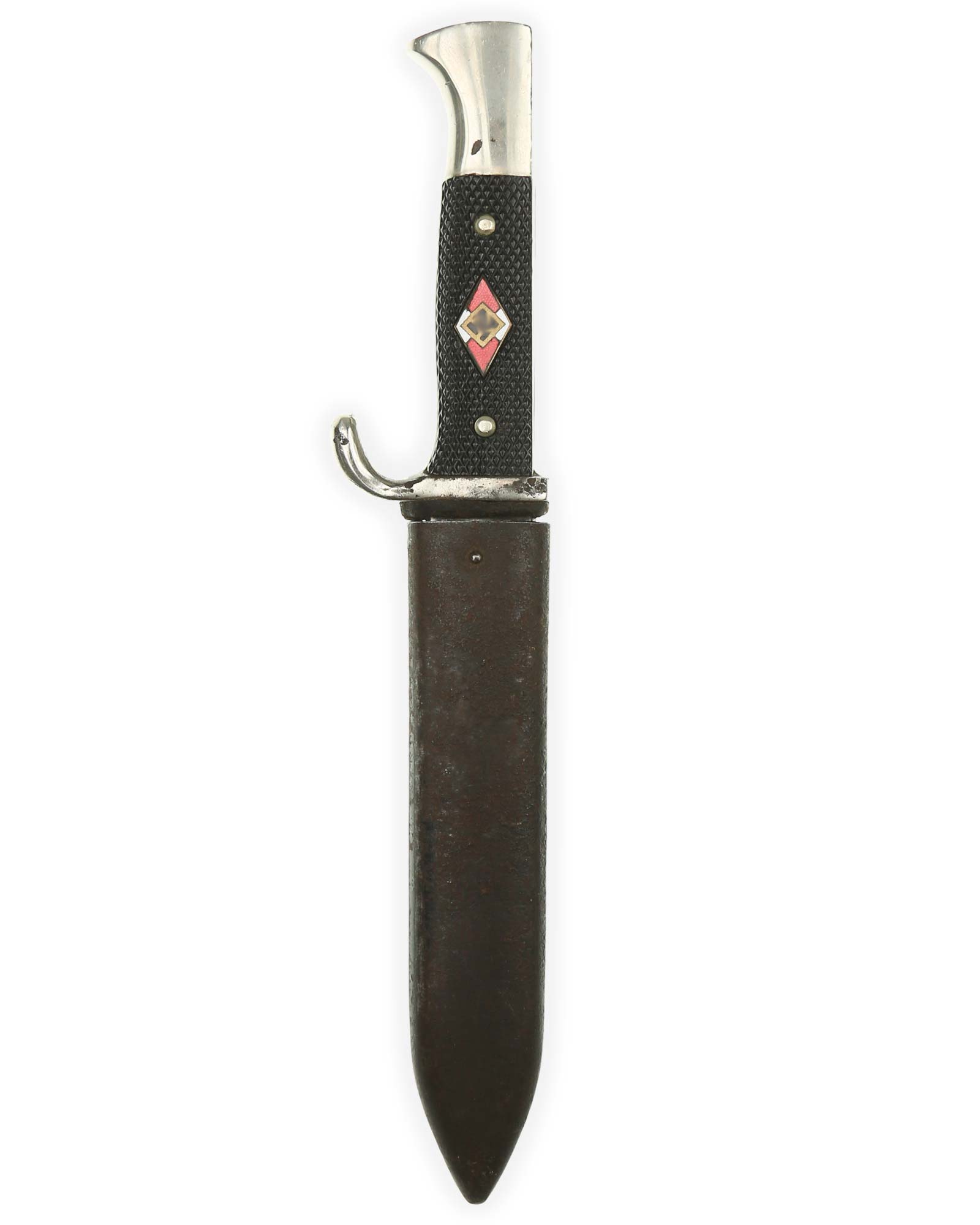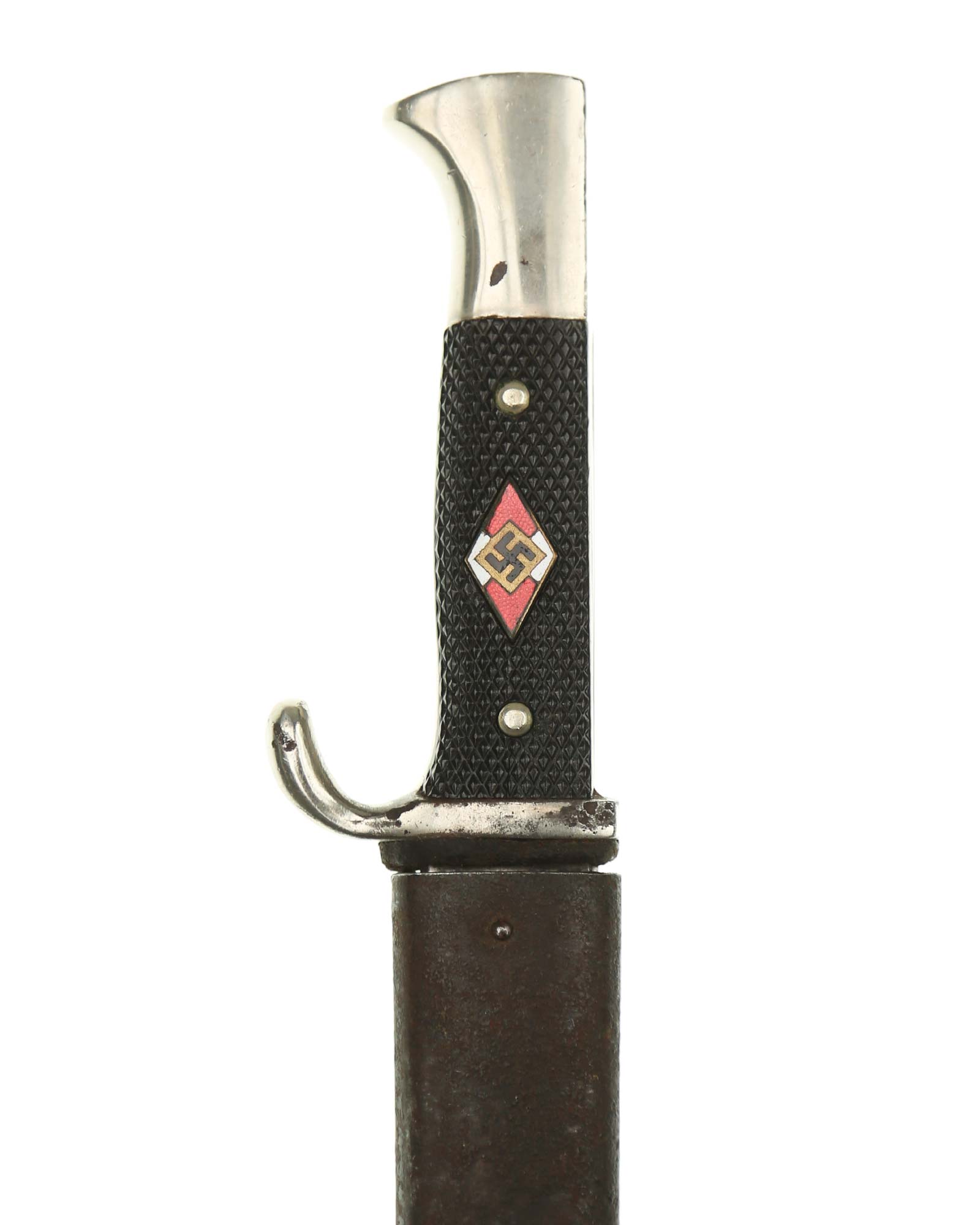 Рукоять: Рукоять ножа с черными пластиковыми щечками и эмалевой эмблемой "Гитлер Югенд". На лицевой стороне в центре эмблема организации «Гитлерюгенд» (также HJ-ромб).
