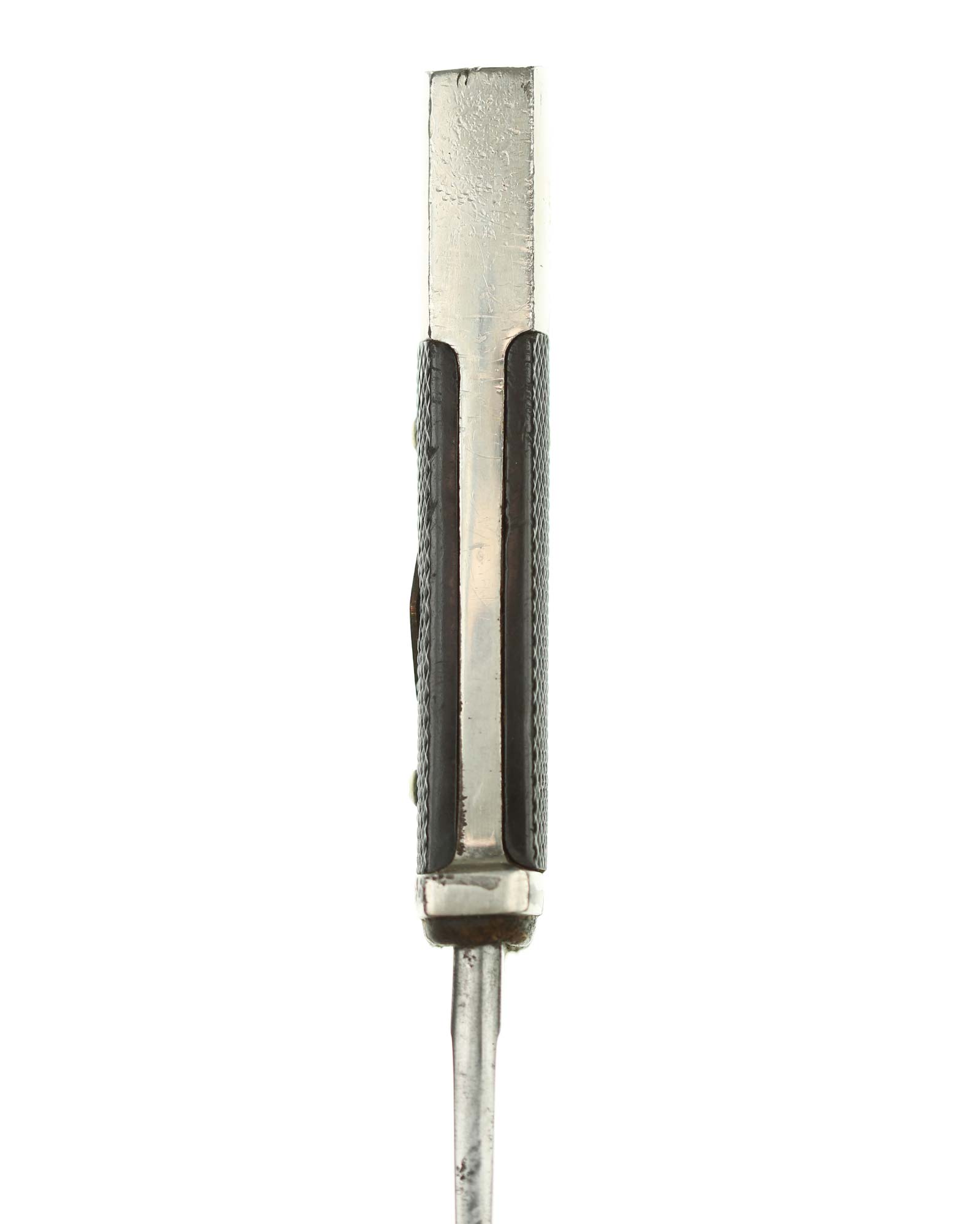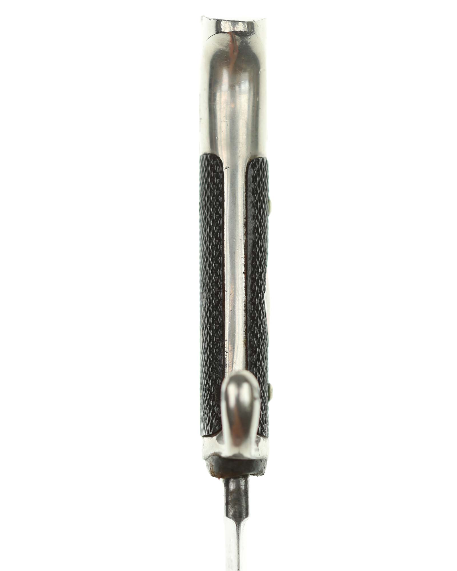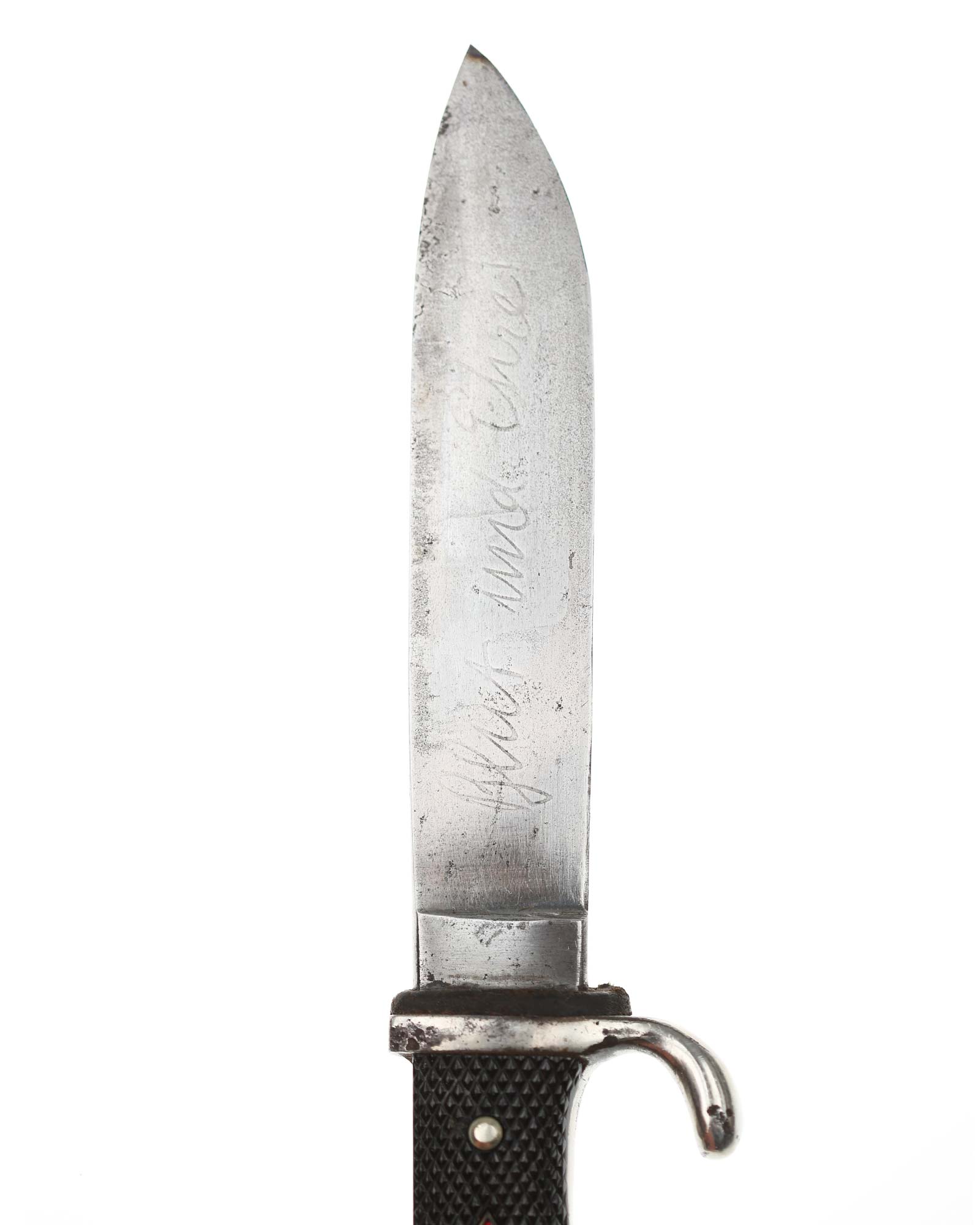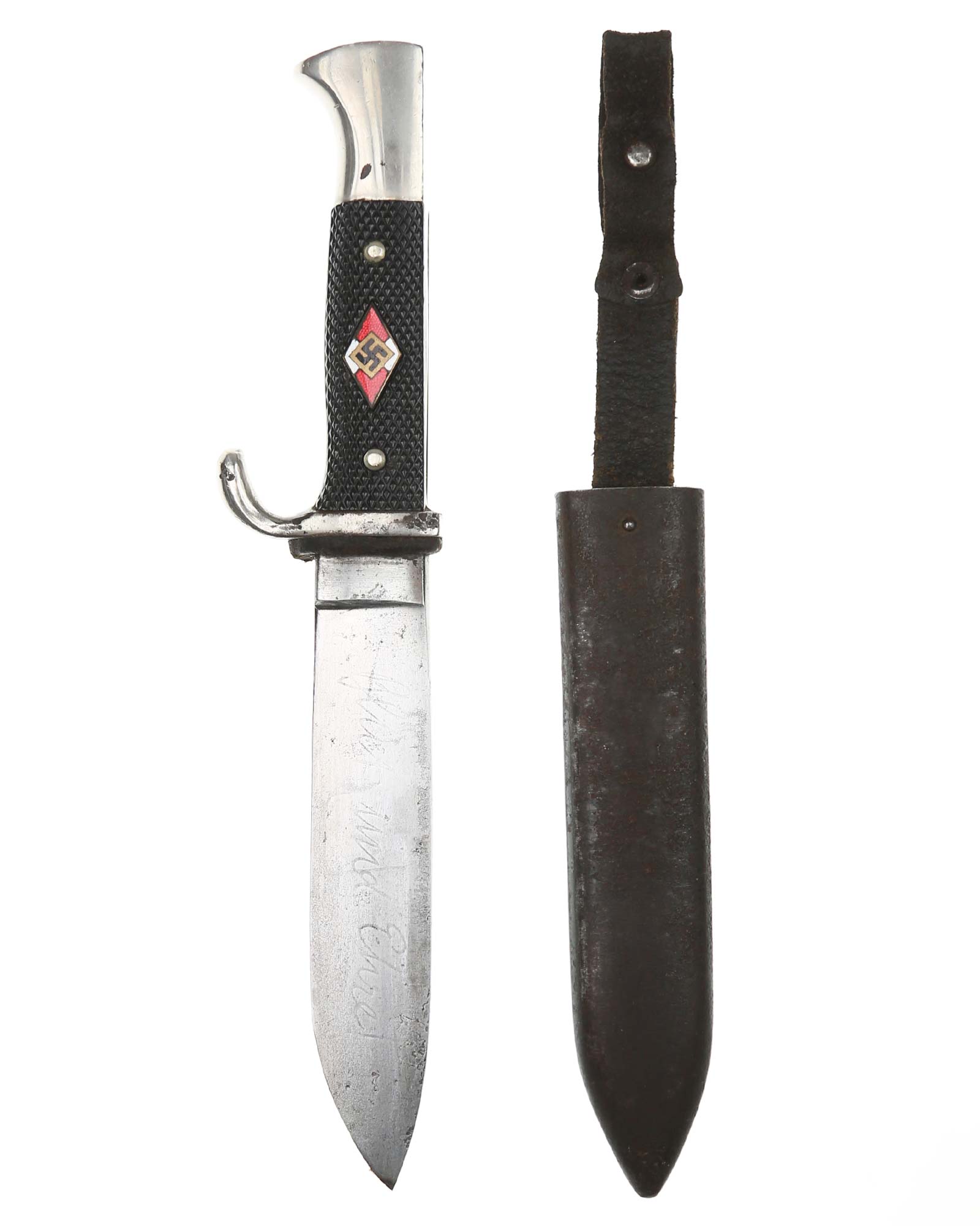 Рукоять: Рукоять ножа с черными пластиковыми щечками и эмалевой эмблемой "Гитлер Югенд". На лицевой стороне в центре эмблема организации «Гитлерюгенд» (также HJ-ромб).
