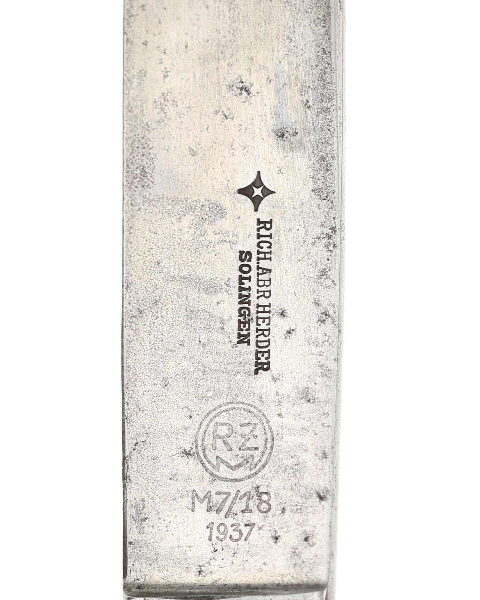 Клинок: Клинок никелированный, с одной стороны помещен девиз - "Кровь и честь" (нем. Blut und Ehre), с другой RZM клеймо производителя RZM M7/18 (Rich. A. Herder Solingen).