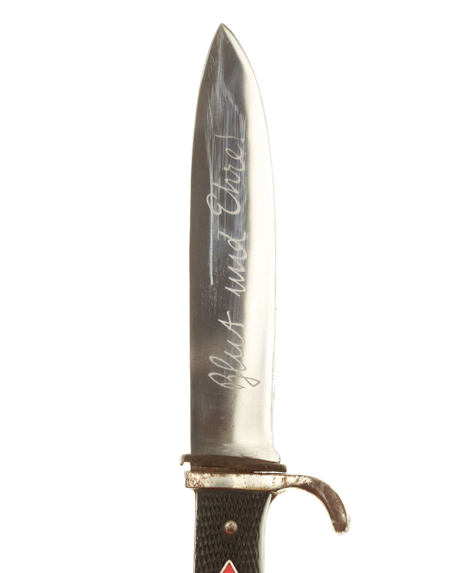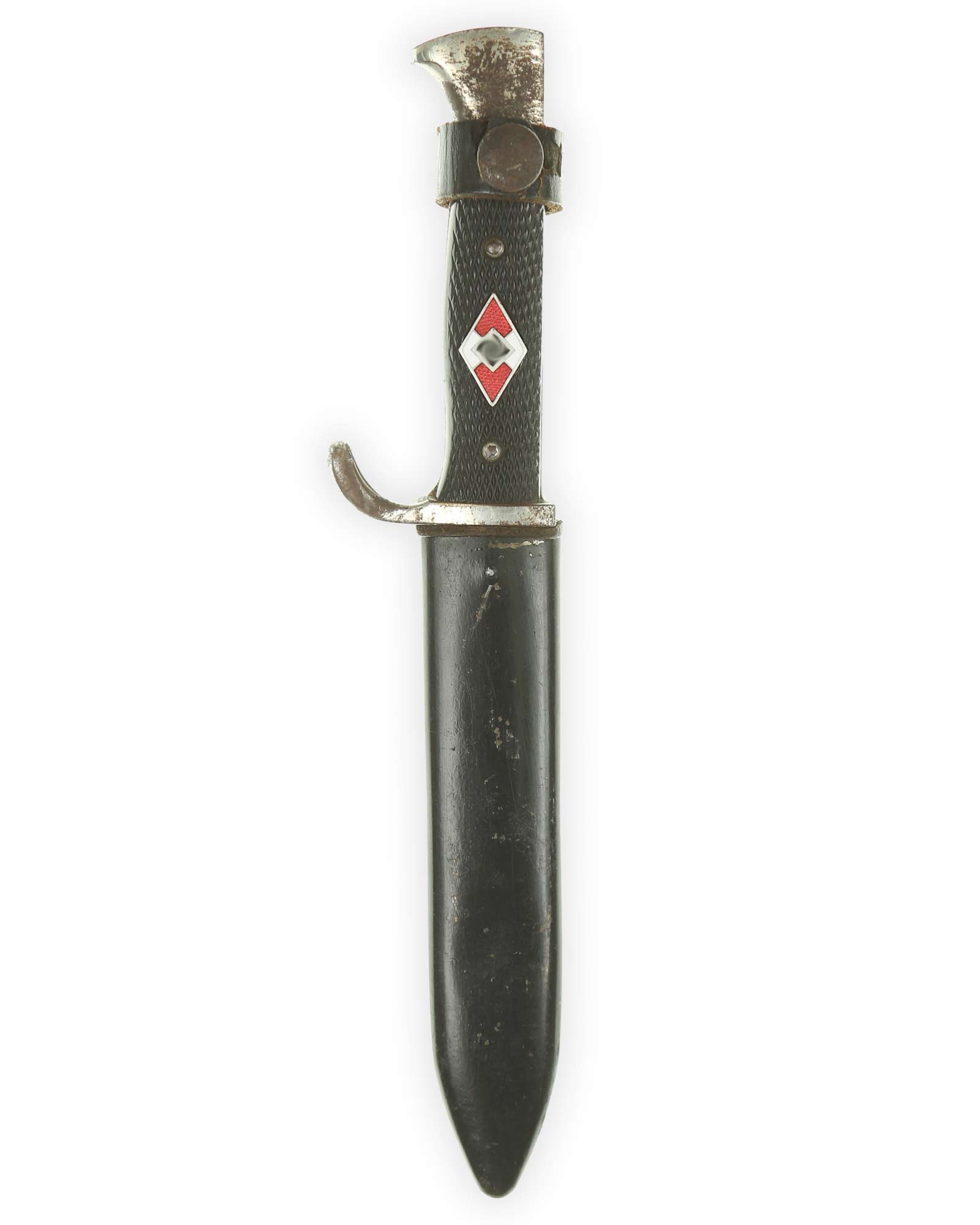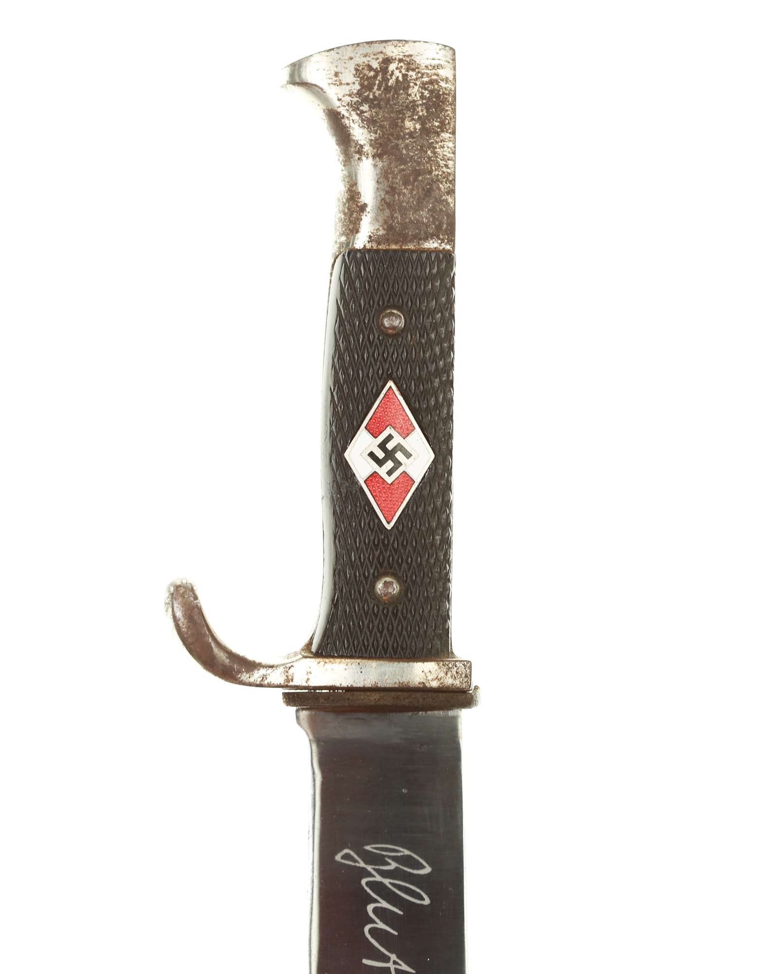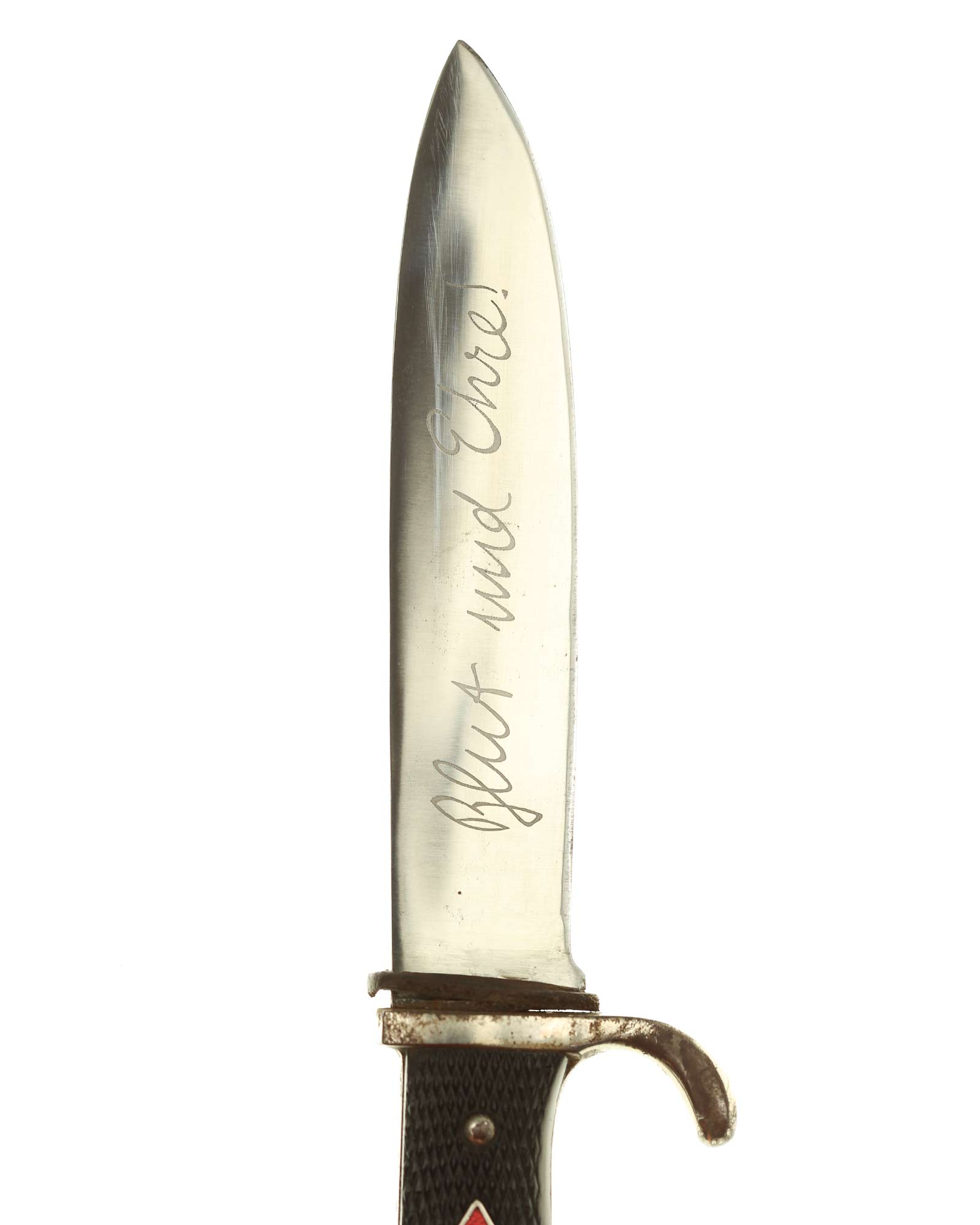 Рукоять: Рукоять ножа с черными пластиковыми щечками и эмалевой эмблемой "Гитлер Югенд". С обеих сторон бакелитовые накладки интенсивно чёрного цвета с рифленым рисунком. На лицевой стороне в центре эмблема организации «Гитлерюгенд» (также HJ-ромб). Крестовина литая непористая, отлита вместе с деталями рукояти из никелированного железа.