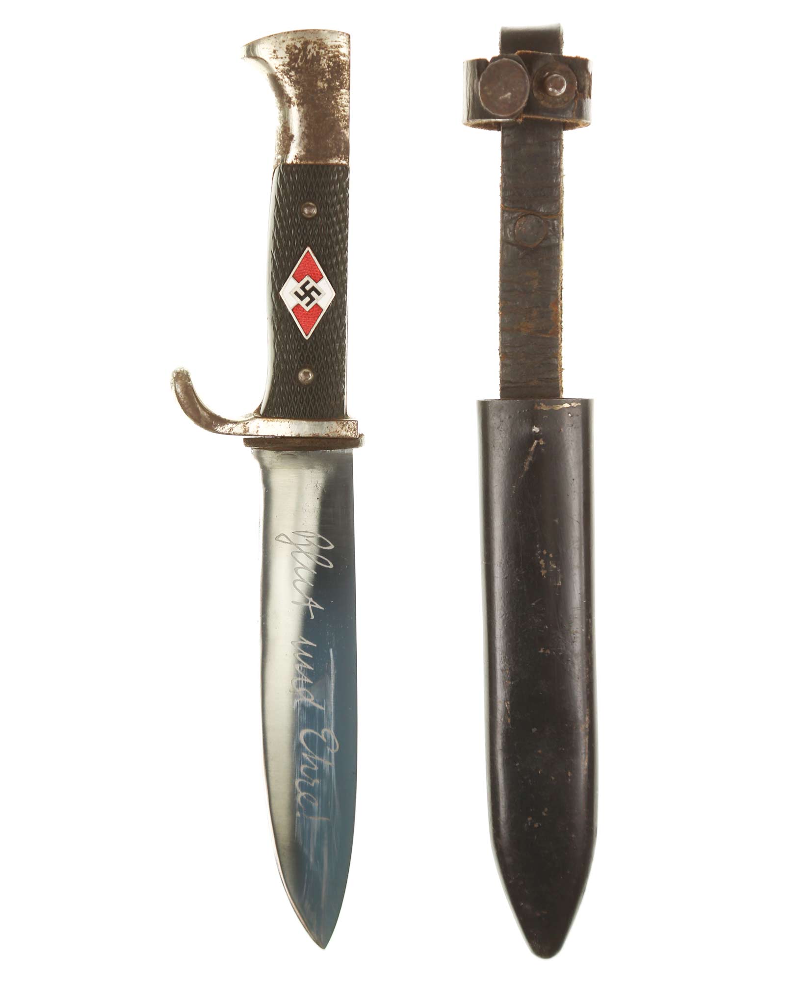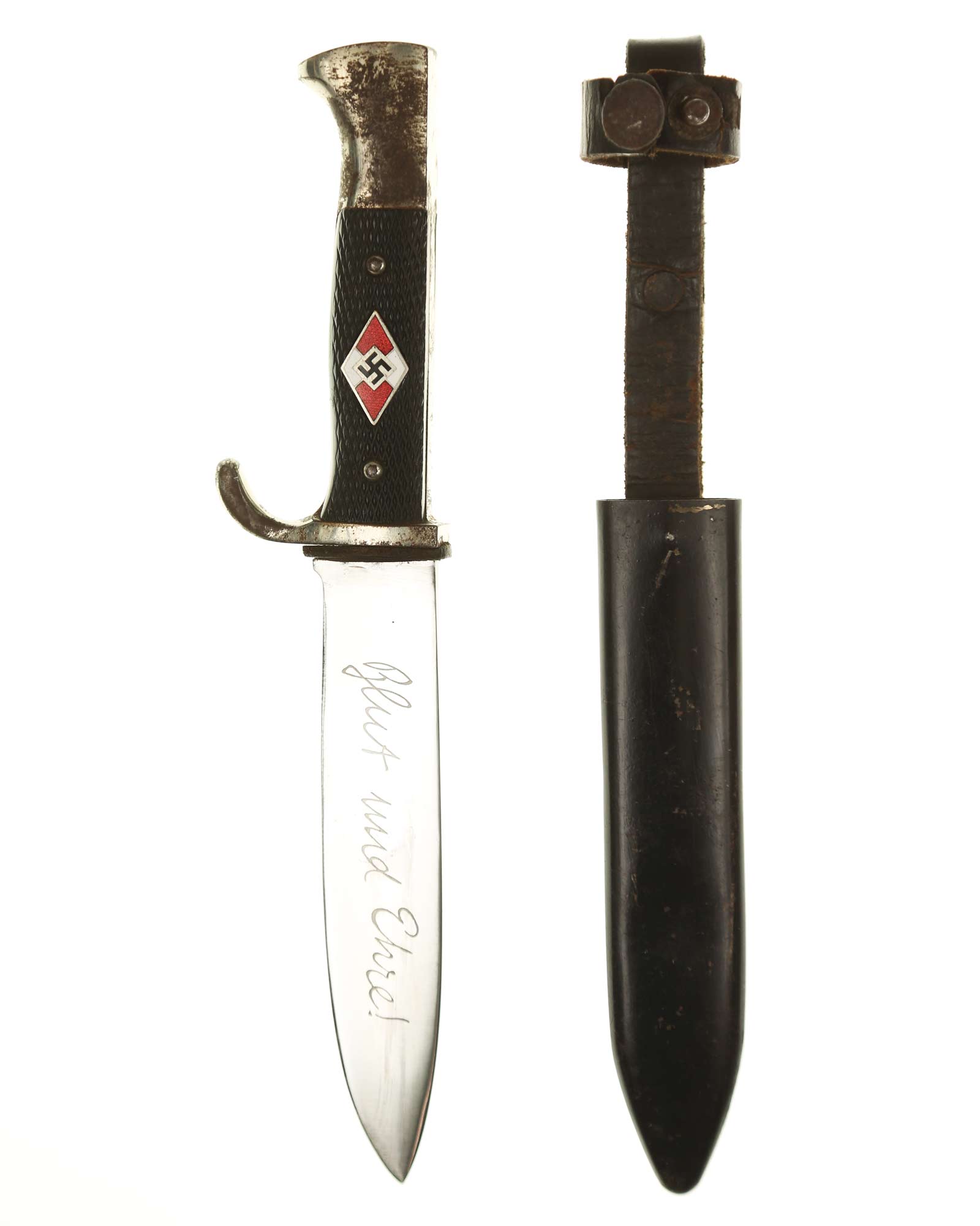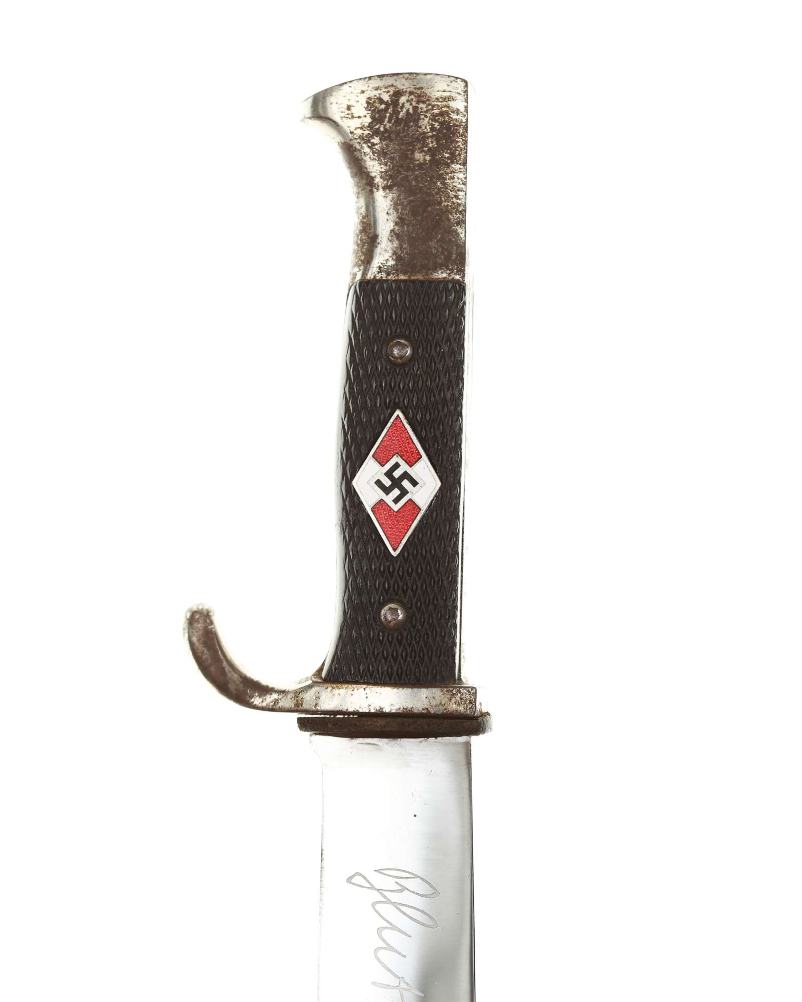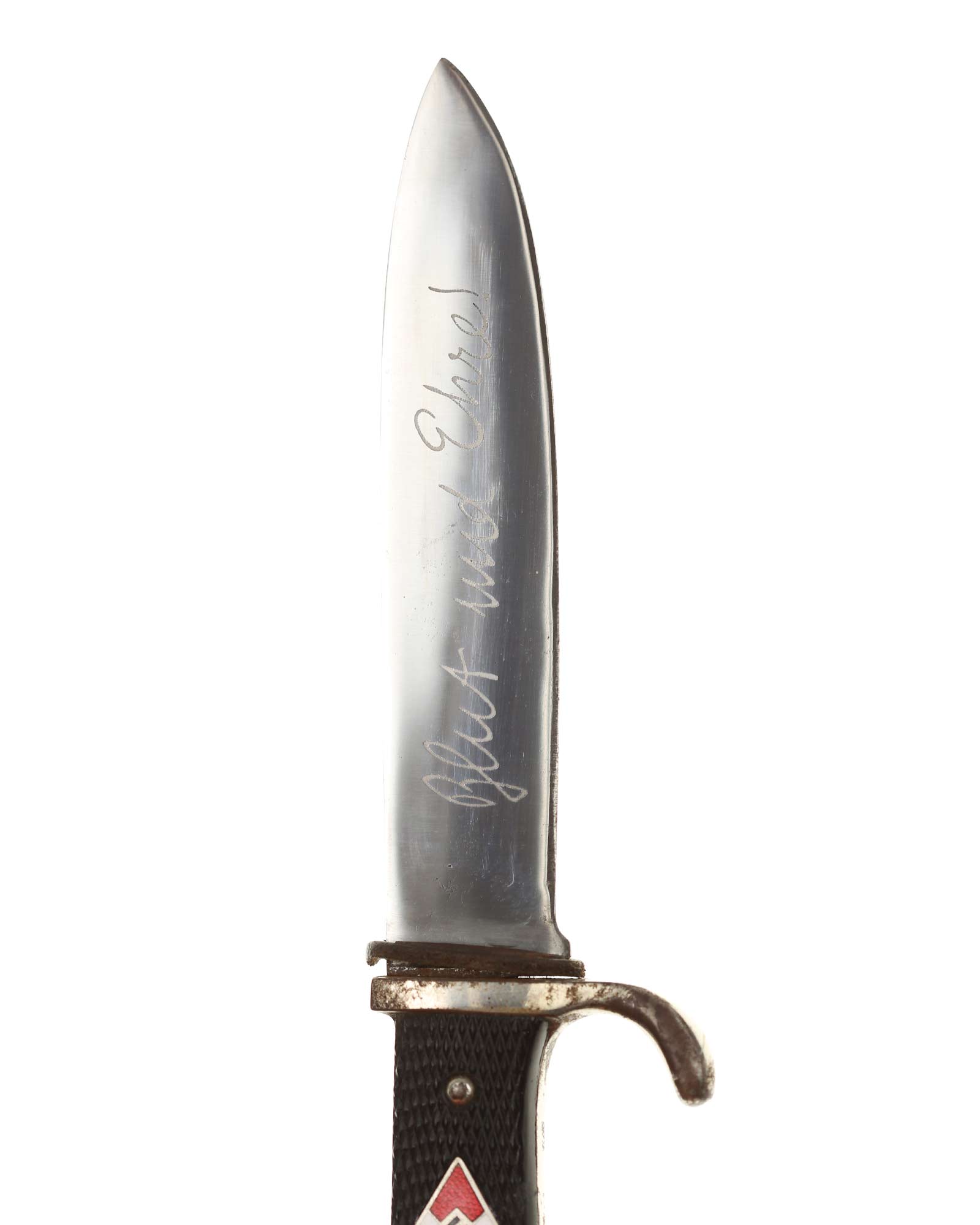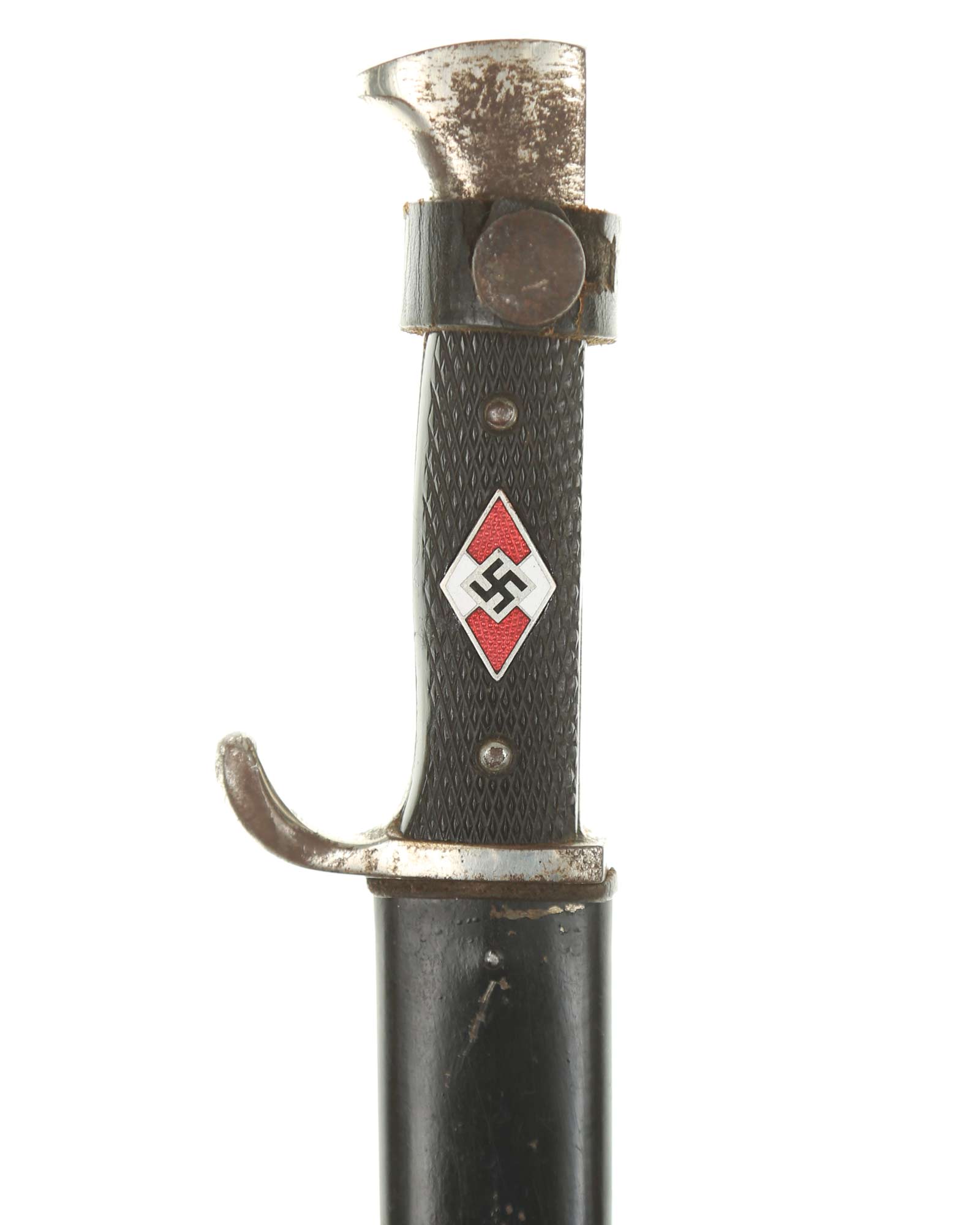 Рукоять: Рукоять ножа с черными пластиковыми щечками и эмалевой эмблемой "Гитлер Югенд". С обеих сторон бакелитовые накладки интенсивно чёрного цвета с рифленым рисунком. На лицевой стороне в центре эмблема организации «Гитлерюгенд» (также HJ-ромб). Крестовина литая непористая, отлита вместе с деталями рукояти из никелированного железа.