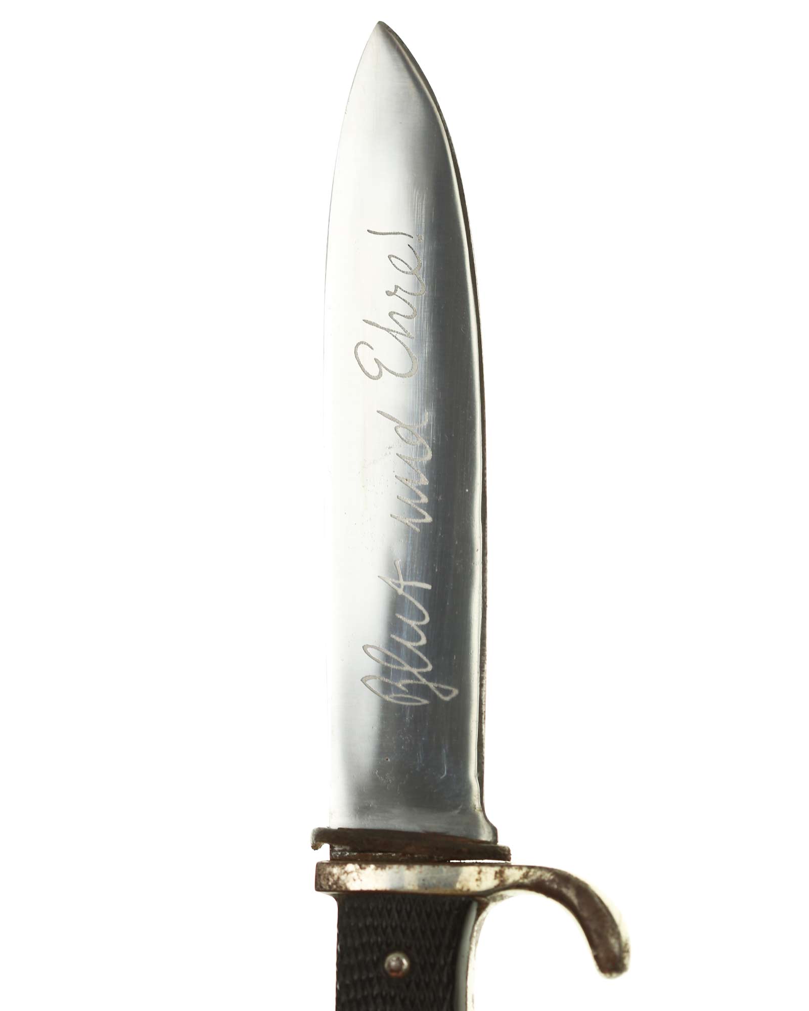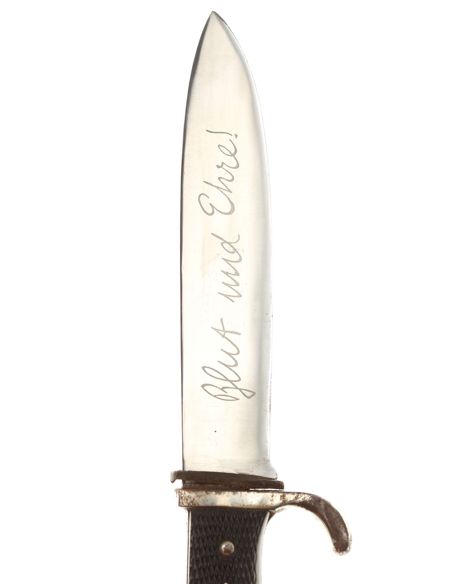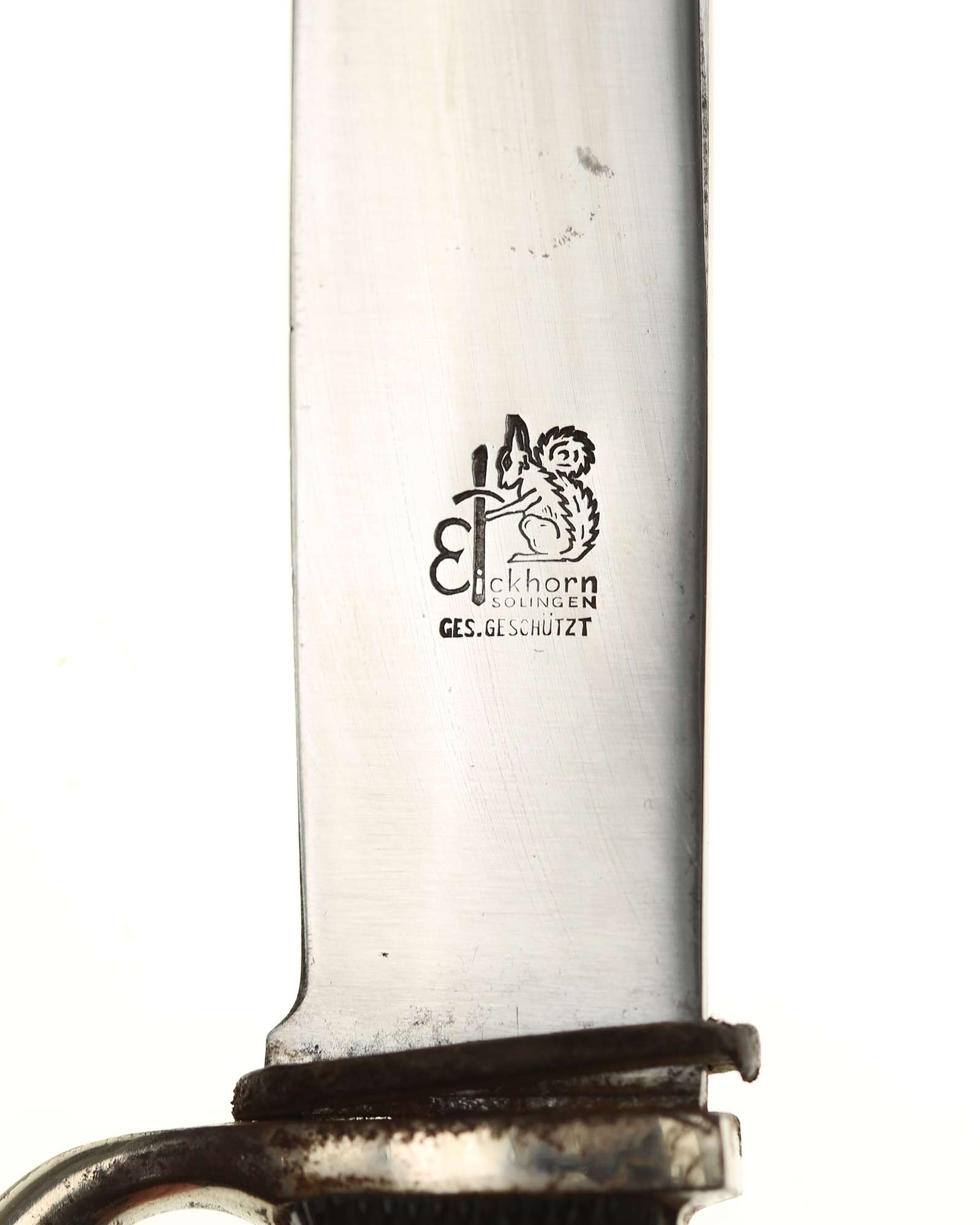 Клинок: Клинок никелированный, с одной стороны помещен девиз - "Кровь и честь" (нем. Blut und Ehre), с другой клеймо производителя Carl Eickhorn Solingen.