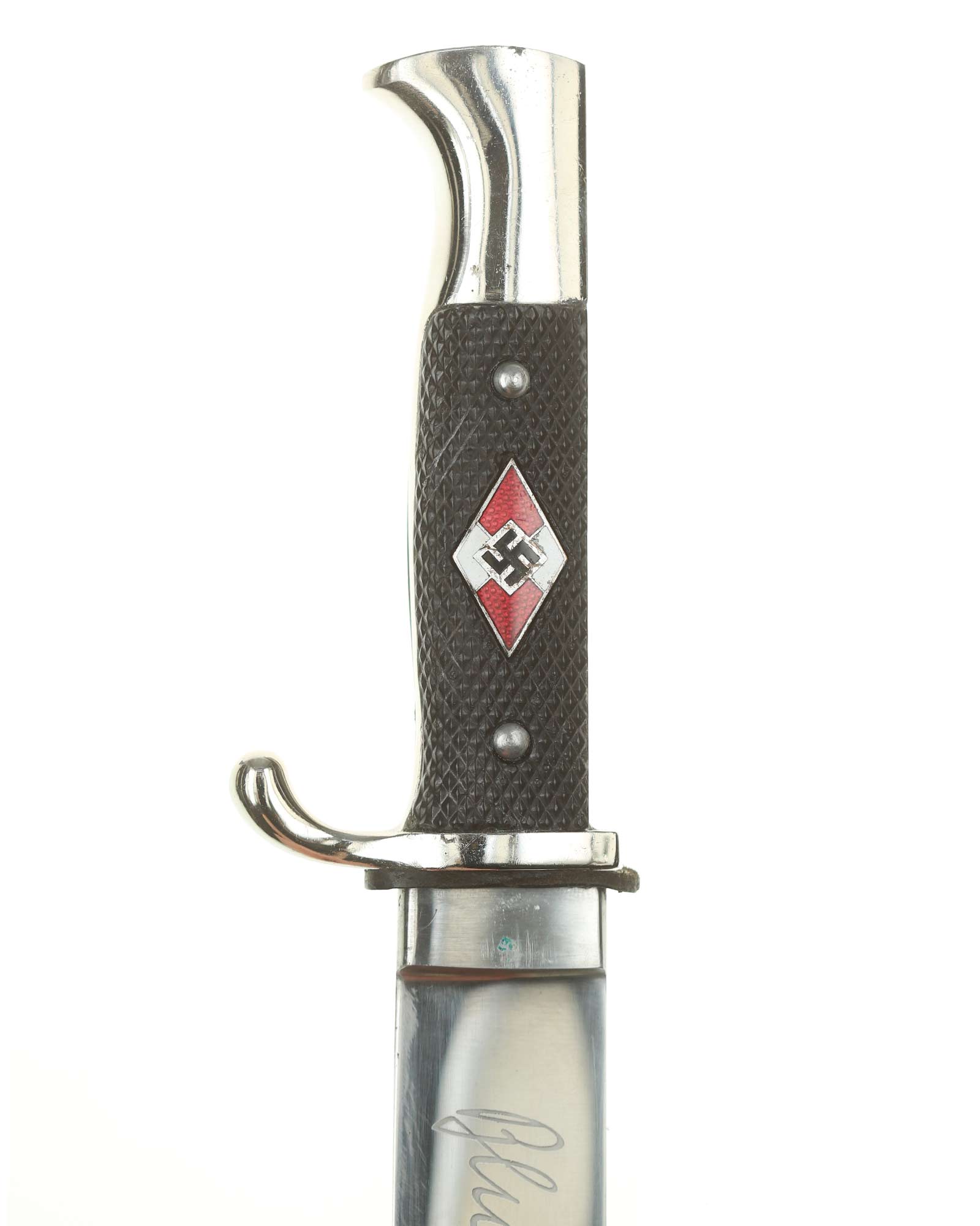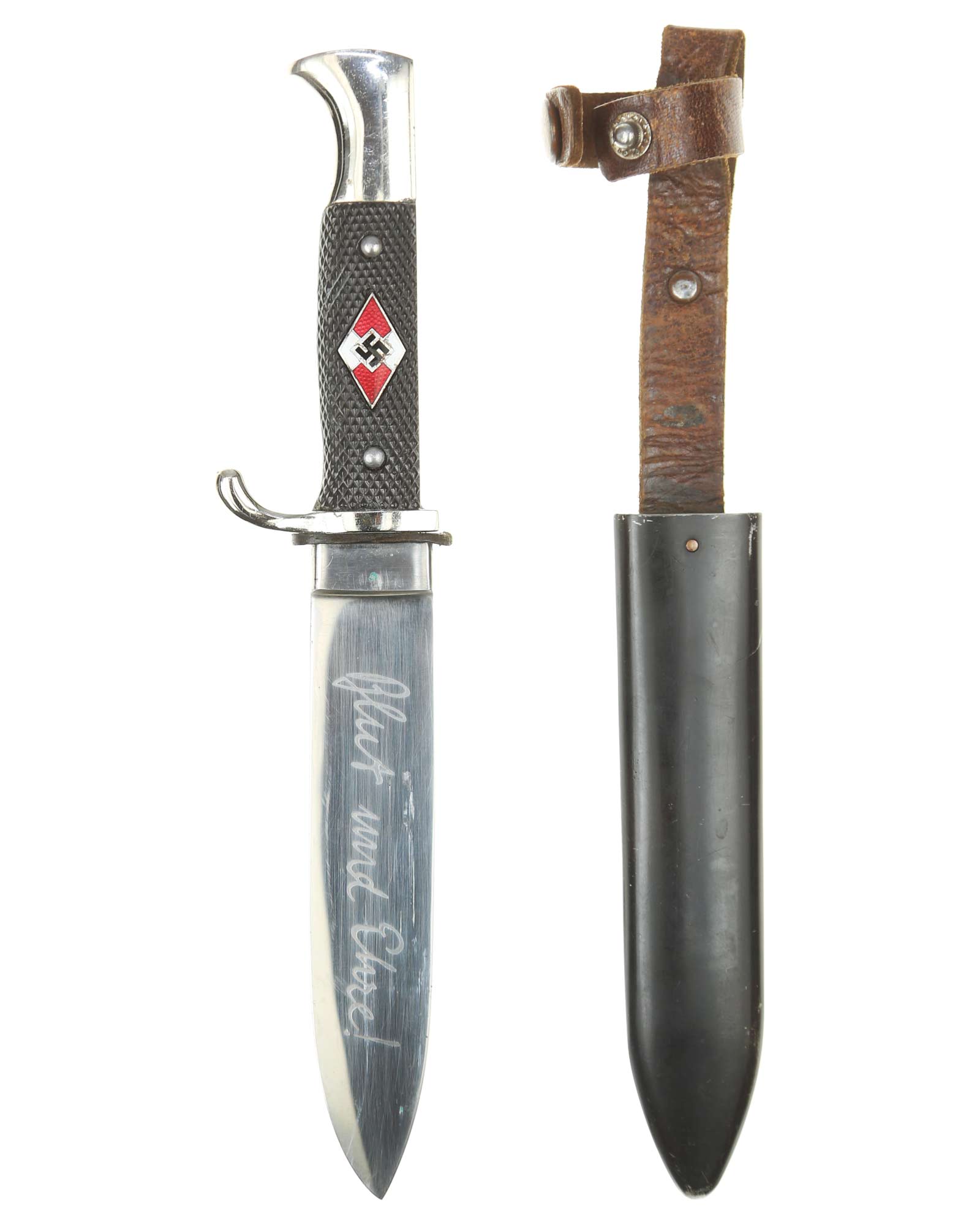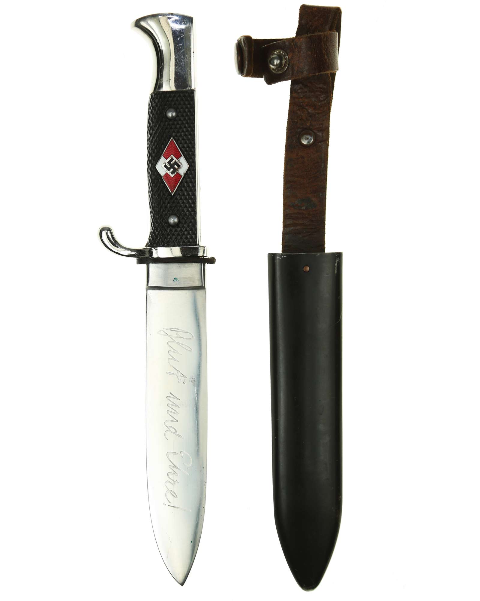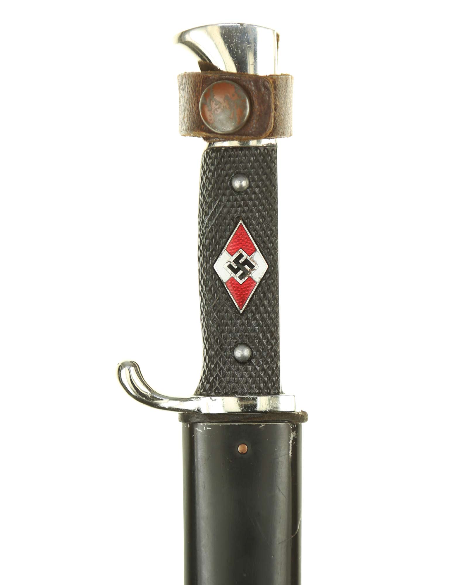 Рукоять: Рукоять ножа с черными пластиковыми щечками и эмалевой эмблемой "Гитлер Югенд". С обеих сторон бакелитовые накладки интенсивно чёрного цвета с рифленым рисунком. На лицевой стороне в центре эмблема организации «Гитлерюгенд» (также HJ-ромб). Крестовина литая непористая, отлита вместе с деталями рукояти из никелированного железа (магнитная).