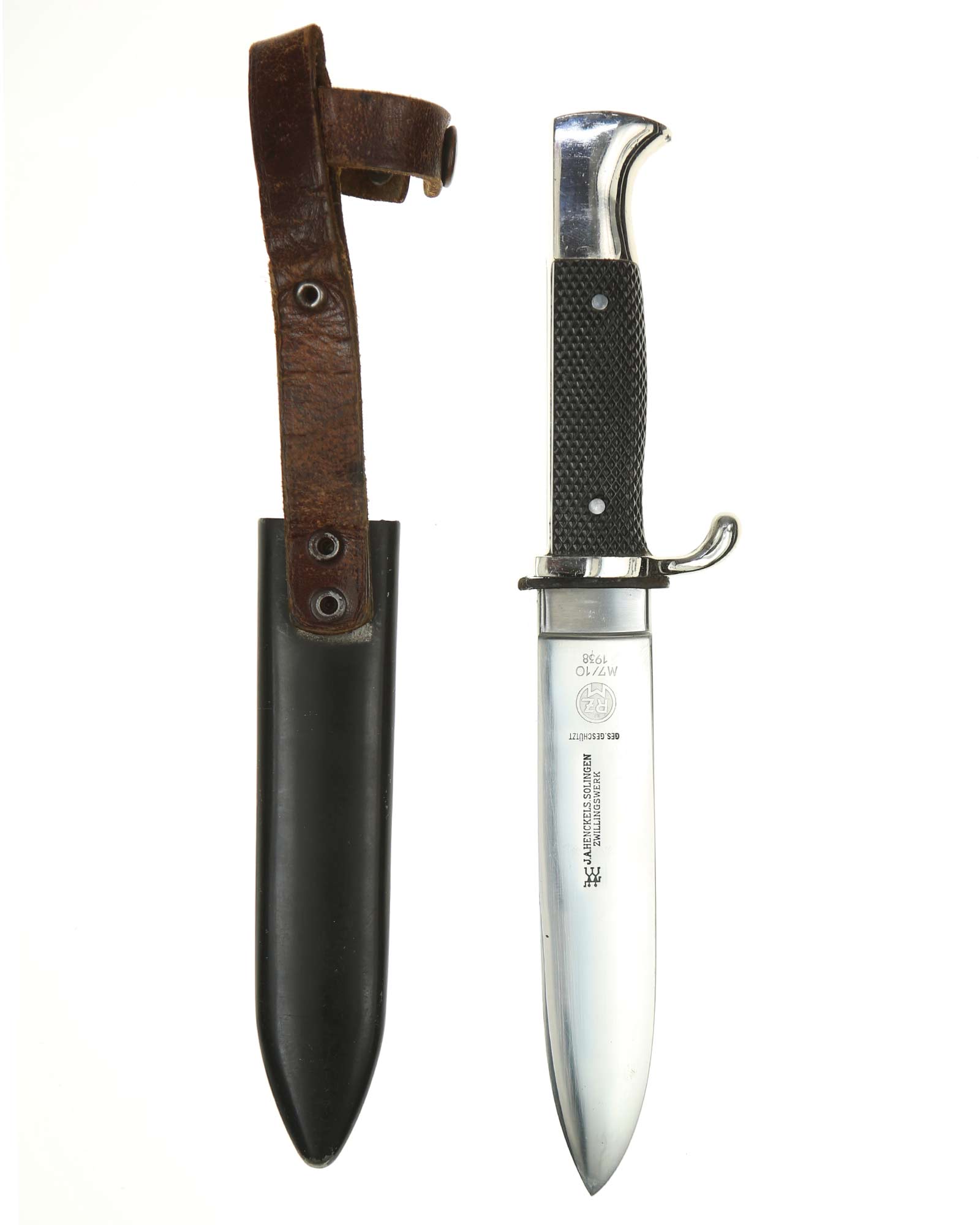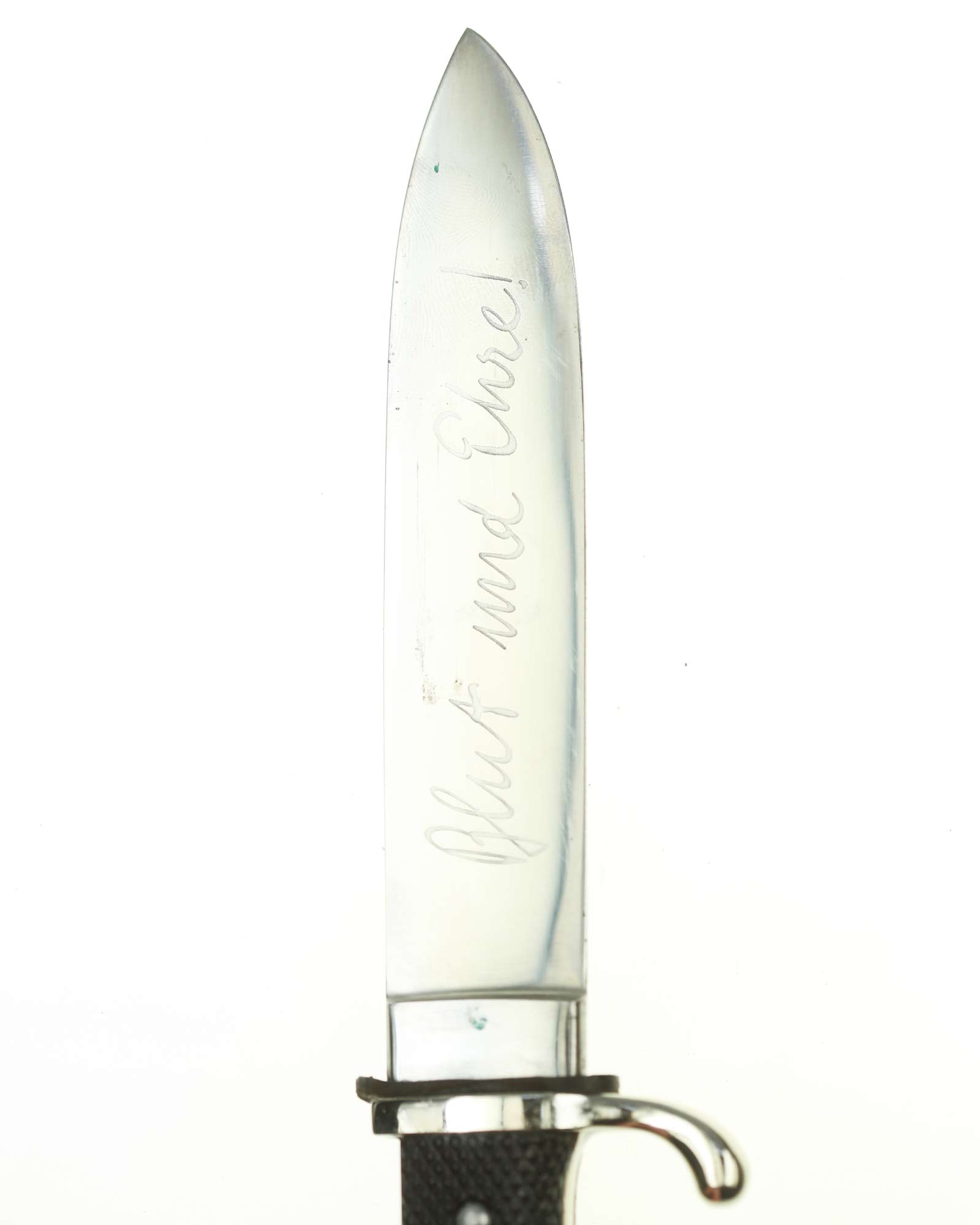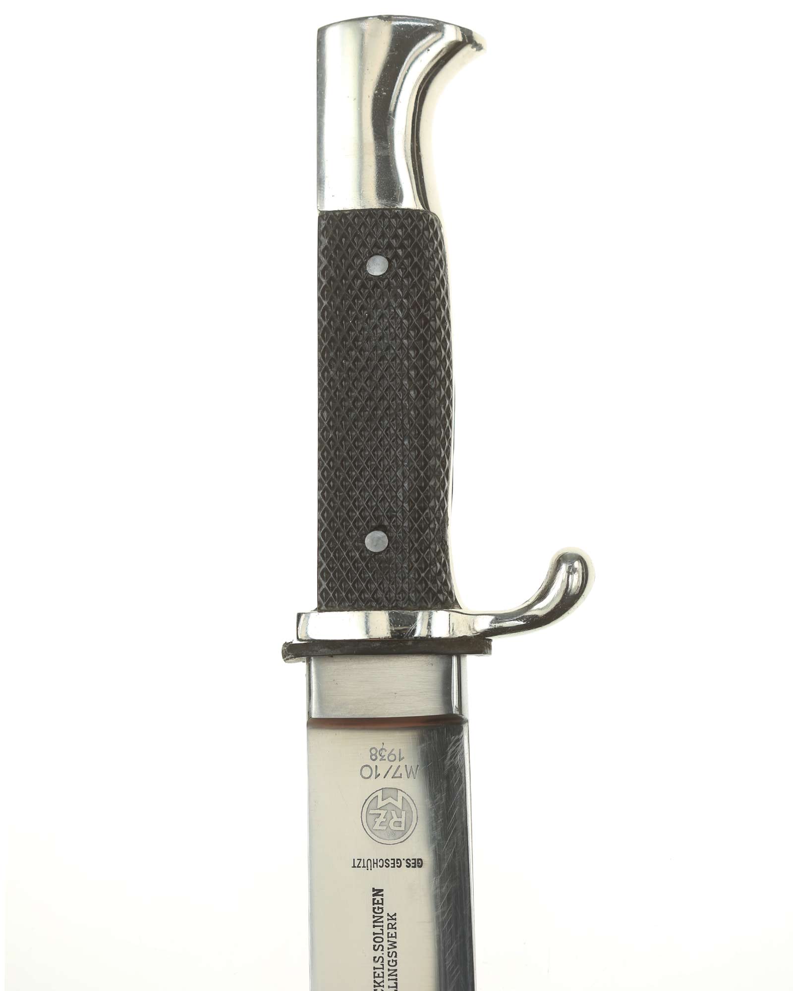 Клинок: Клинок никелированный, с одной стороны помещен девиз - "Кровь и честь" (нем. Blut und Ehre), с другой клеймо производителя J.A. Henckels Zwillingswerk Solingen (Ю.А. Хенкельс ЦВИЛЛИНГСВЕРК Золинген) и RZM M7/10.