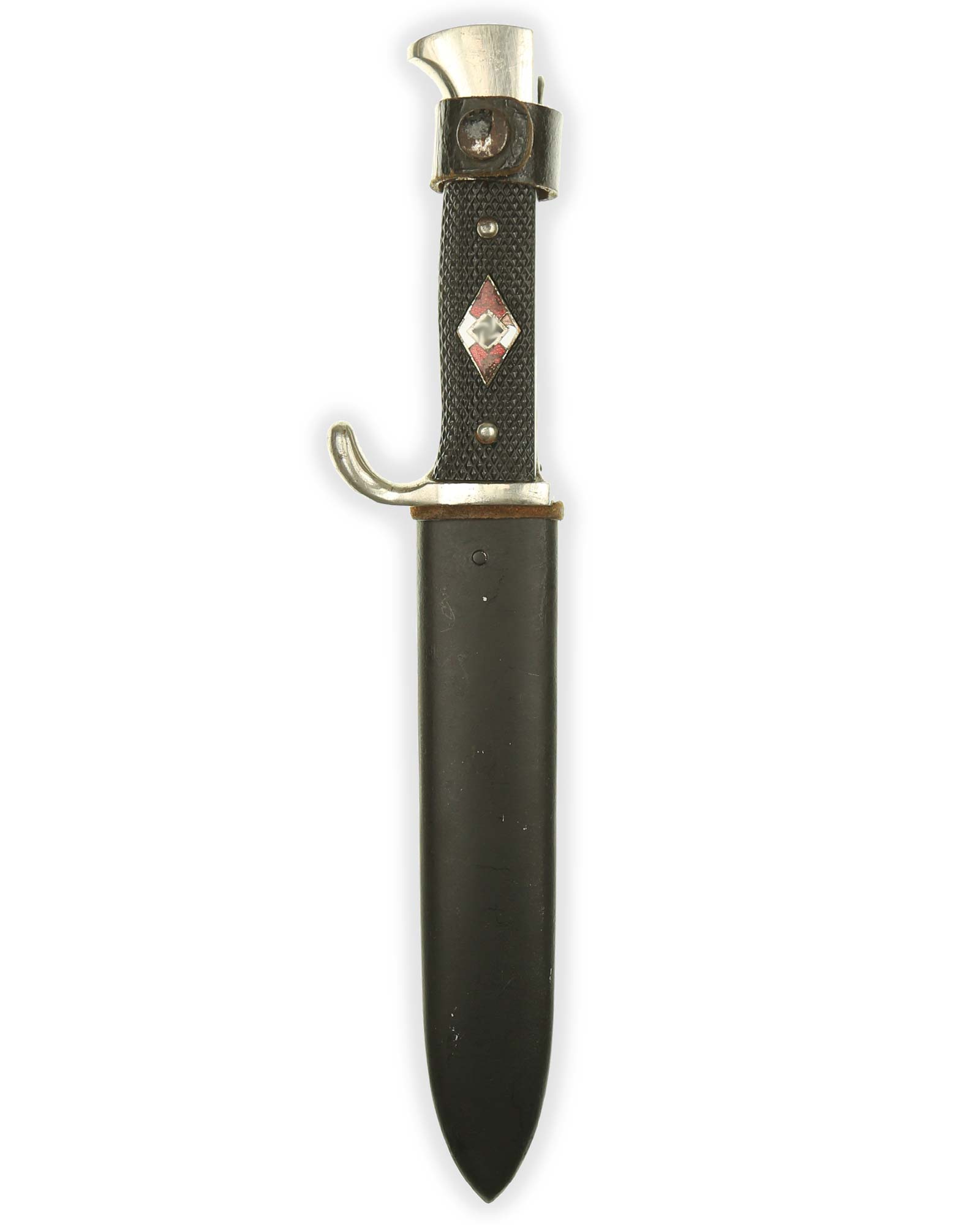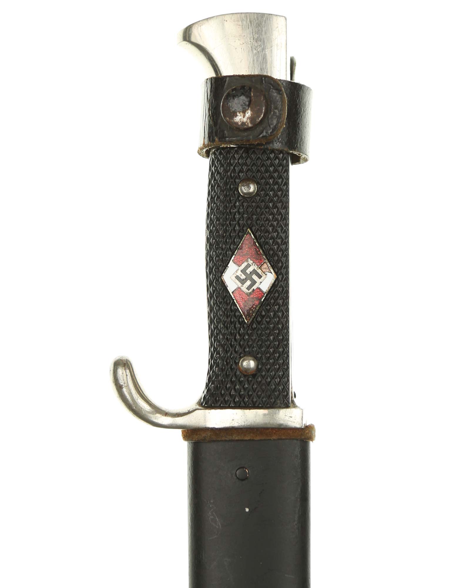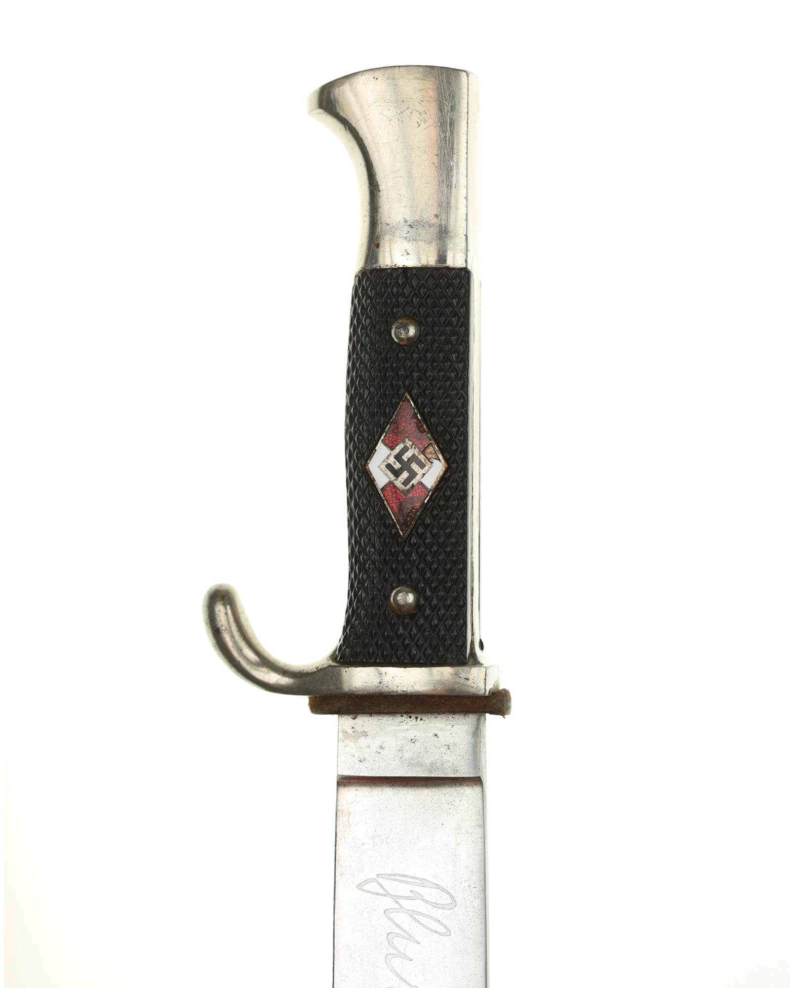 Рукоять: Рукоять ножа с черными пластиковыми щечками и эмалевой эмблемой "Гитлер Югенд". С обеих сторон бакелитовые накладки интенсивно чёрного цвета с рифленым рисунком. На лицевой стороне в центре эмблема организации «Гитлерюгенд» (также HJ-ромб). Крестовина литая непористая, отлита вместе с деталями рукояти.