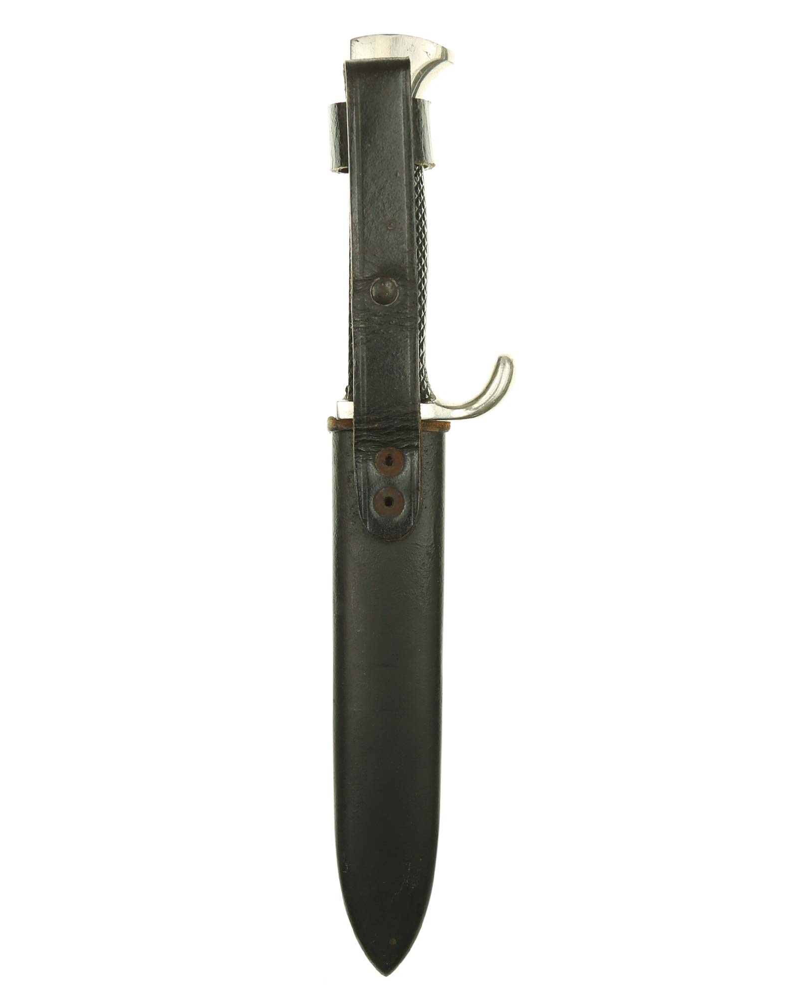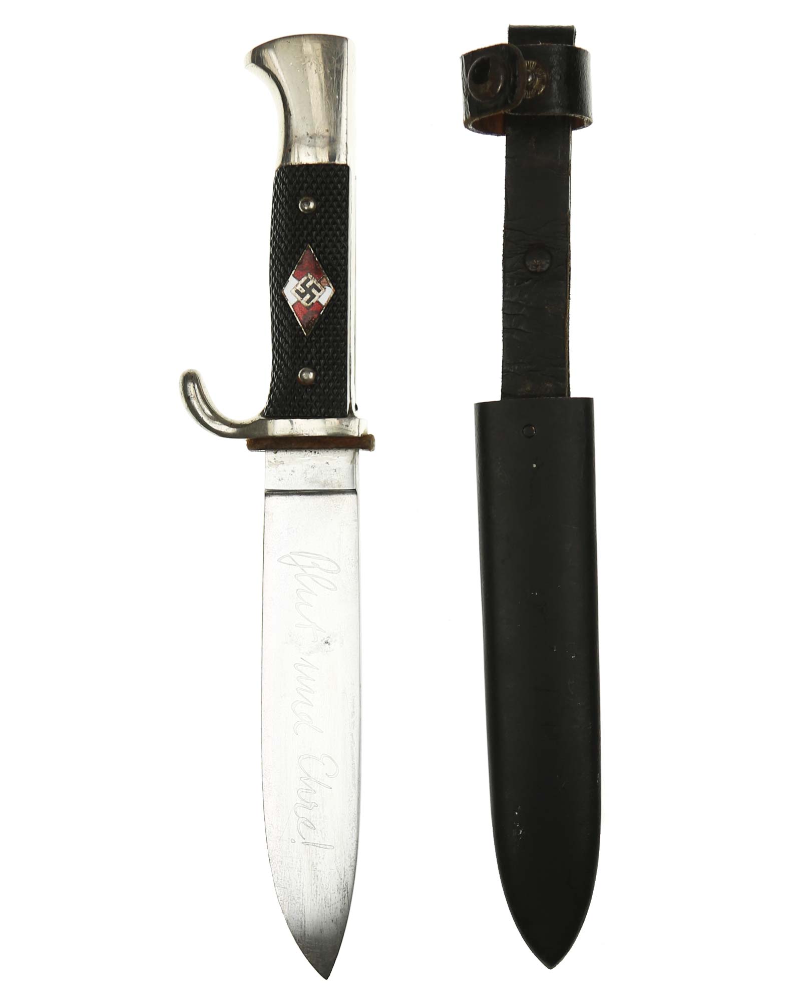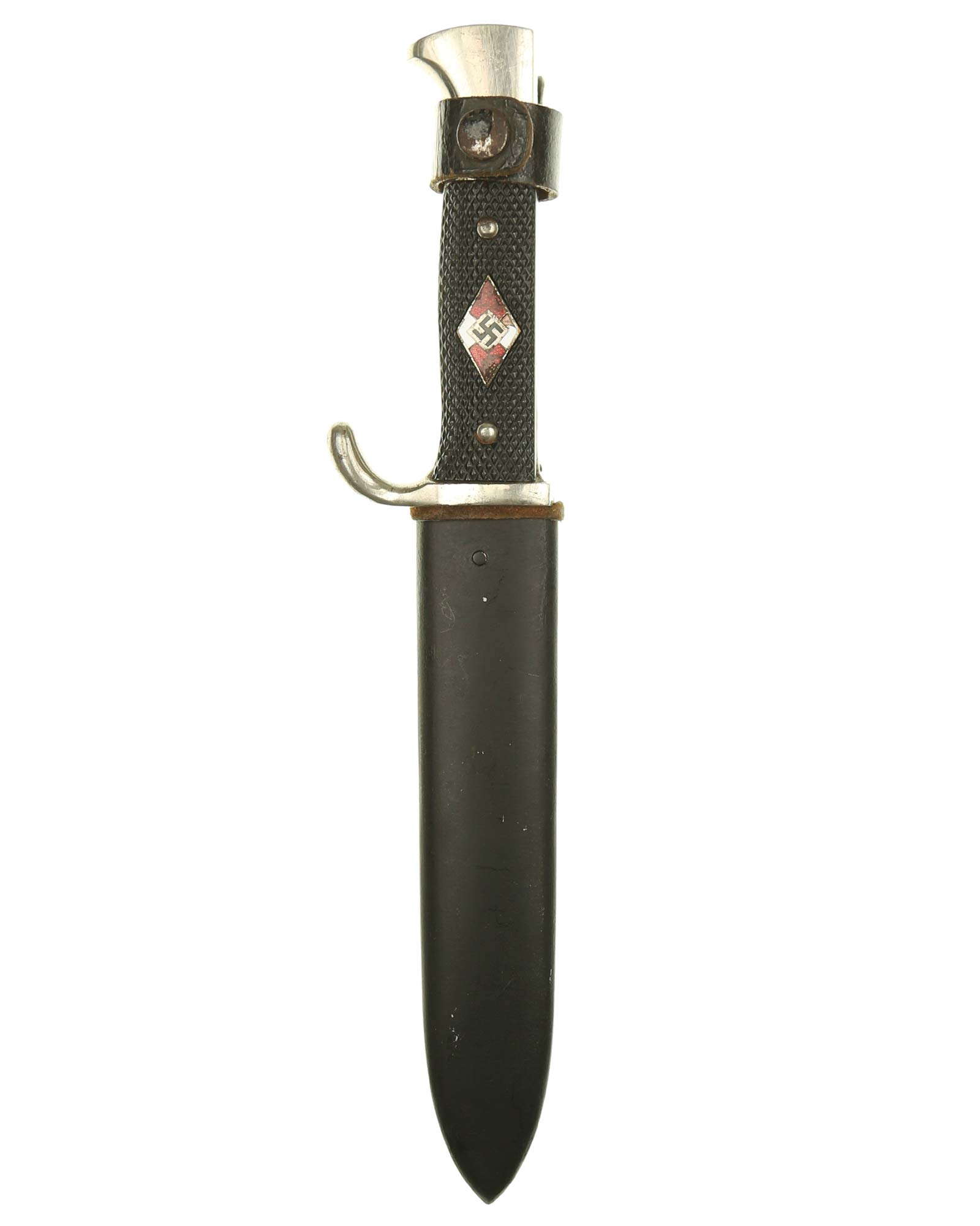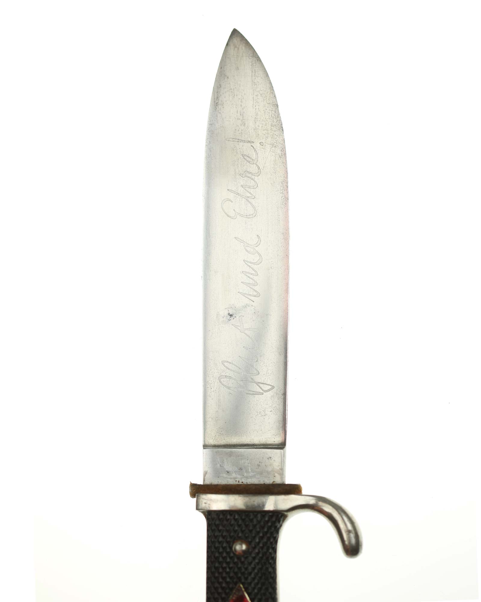 Рукоять: Рукоять ножа с черными пластиковыми щечками и эмалевой эмблемой "Гитлер Югенд". С обеих сторон бакелитовые накладки интенсивно чёрного цвета с рифленым рисунком. На лицевой стороне в центре эмблема организации «Гитлерюгенд» (также HJ-ромб). Крестовина литая непористая, отлита вместе с деталями рукояти.