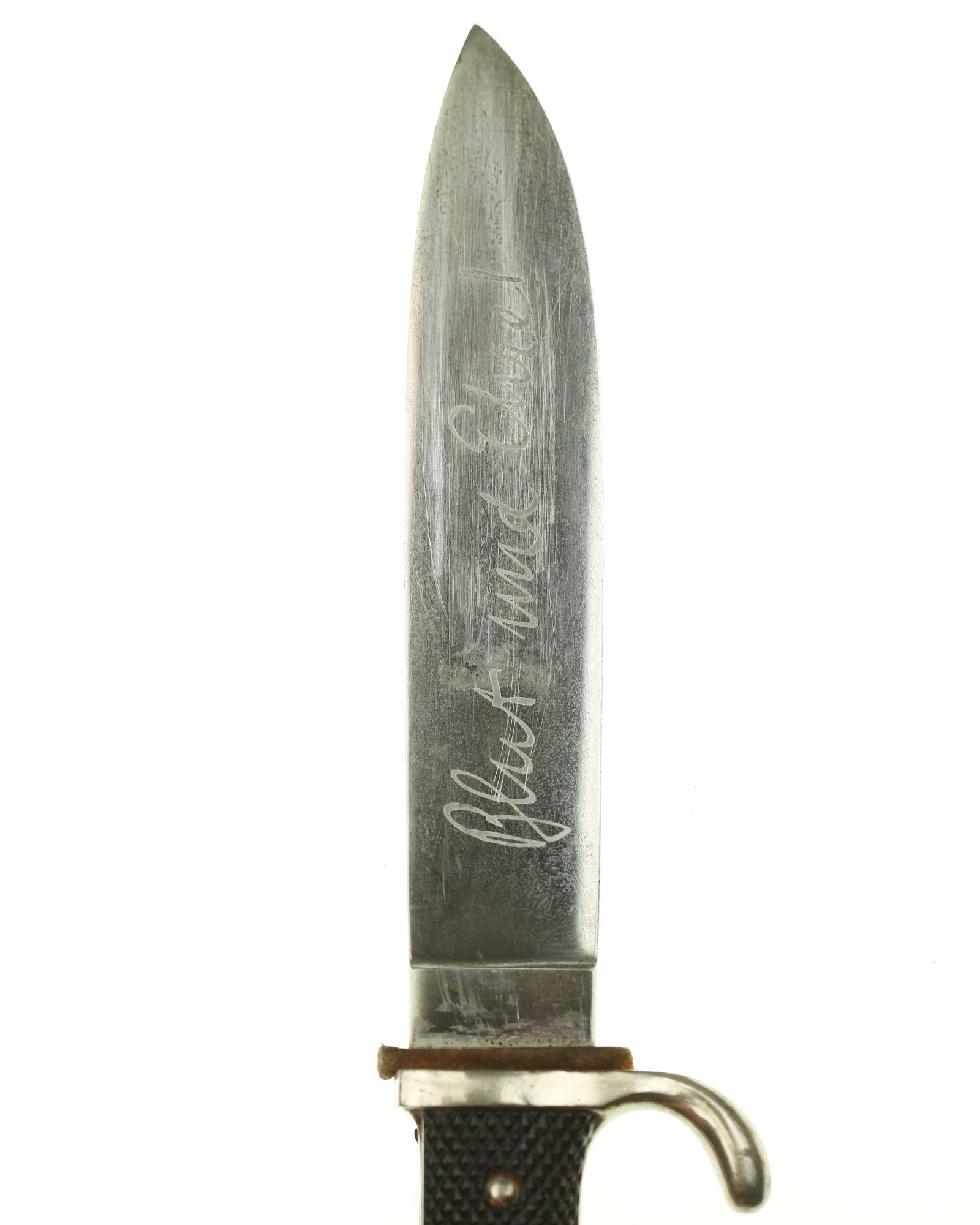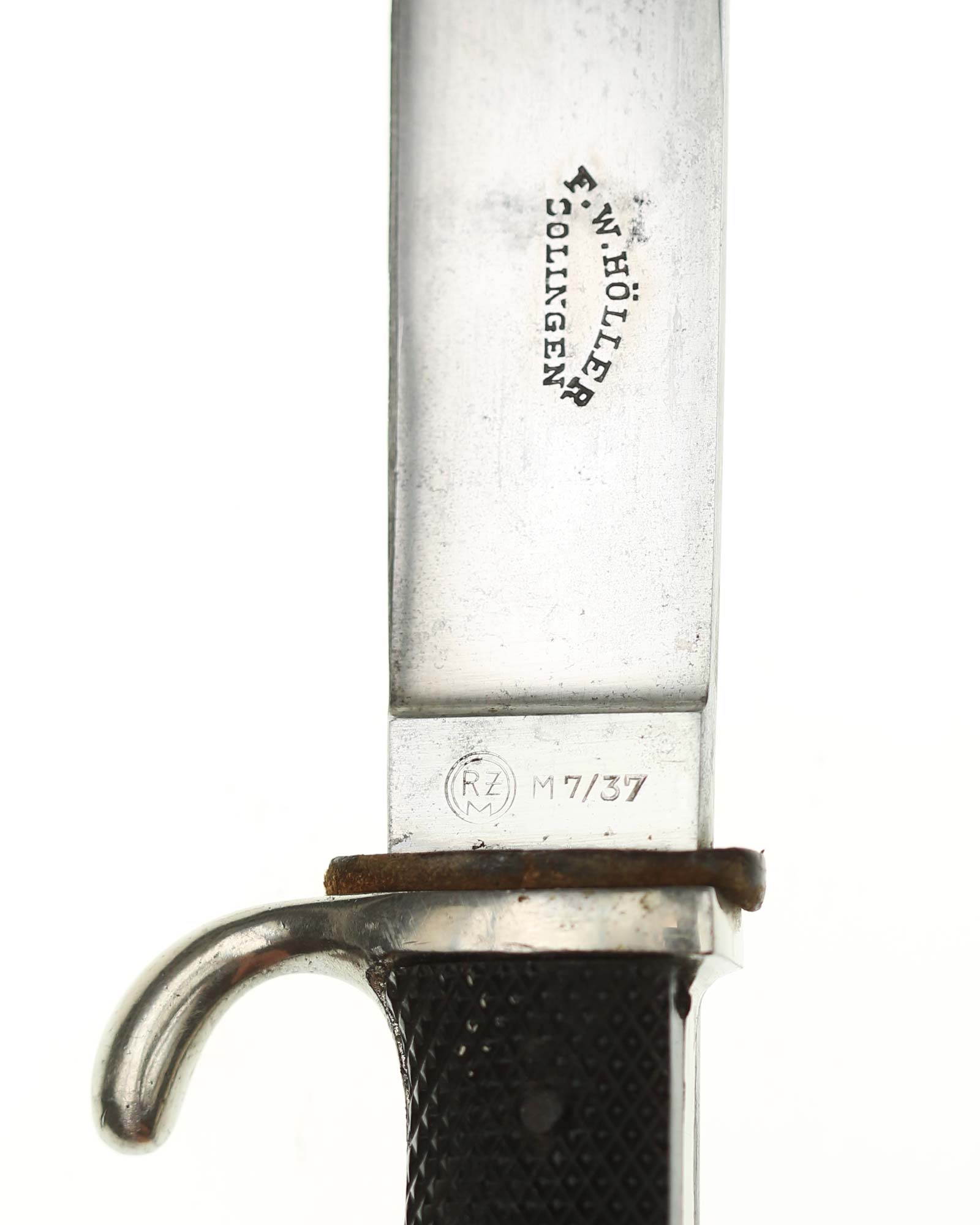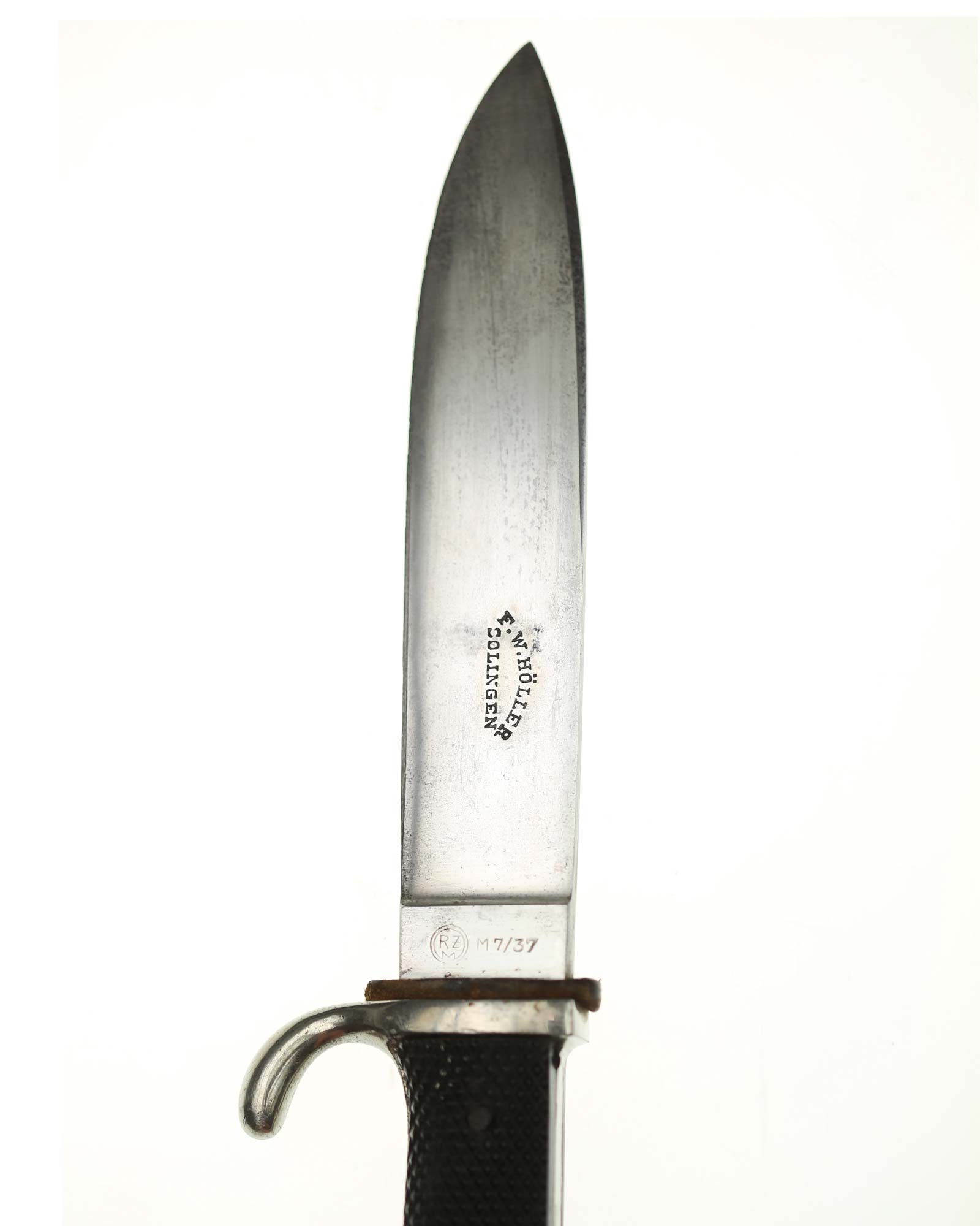 Клинок: Клинок никелированный, с одной стороны помещен девиз - "Кровь и честь" (нем. Blut und Ehre), с другой RZM клеймо производителя RZM M7/37 и F. & W. Höller Solingen (Ф. В. Хёллер Золинген)..