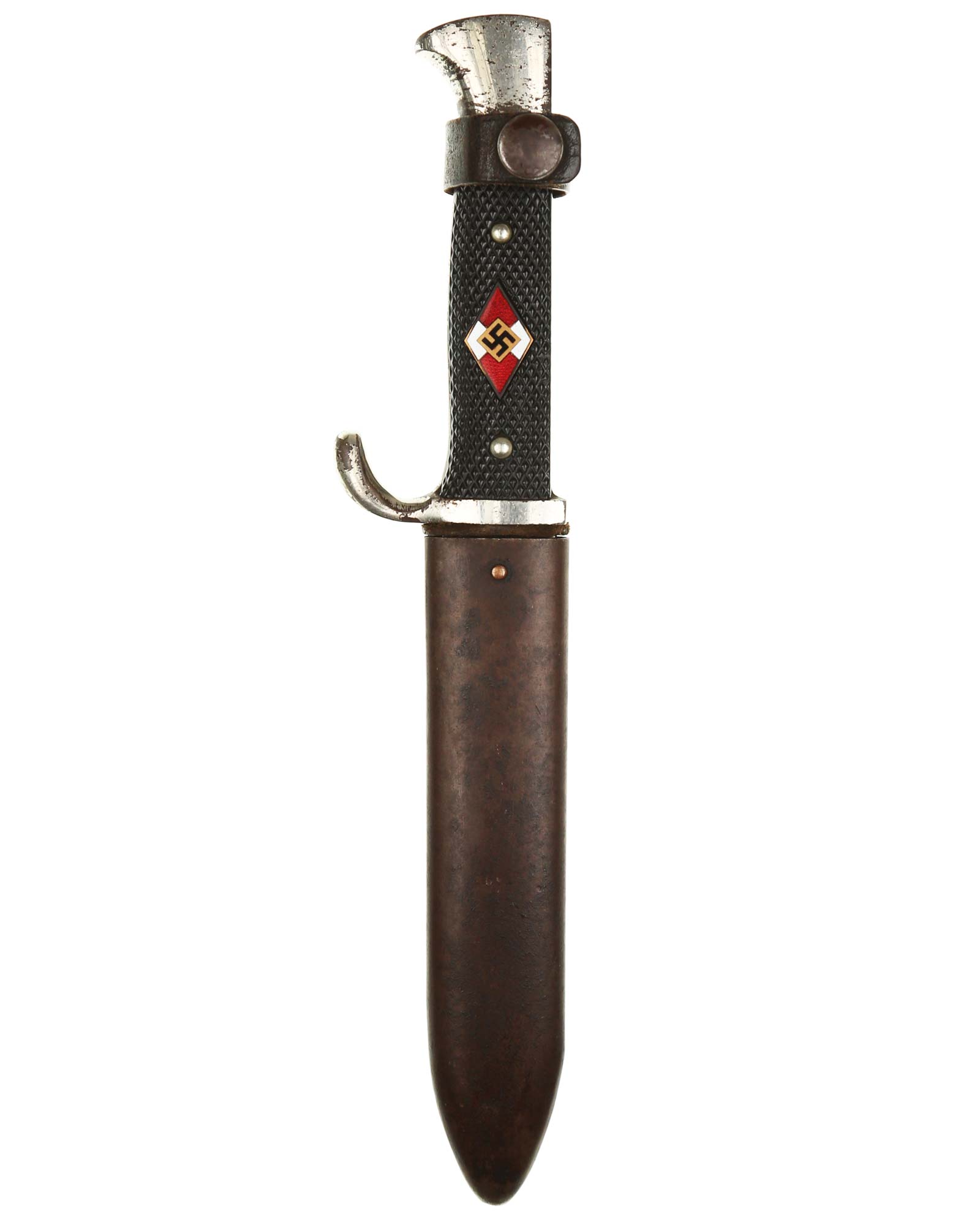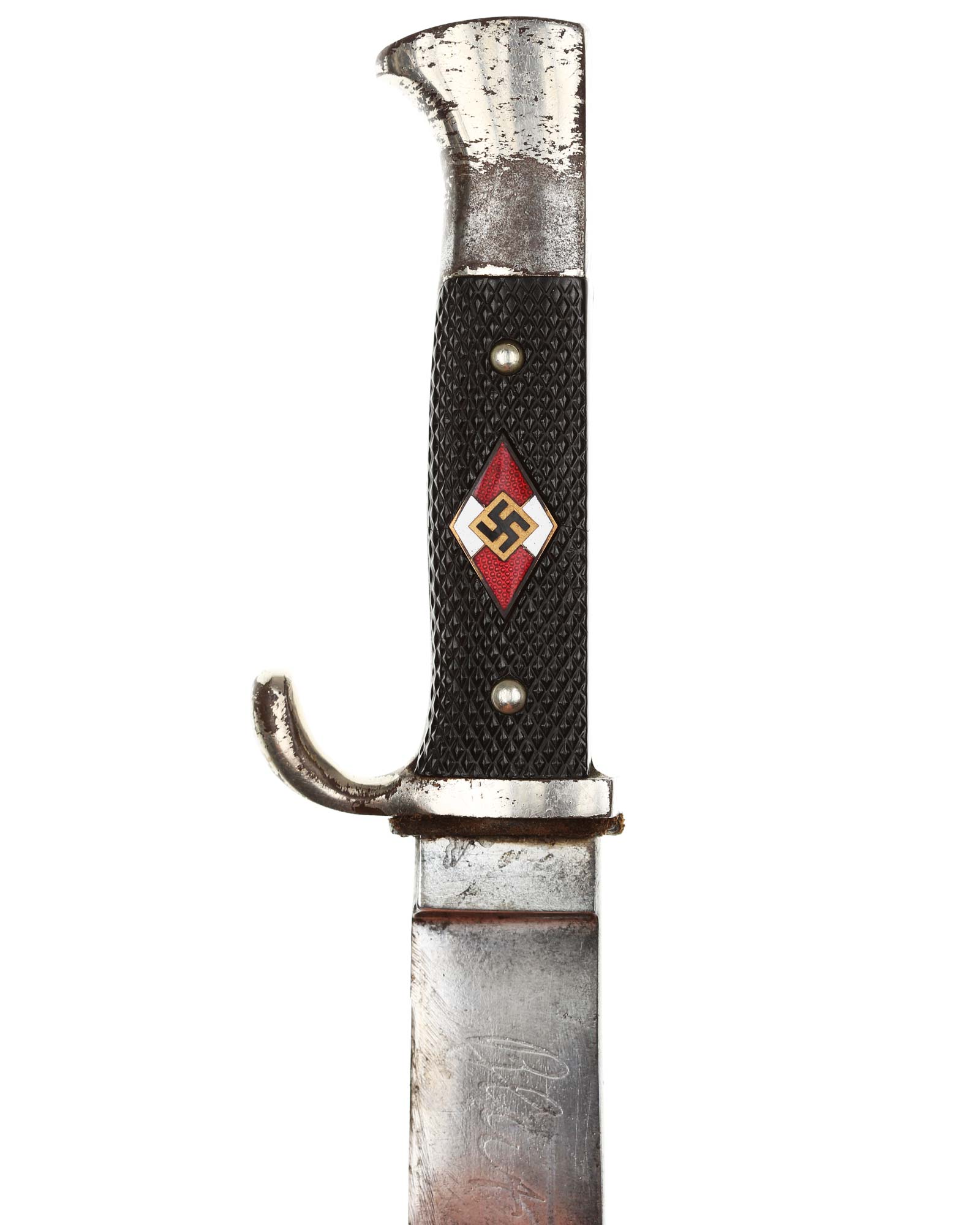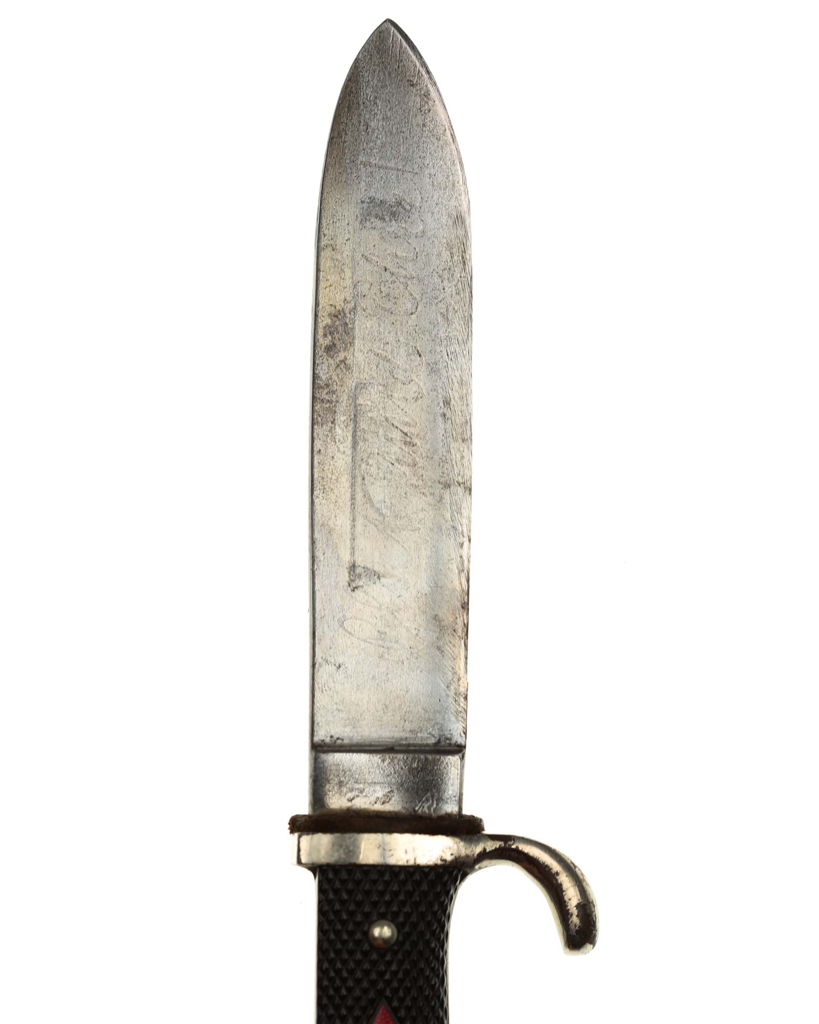 Рукоять: Рукоять ножа с черными пластиковыми щечками и эмалевой эмблемой "Гитлер Югенд". На лицевой стороне в центре эмблема организации «Гитлерюгенд» (также HJ-ромб).