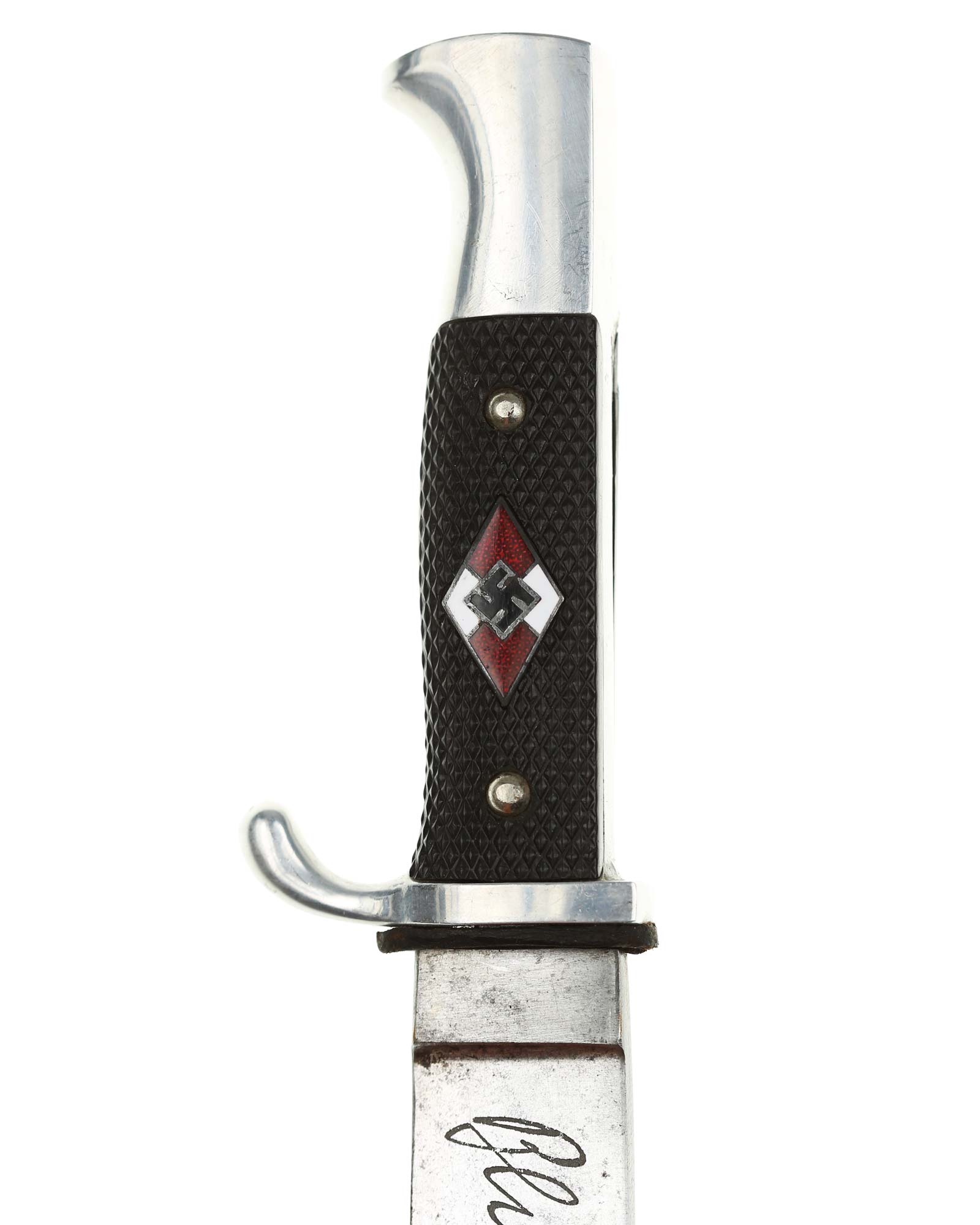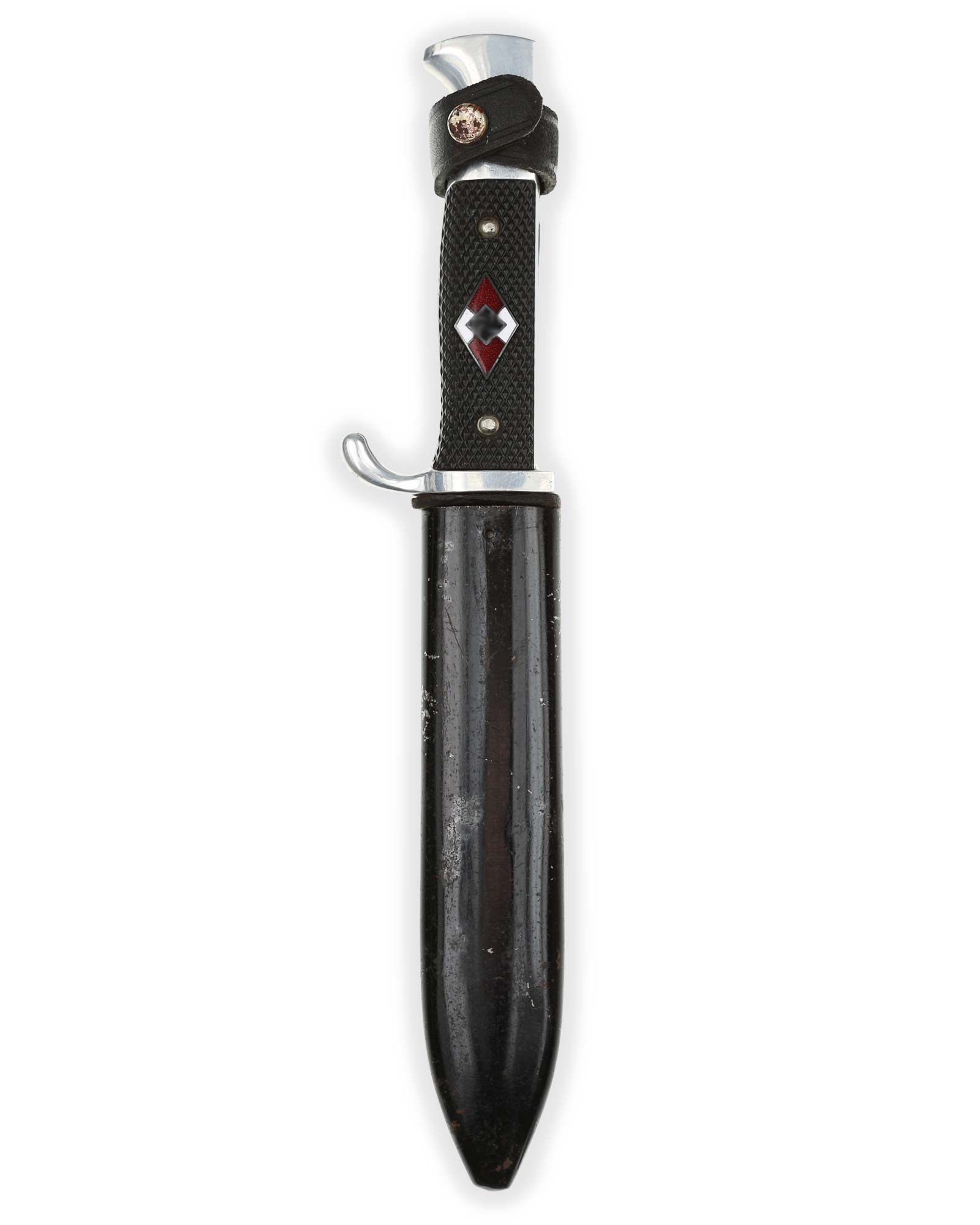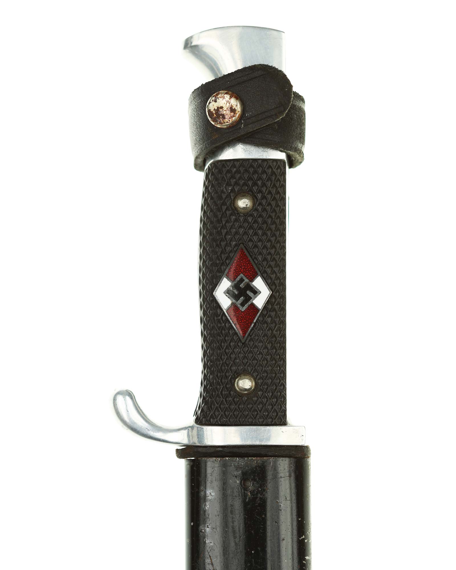 Рукоять: Рукоять ножа с черными пластиковыми щечками и эмалевой эмблемой "Гитлер Югенд". С обеих сторон бакелитовые накладки интенсивно чёрного цвета с рифленым рисунком. На лицевой стороне в центре эмблема организации «Гитлерюгенд» (также HJ-ромб). Крестовина литая непористая, отлита вместе с деталями рукояти из никелированного железа.
