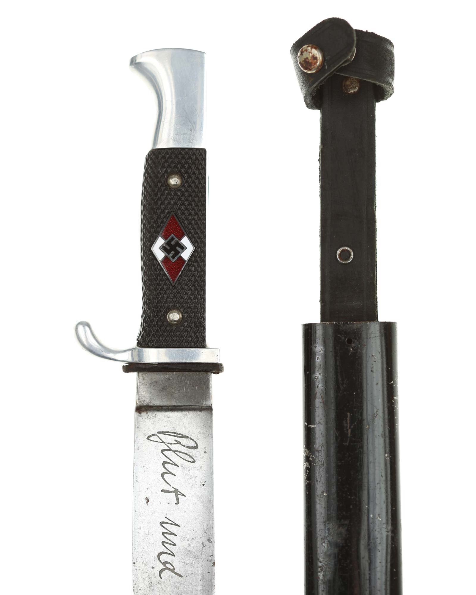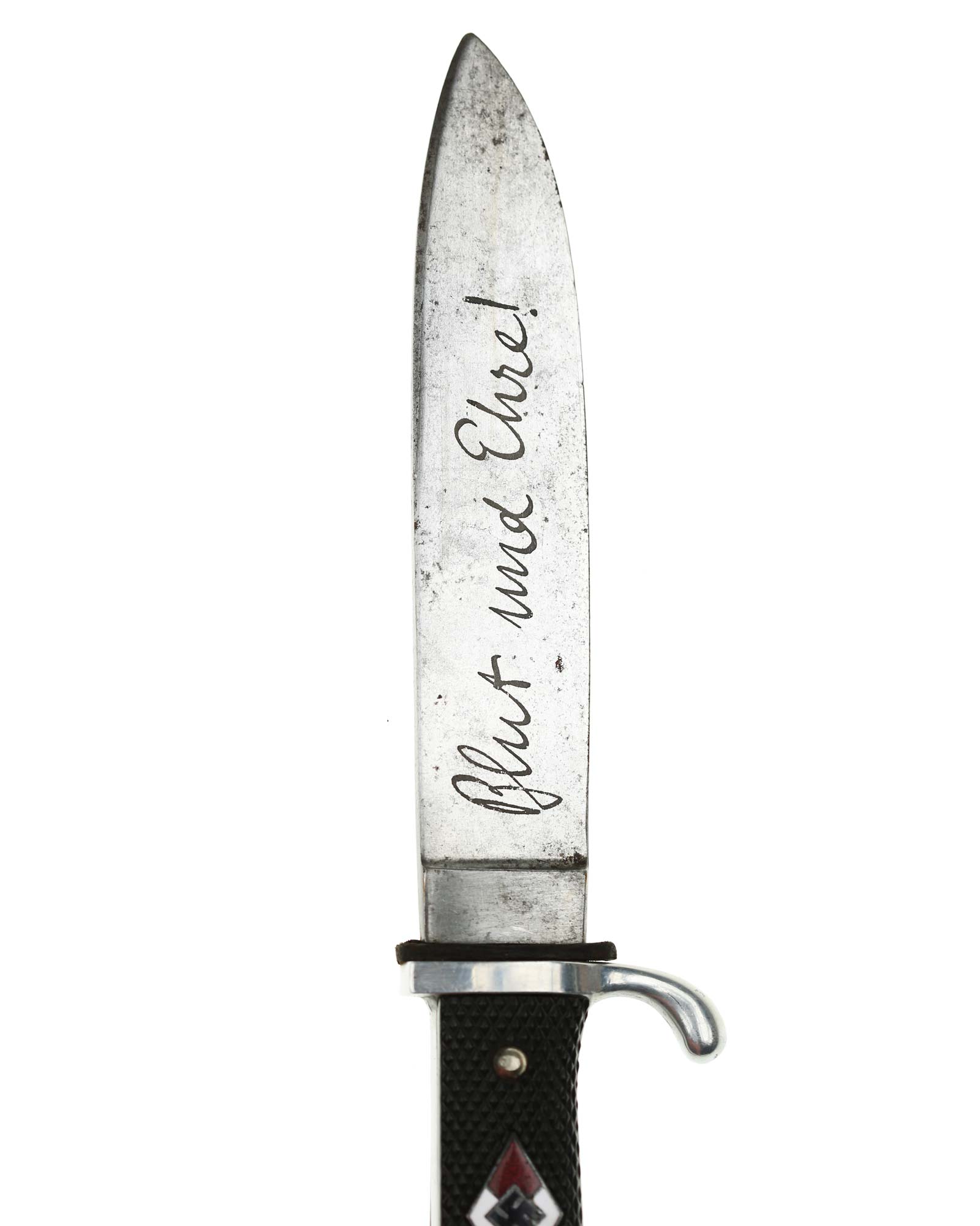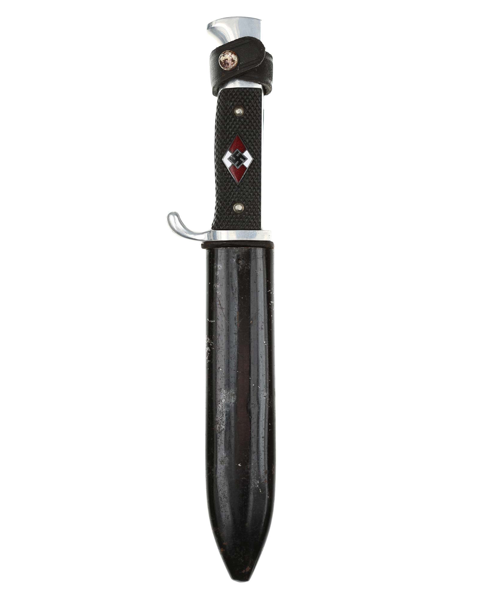 Рукоять: Рукоять ножа с черными пластиковыми щечками и эмалевой эмблемой "Гитлер Югенд". С обеих сторон бакелитовые накладки интенсивно чёрного цвета с рифленым рисунком. На лицевой стороне в центре эмблема организации «Гитлерюгенд» (также HJ-ромб). Крестовина литая непористая, отлита вместе с деталями рукояти из никелированного железа.