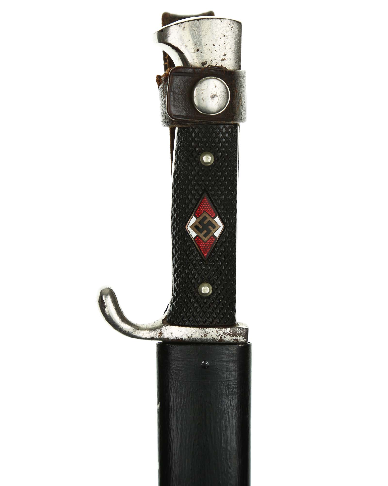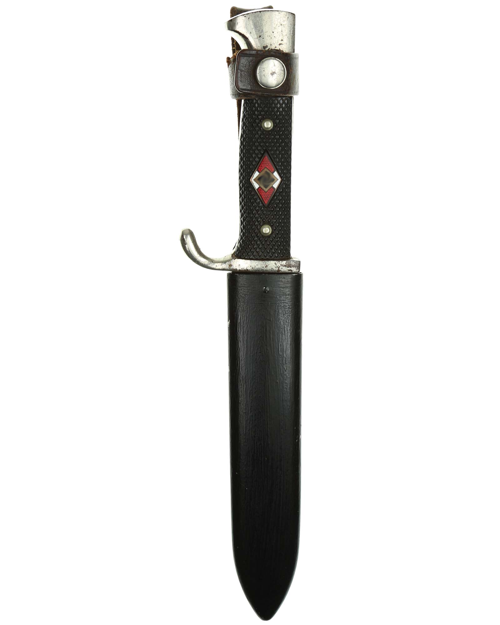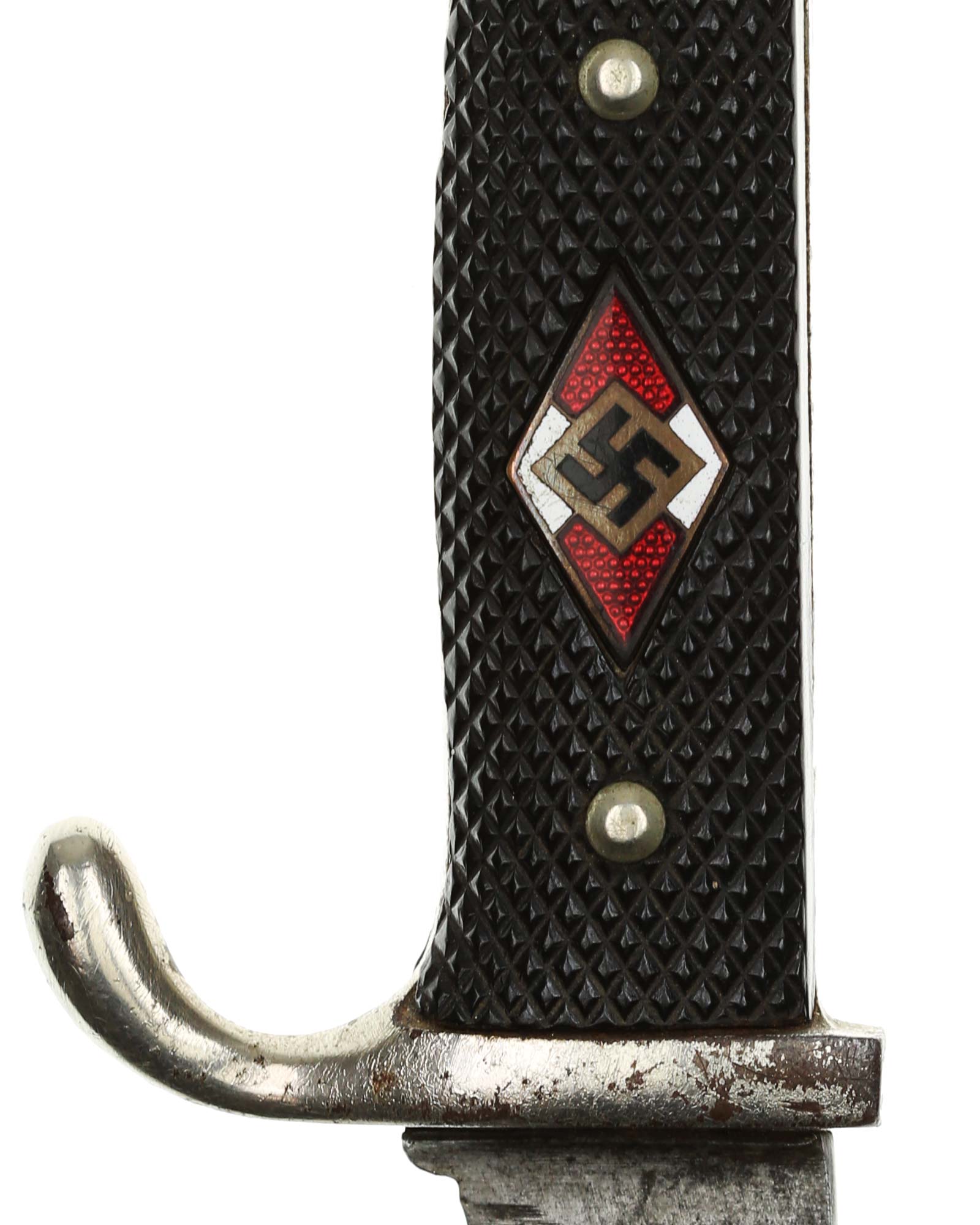 Рукоять: Рукоять ножа с черными пластиковыми щечками и эмалевой эмблемой "Гитлер Югенд". С обеих сторон бакелитовые накладки интенсивно чёрного цвета с рифленым рисунком. На лицевой стороне в центре эмблема организации «Гитлерюгенд» (также HJ-ромб). Крестовина литая непористая, отлита вместе с деталями рукояти из никелированного железа (магнитная).
