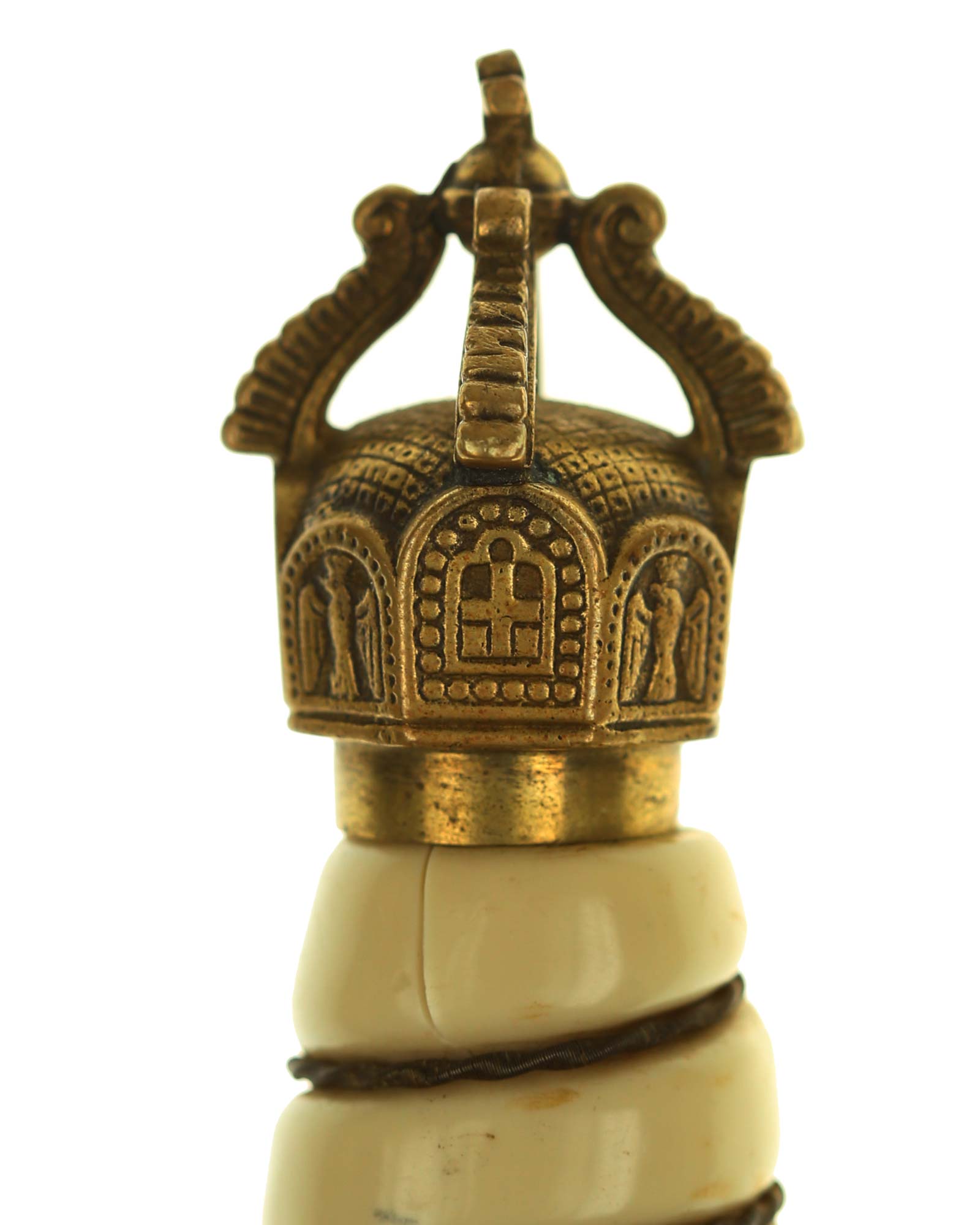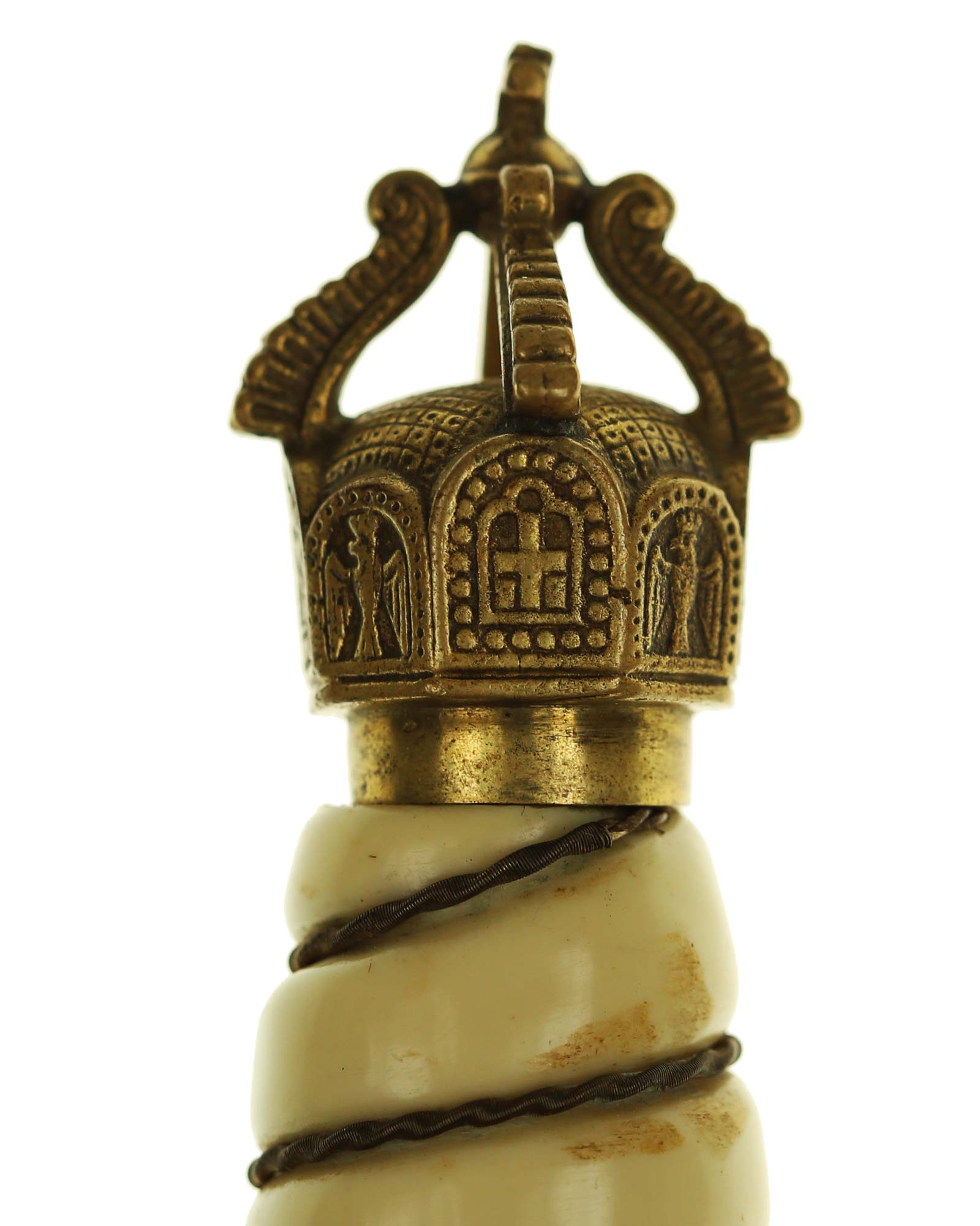 Рукоять: Рукоять овального сечения, бочкообразная. По спиральному желобку рукоять обвита стальной проволокой. Головка рукояти выполнена в виде императорской короны. Крестовина литая, латунная. Перекрестье с обеих сторон украшено изображением обвитого канатом перевернутого якоря. В центре крестовины укреплена подпружиненная кнопка, предназначенная для фиксации кортика в ножнах. Под перекрестьем имеется овальная плоская латунная шайба. Отлично сохранилось оригинальное позолоченное покрытие.