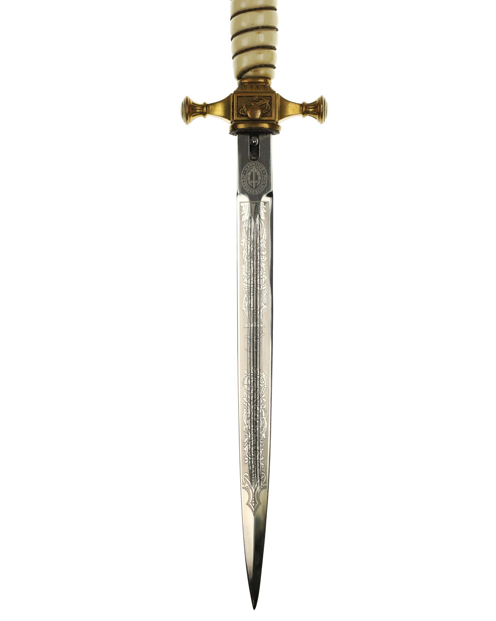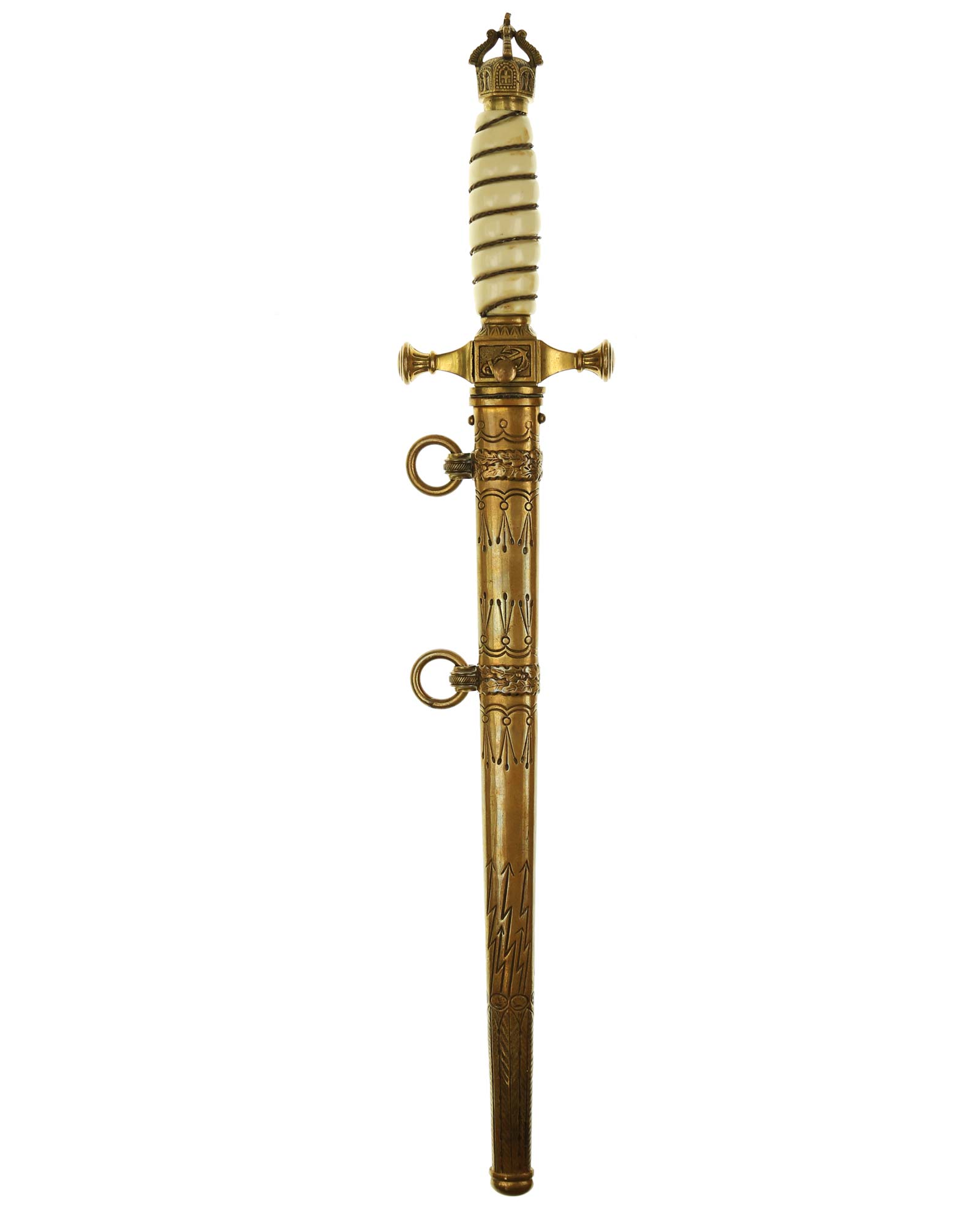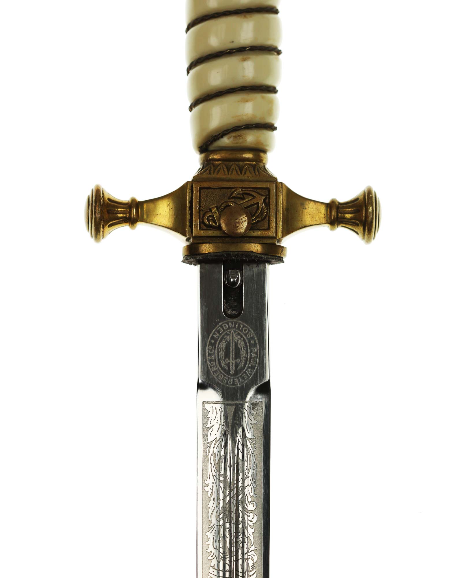 Клинок: Клинок стальной, прямой, двулезвийный, ромбического сечения, никелированный, с двумя долами. На клинке с двух сторон украшен травлением с изображением растительного орнамента и морской арматуры (якорь, обвитый канатом). На пяте клинка хорошо различимо клеймо фирмы-производителя - «Paul Weyersberg Solingen» — клеймо немецкой фирмы Пауль Вайерсберг Золинген.