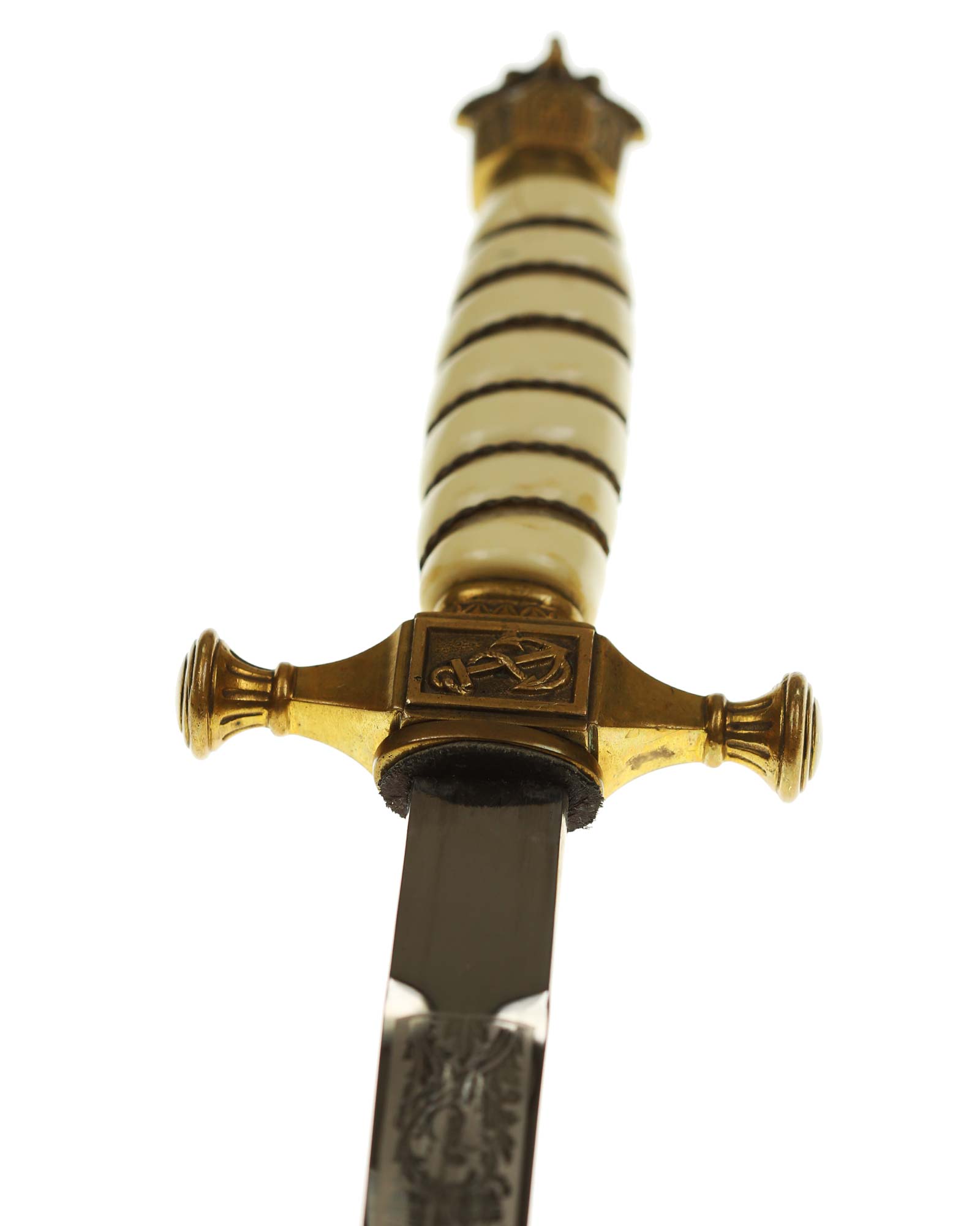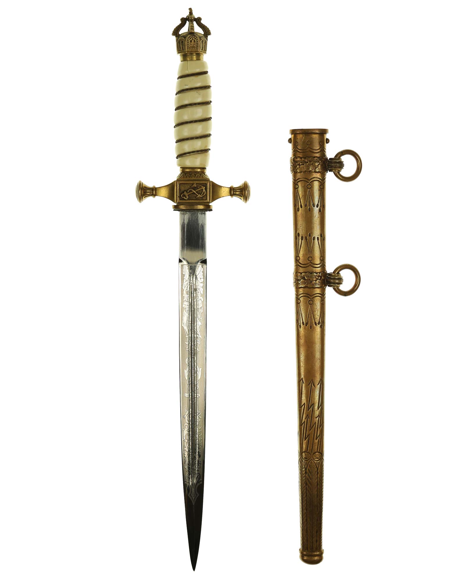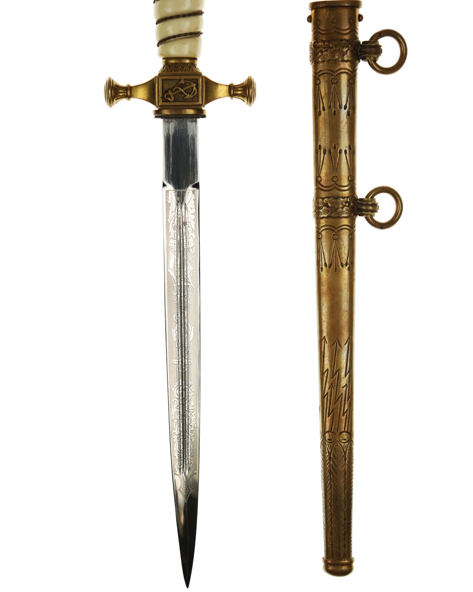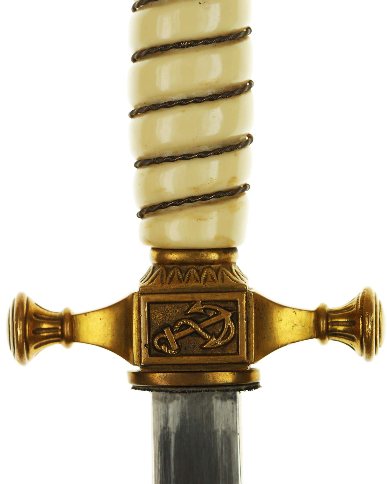 Клинок: Клинок стальной, прямой, двулезвийный, ромбического сечения, никелированный, с двумя долами. На клинке с двух сторон украшен травлением с изображением растительного орнамента и морской арматуры (якорь, обвитый канатом). На пяте клинка хорошо различимо клеймо фирмы-производителя - «Paul Weyersberg Solingen» — клеймо немецкой фирмы Пауль Вайерсберг Золинген.