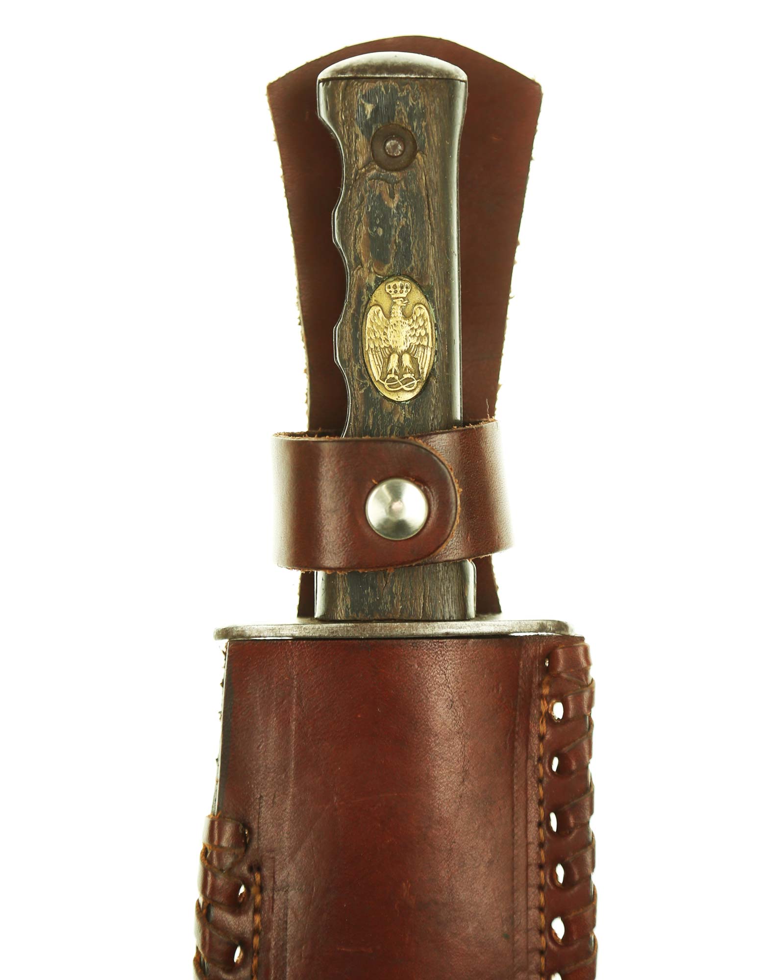 Кинжал P.A.I. (Итальянская африканская полиция) обр. 1939 года - P.C. 1816 г. Кожаные ножны. Захваты деревянные, посередине эмблема с изображением орла. Состояние 2, общий вес 386 г, общая длина 340 мм.