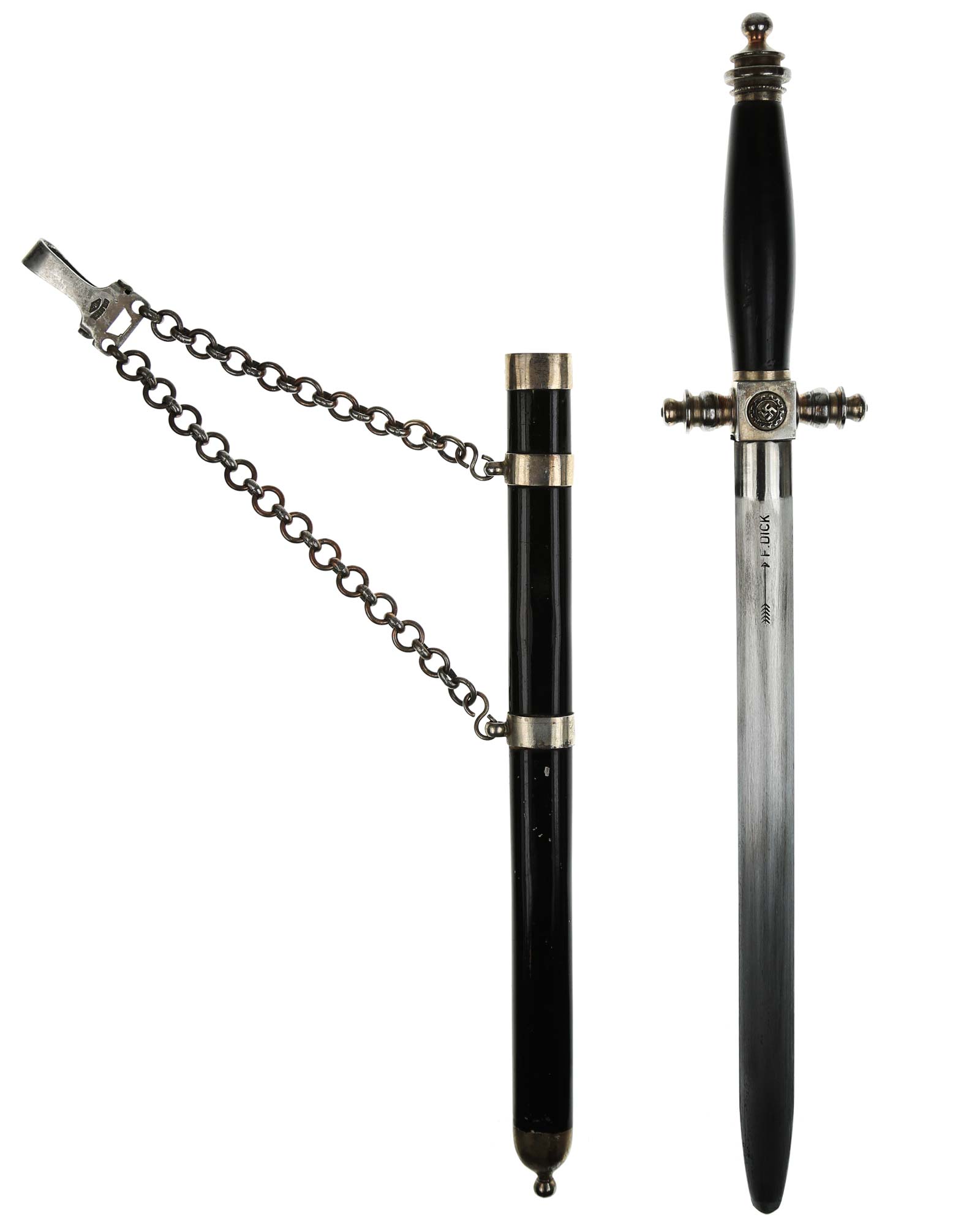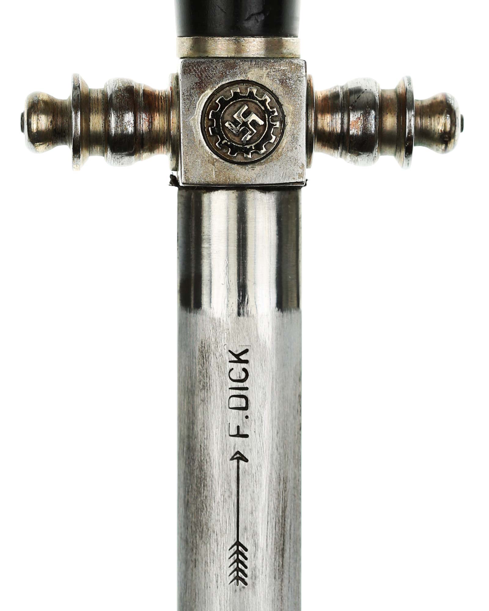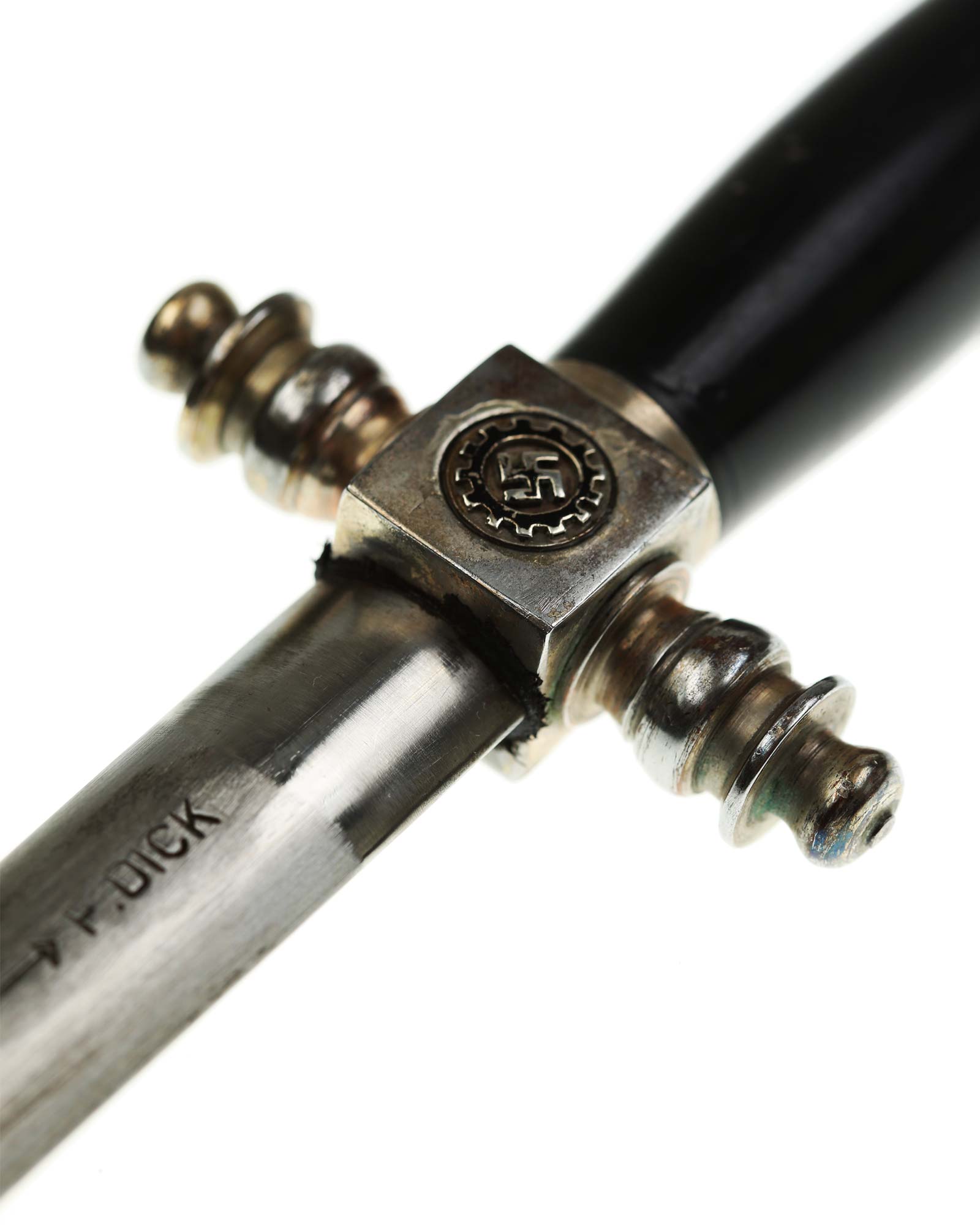 Клинок: Клинок стальной, прямой: Основание клинка: нанесена надпись в овале «F.DICK». Клеймо немецкой фирмы производителя Фридрих Дик Есслинген.