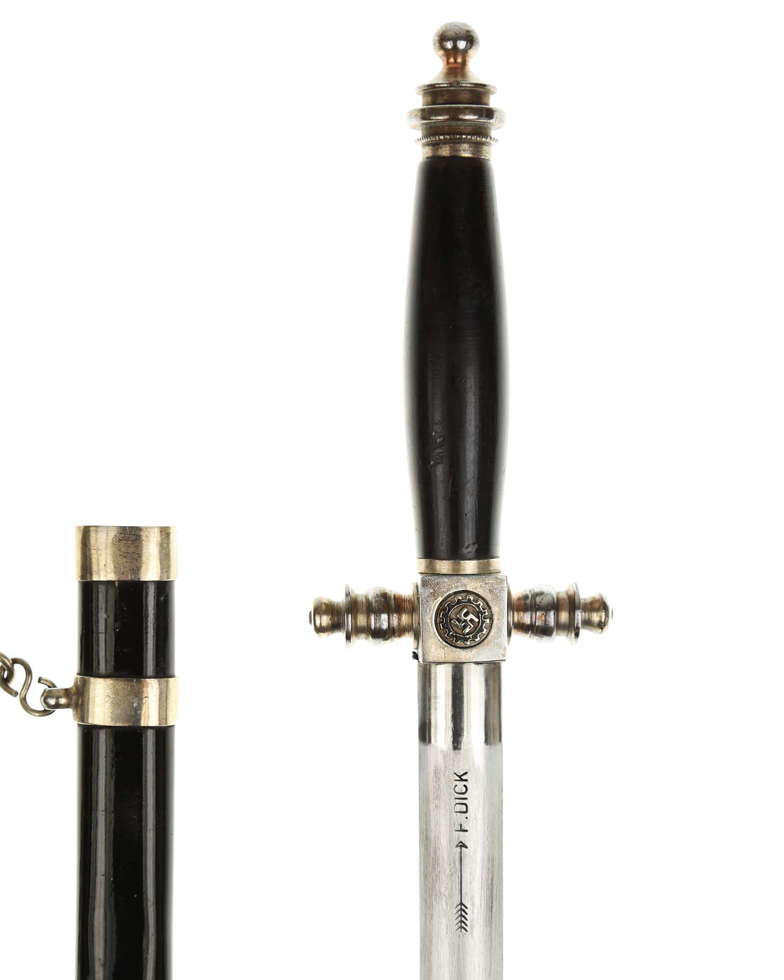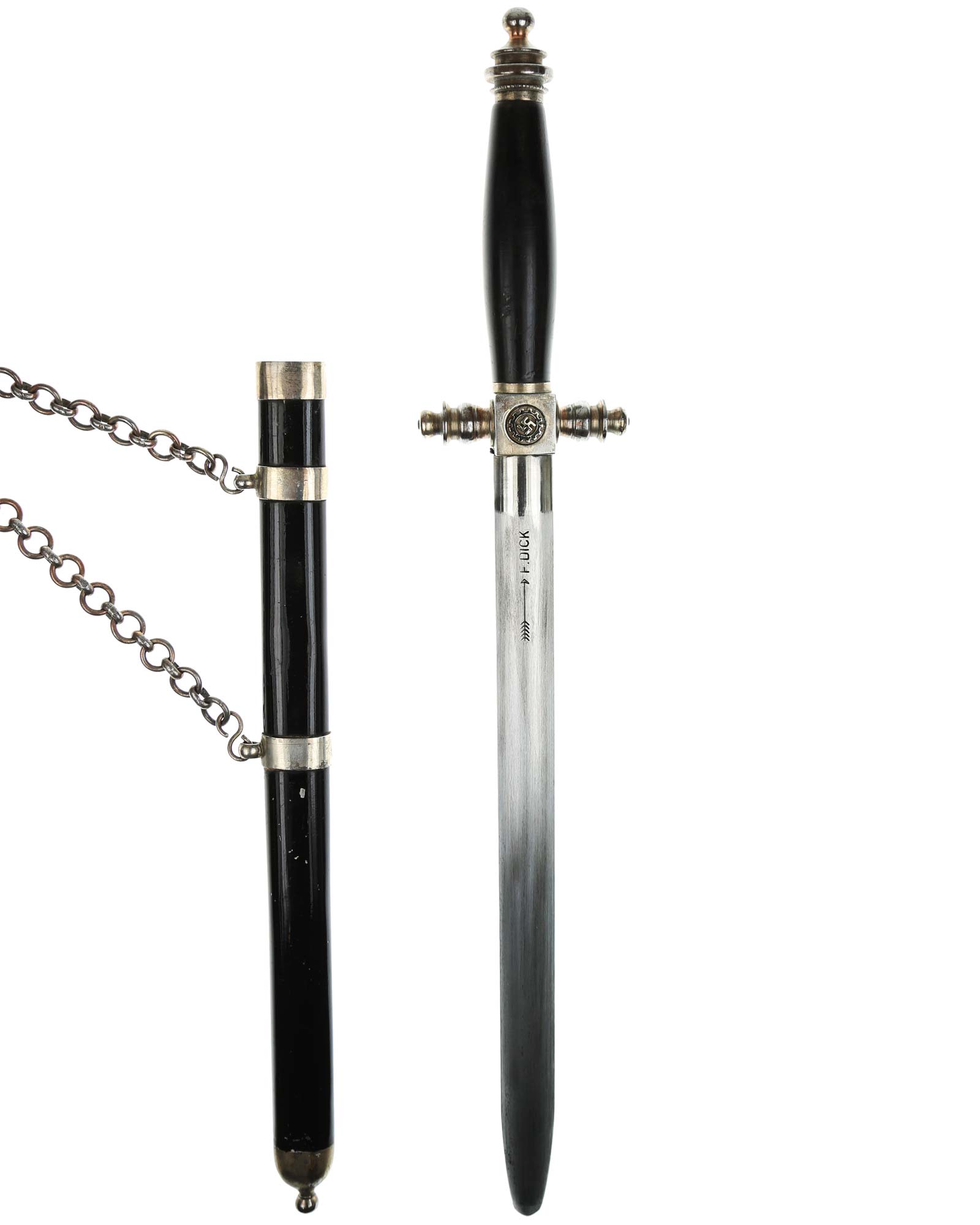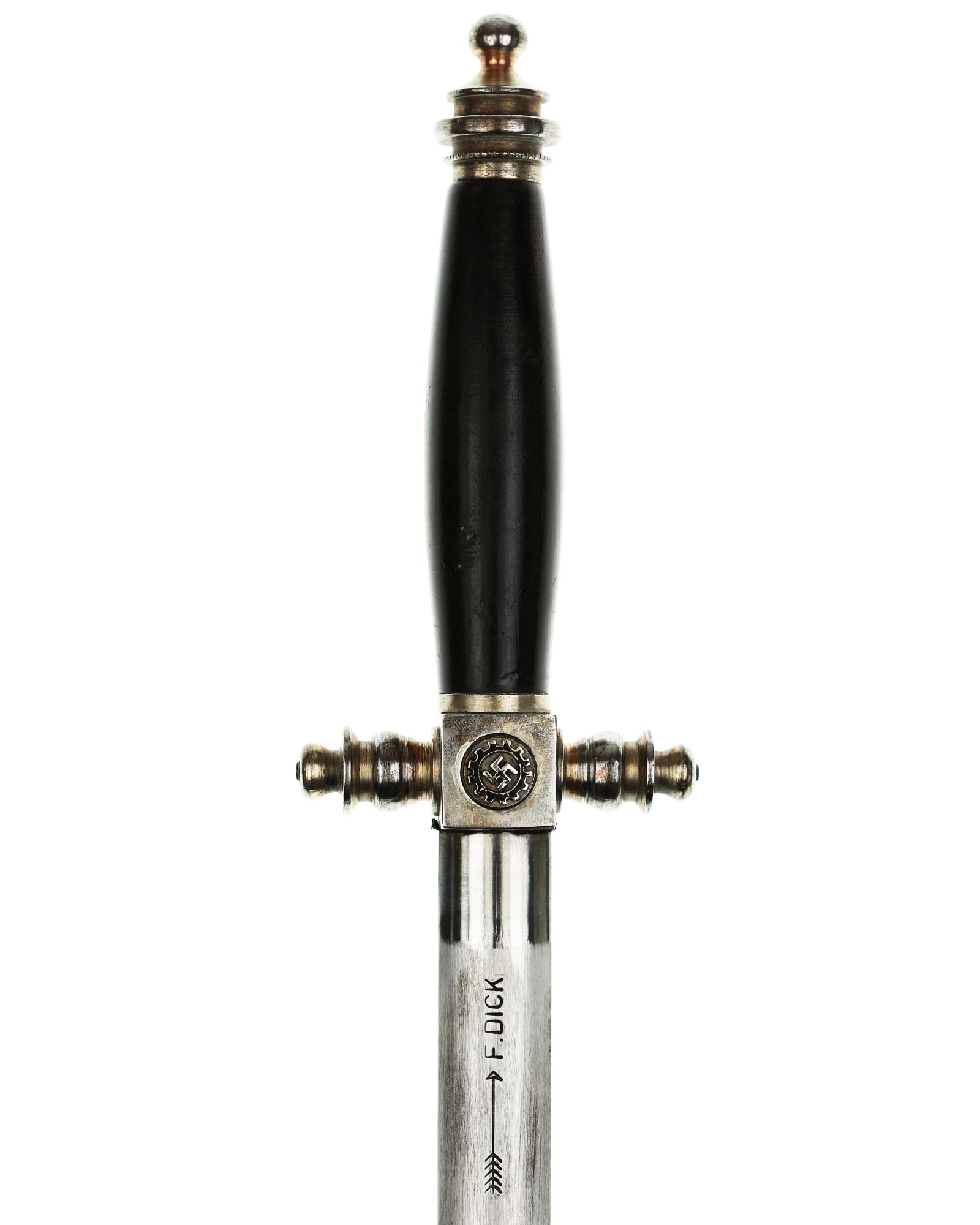Клинок: Клинок стальной, прямой: Основание клинка: нанесена надпись в овале «F.DICK». Клеймо немецкой фирмы производителя Фридрих Дик Есслинген.