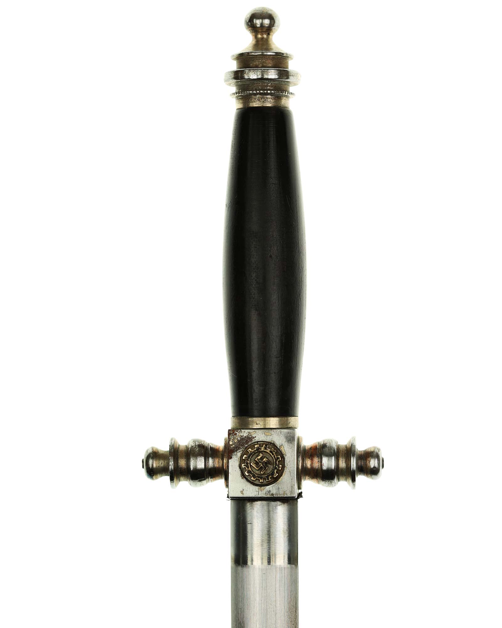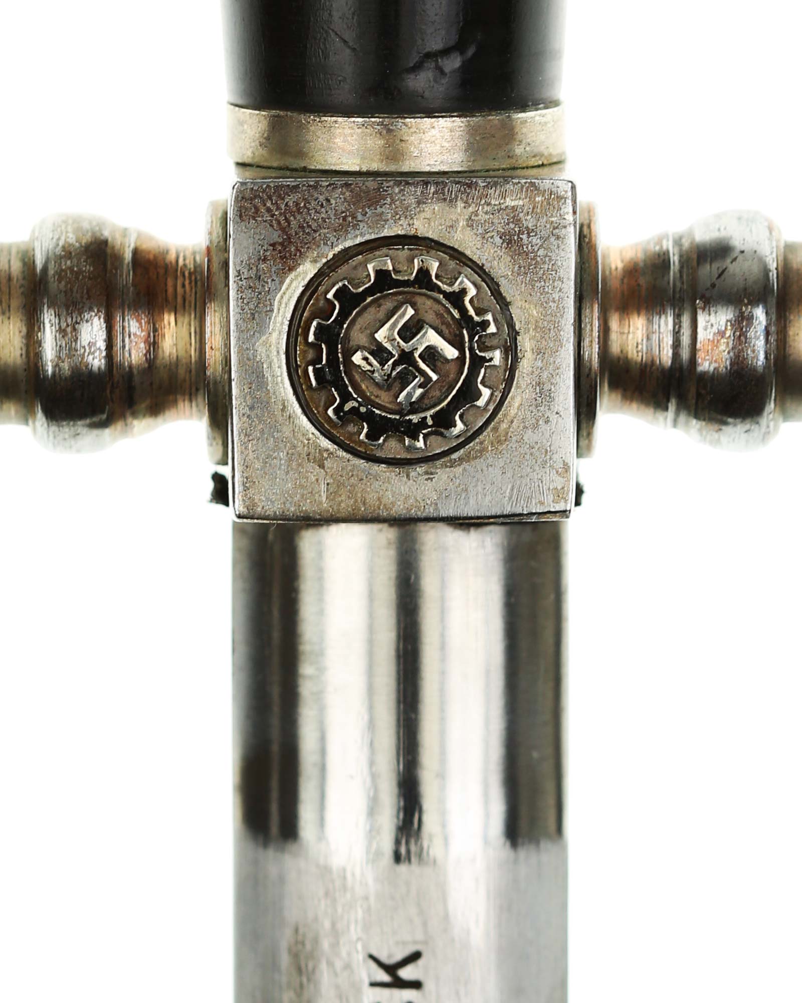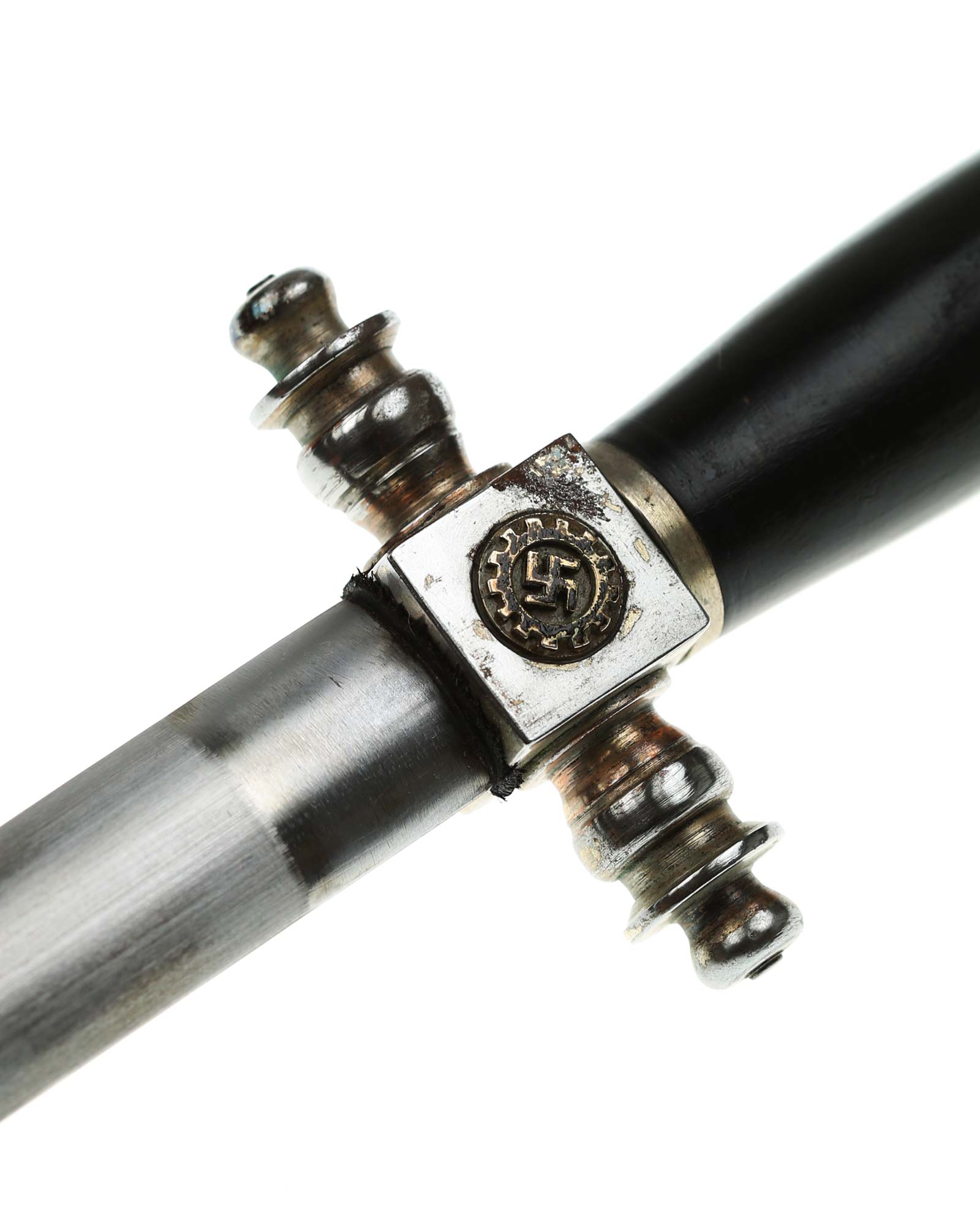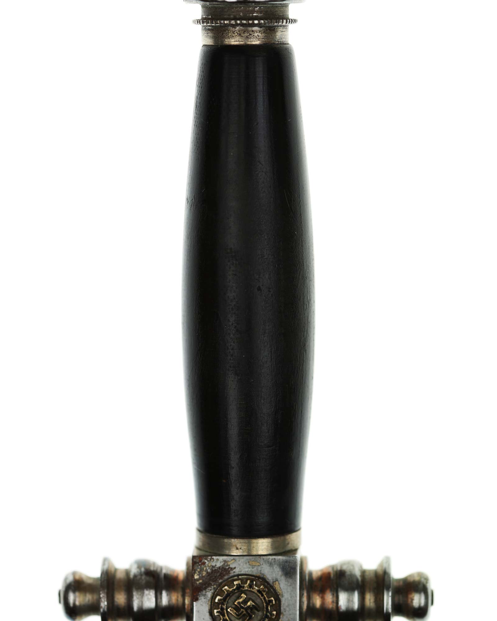Рукоять: Рукоять овального сечения, бочкообразная. Внизу цилиндрические гайка. Головка рукояти в виде фигурной пуговки, навинчивающейся на хвостовик клинка. Крестовина литая, металлическая. На перекрестье расположен квадратный блок, с обеих сторон украшенный медальонами с эмалевыми свастиками.