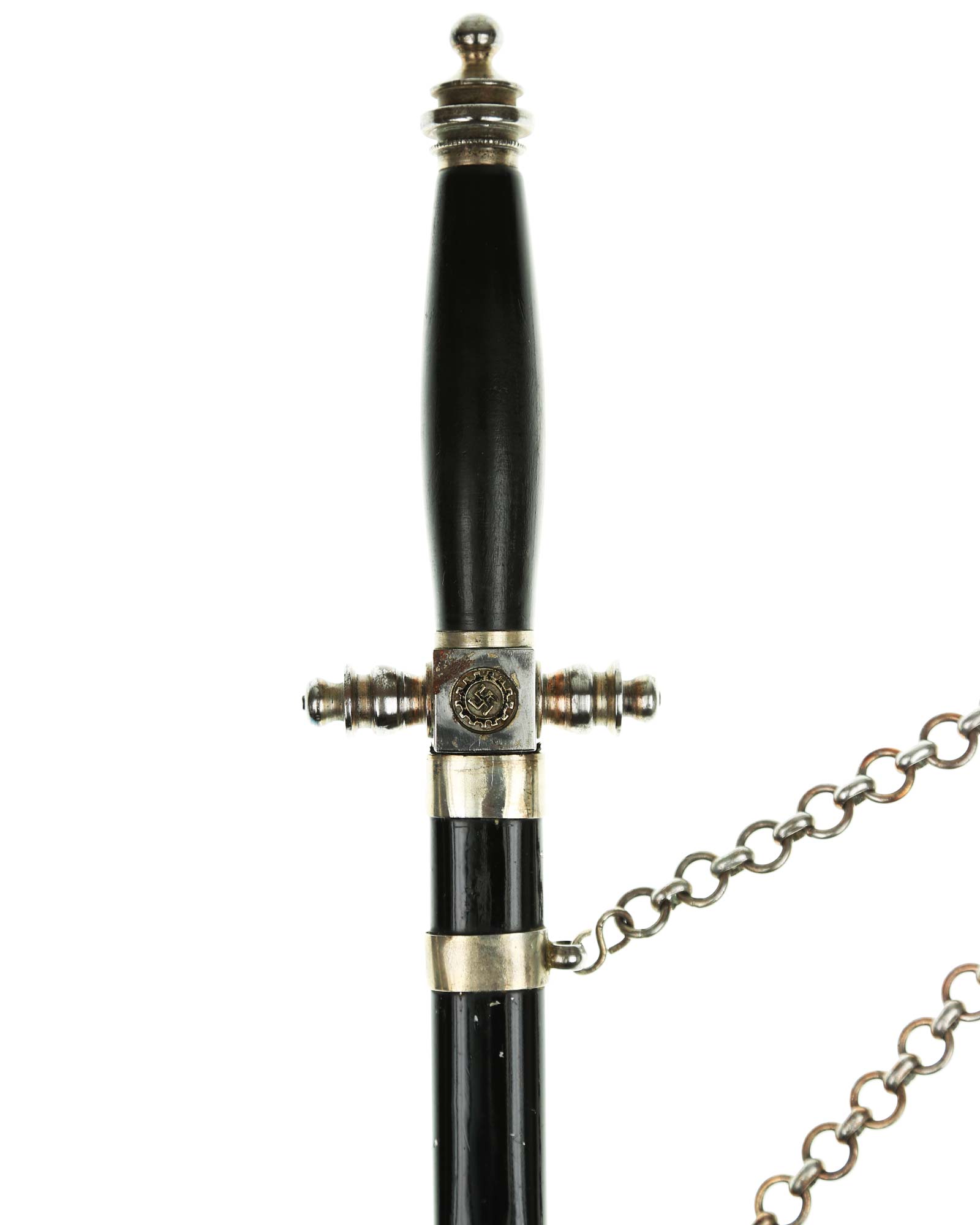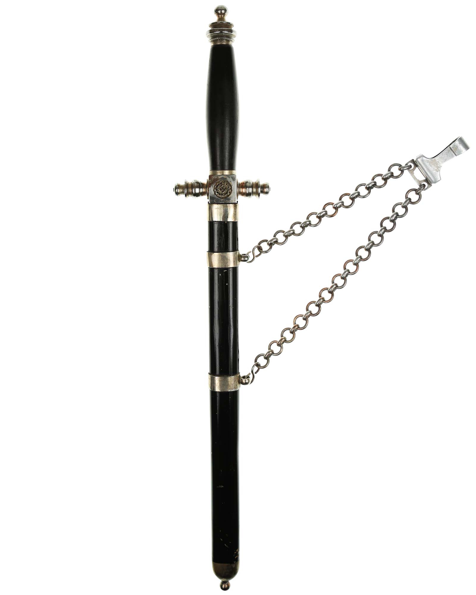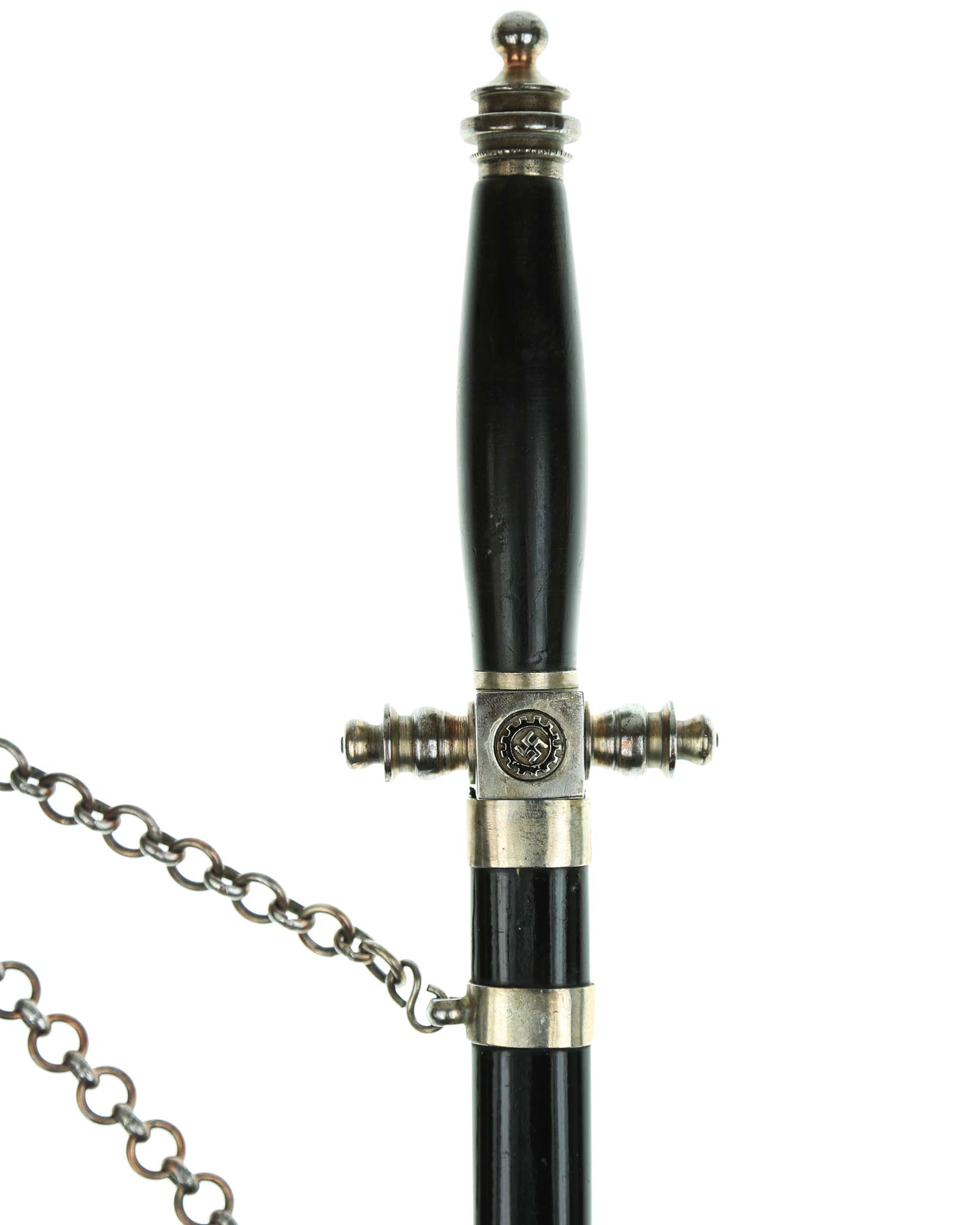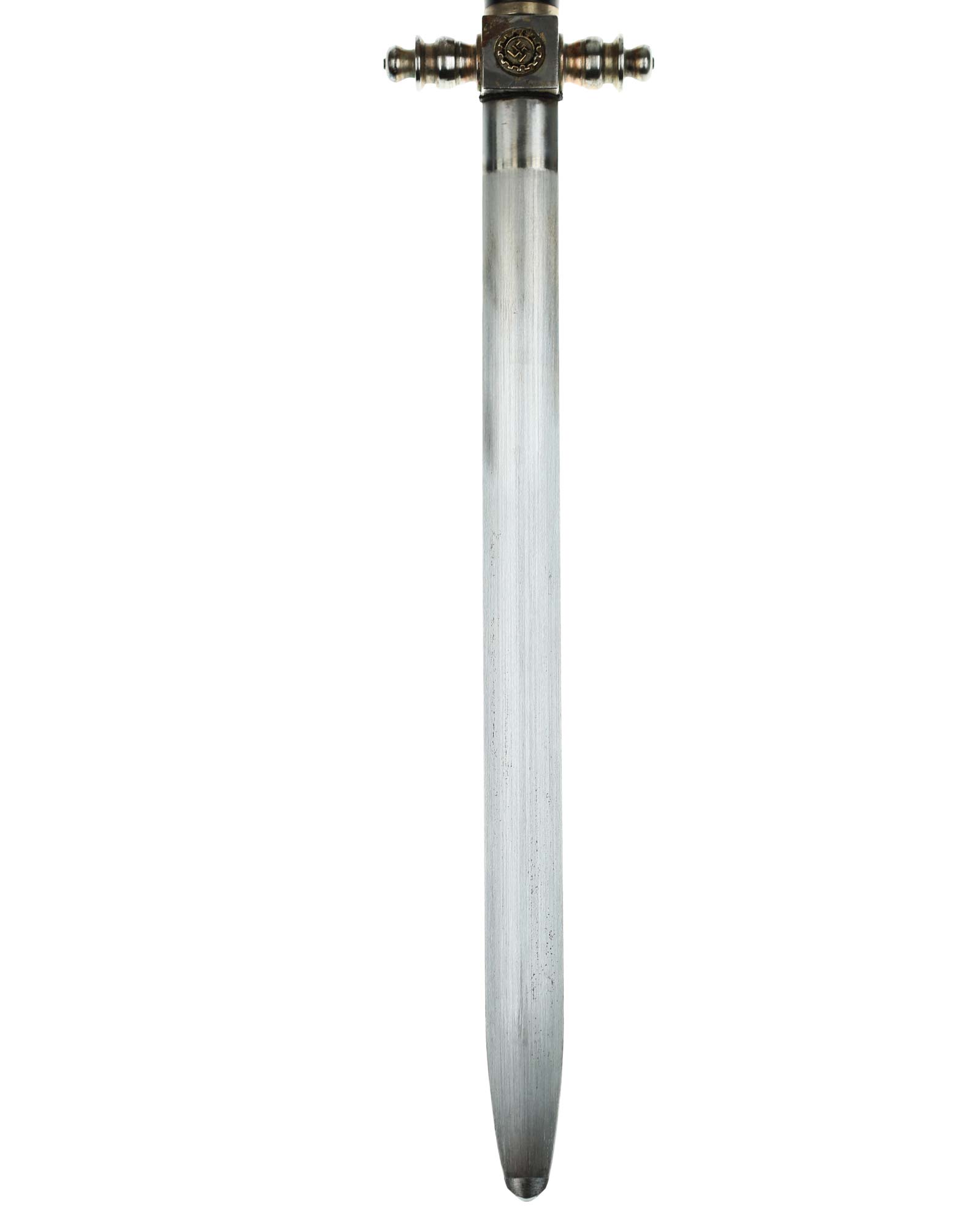 Рукоять: Рукоять овального сечения, бочкообразная. Внизу цилиндрические гайка. Головка рукояти в виде фигурной пуговки, навинчивающейся на хвостовик клинка. Крестовина литая, металлическая. На перекрестье расположен квадратный блок, с обеих сторон украшенный медальонами с эмалевыми свастиками.