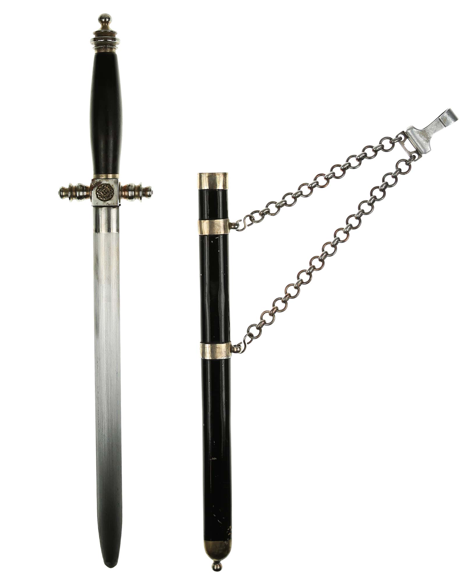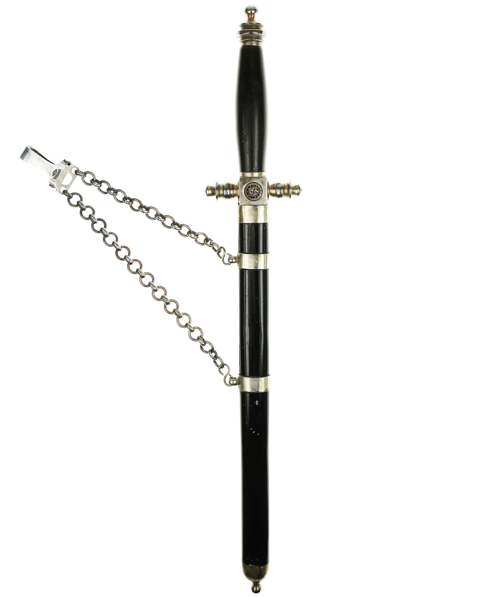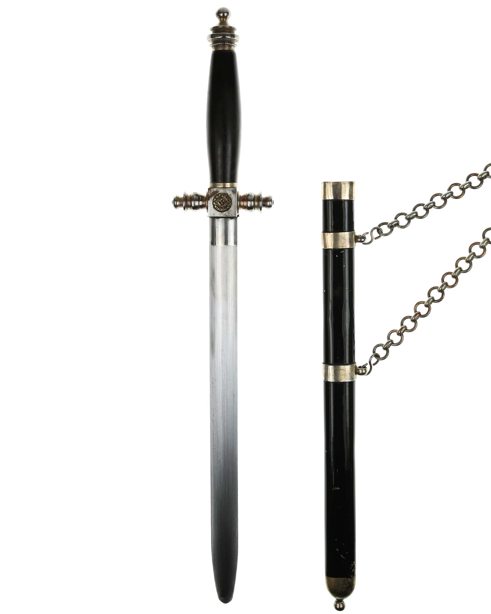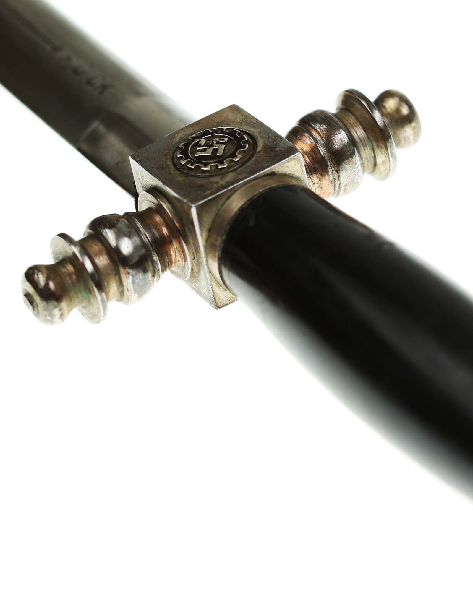 Рукоять: Рукоять овального сечения, бочкообразная. Внизу цилиндрические гайка. Головка рукояти в виде фигурной пуговки, навинчивающейся на хвостовик клинка. Крестовина литая, металлическая. На перекрестье расположен квадратный блок, с обеих сторон украшенный медальонами с эмалевыми свастиками.