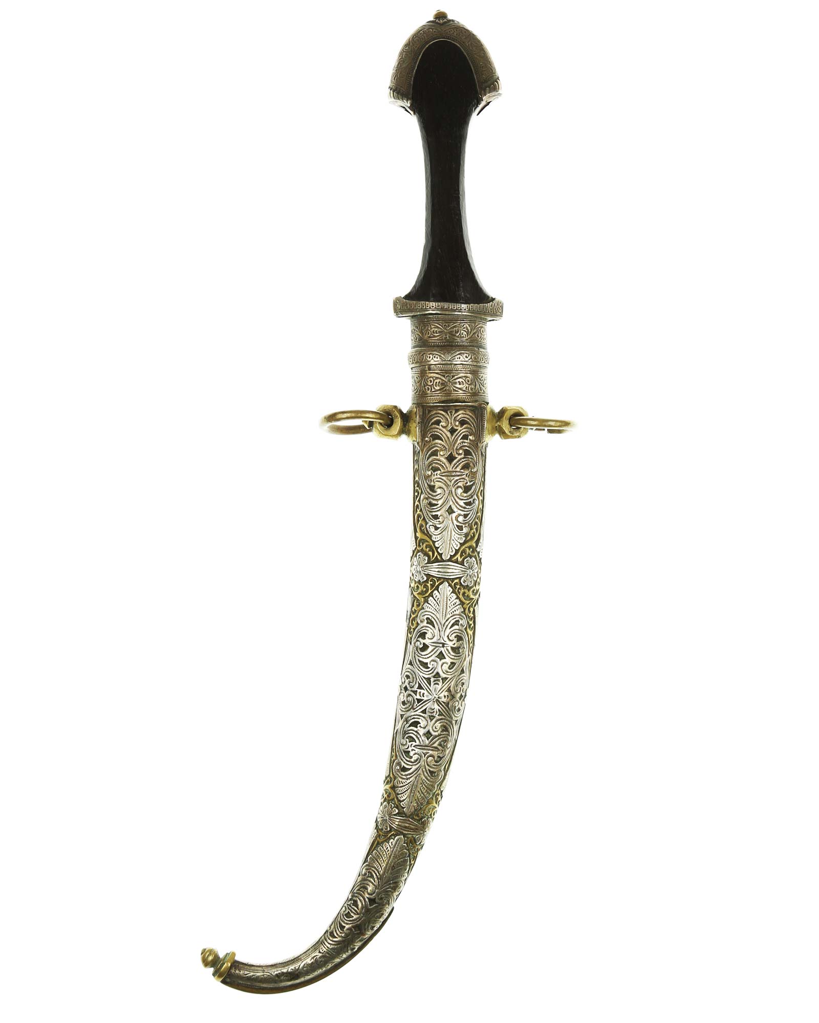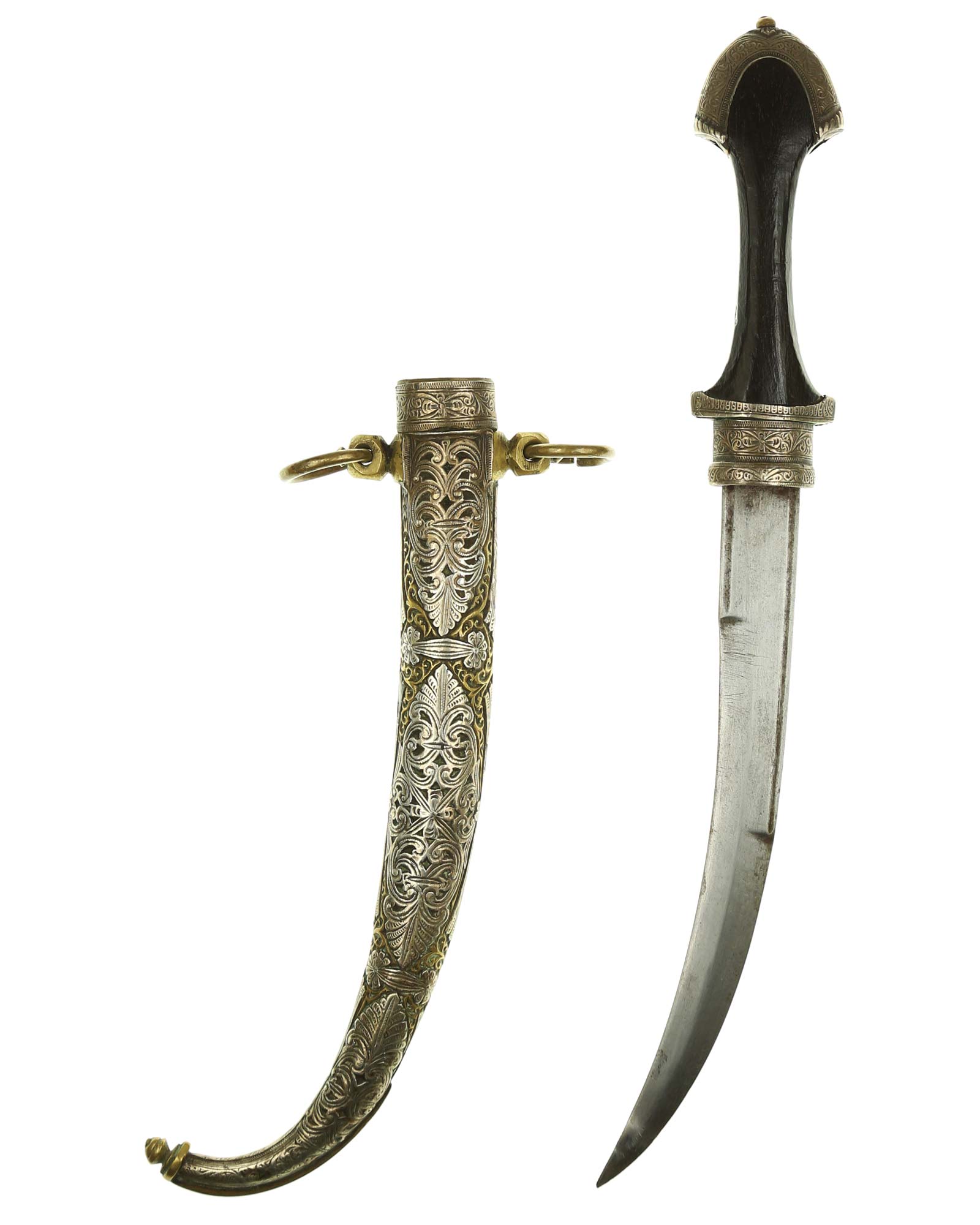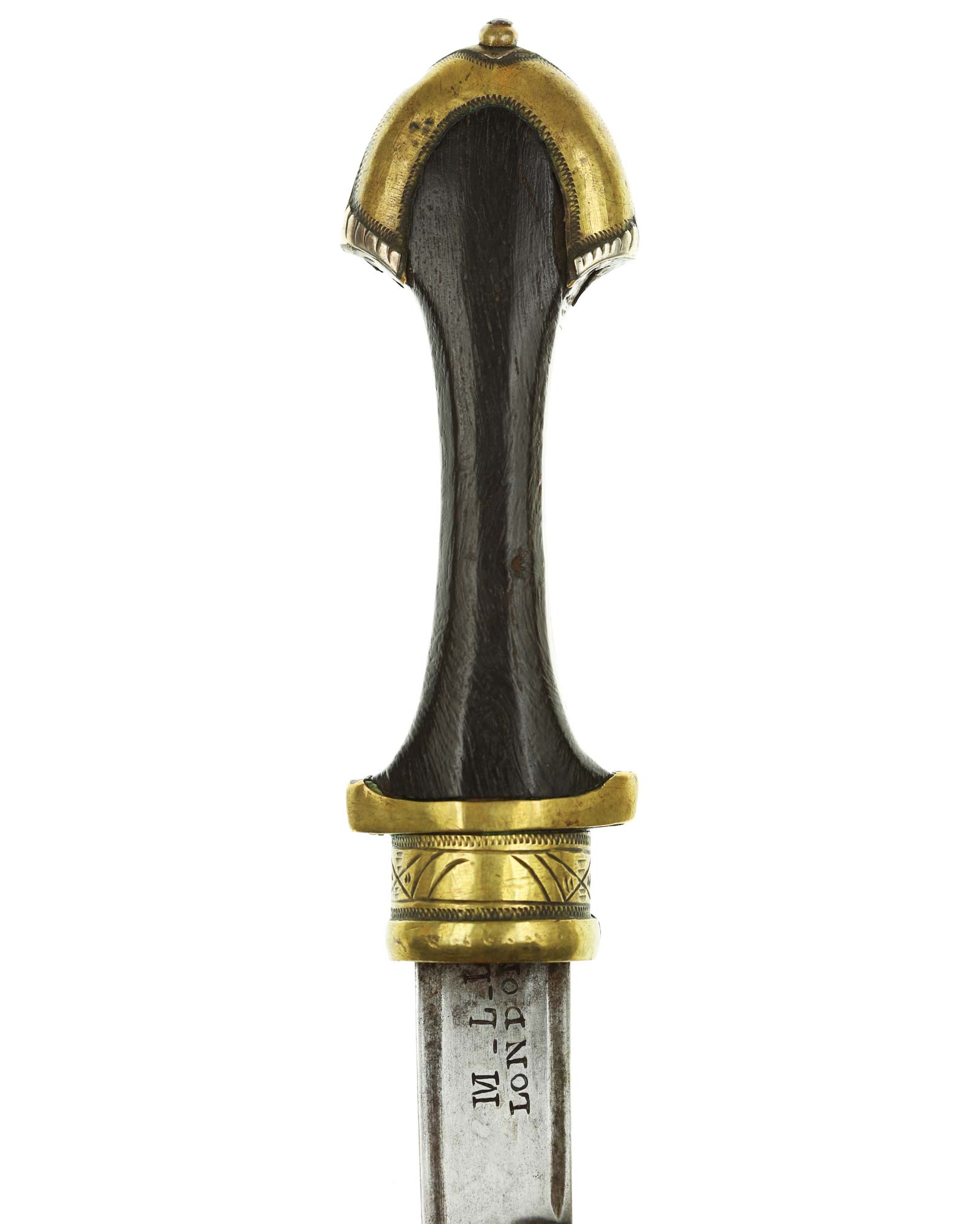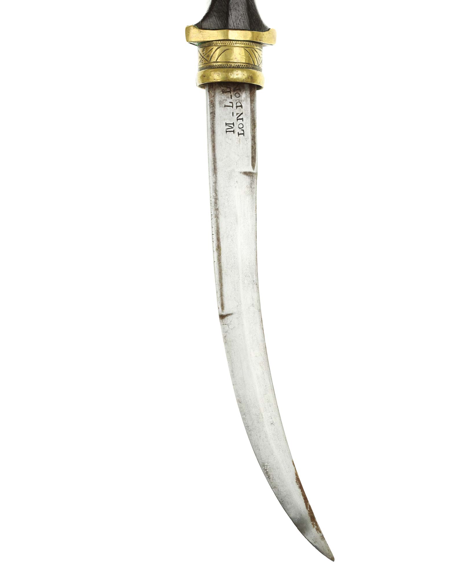 Марокканский кинжал Koummya с британским клинком [около 1855], изогнутый клинок маркирован британским производителем (M_L_L London). Ручка изготовлена из дерева. Кинжал Куммя украшен с обеих сторон. Состояние: Хорошее состояние, общий вес 400 г, общая длина 50,1 см.