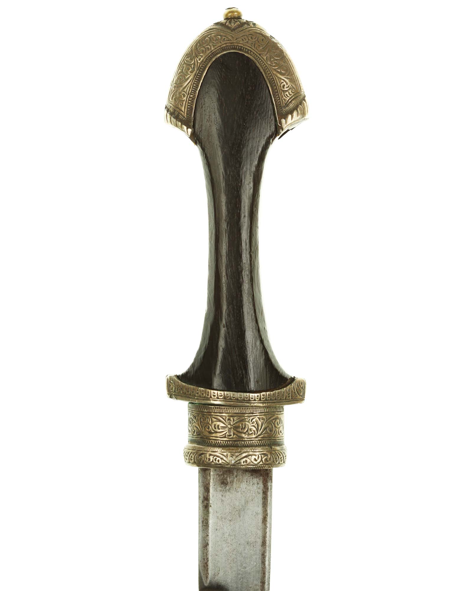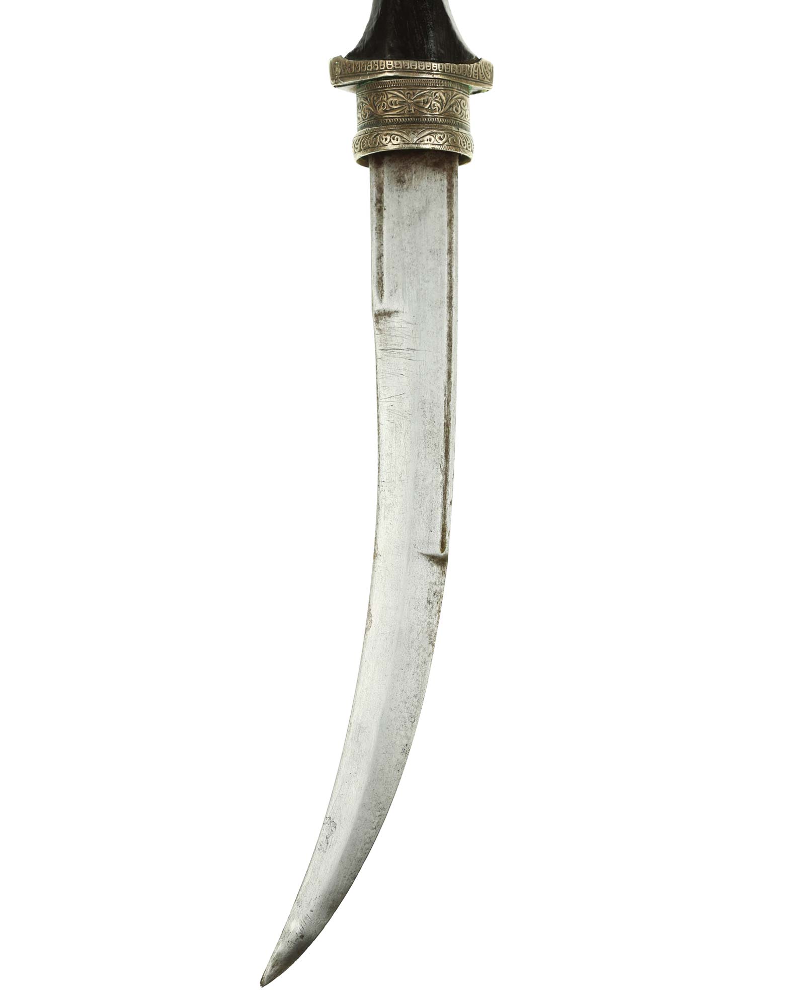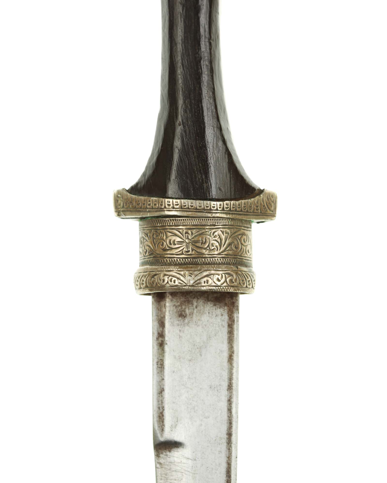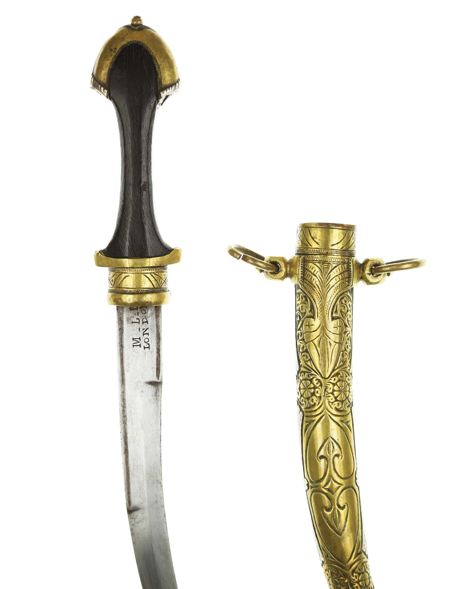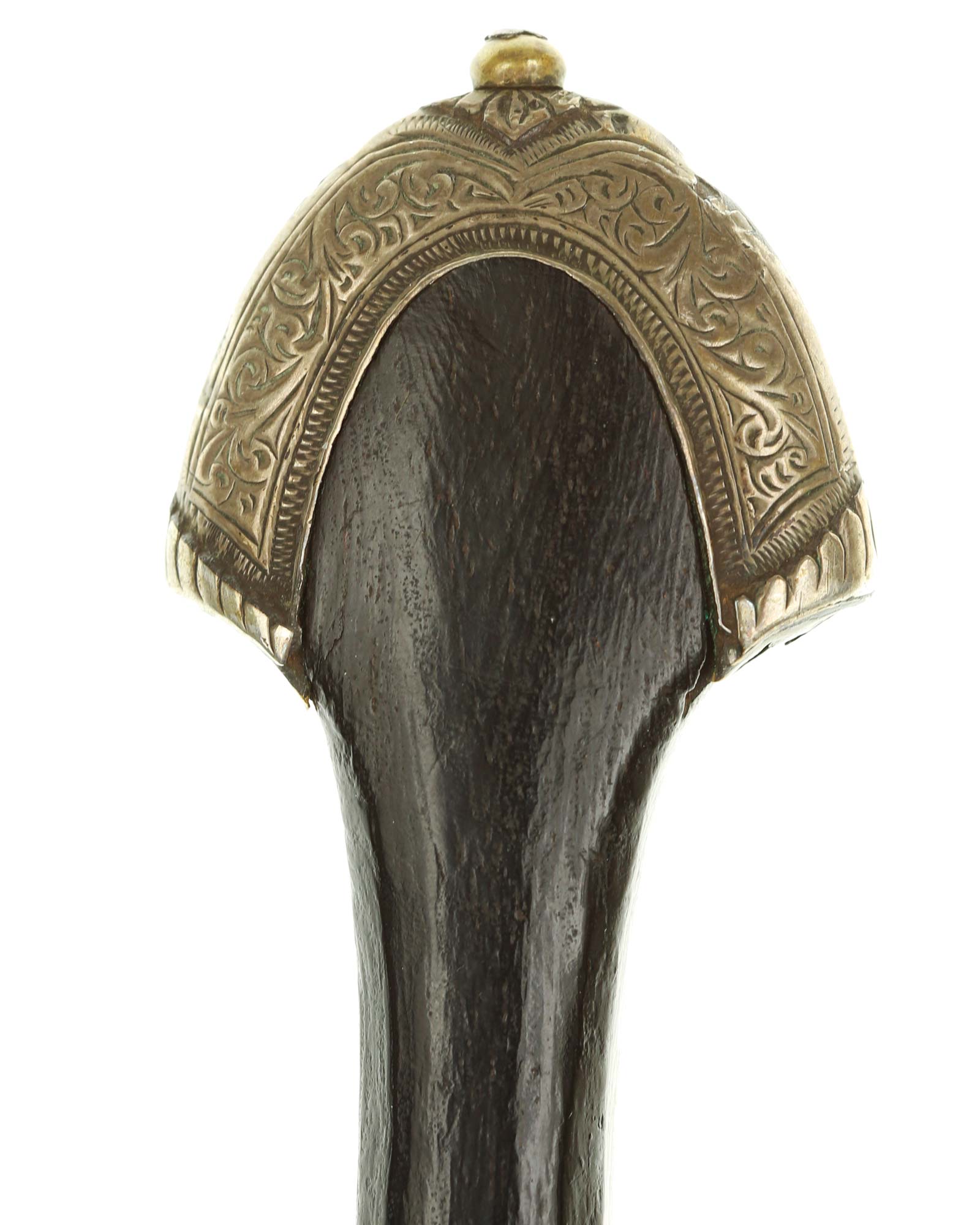 Марокканский кинжал Koummya с британским клинком [около 1855], изогнутый клинок маркирован британским производителем (M_L_L London). Ручка изготовлена из дерева. Кинжал Куммя украшен с обеих сторон. Состояние: Хорошее состояние, общий вес 400 г, общая длина 50,1 см.