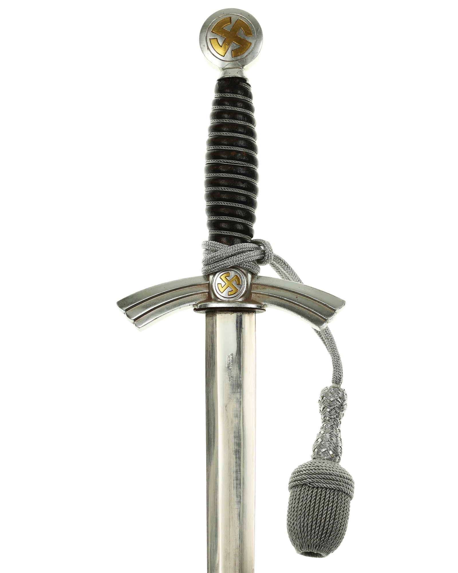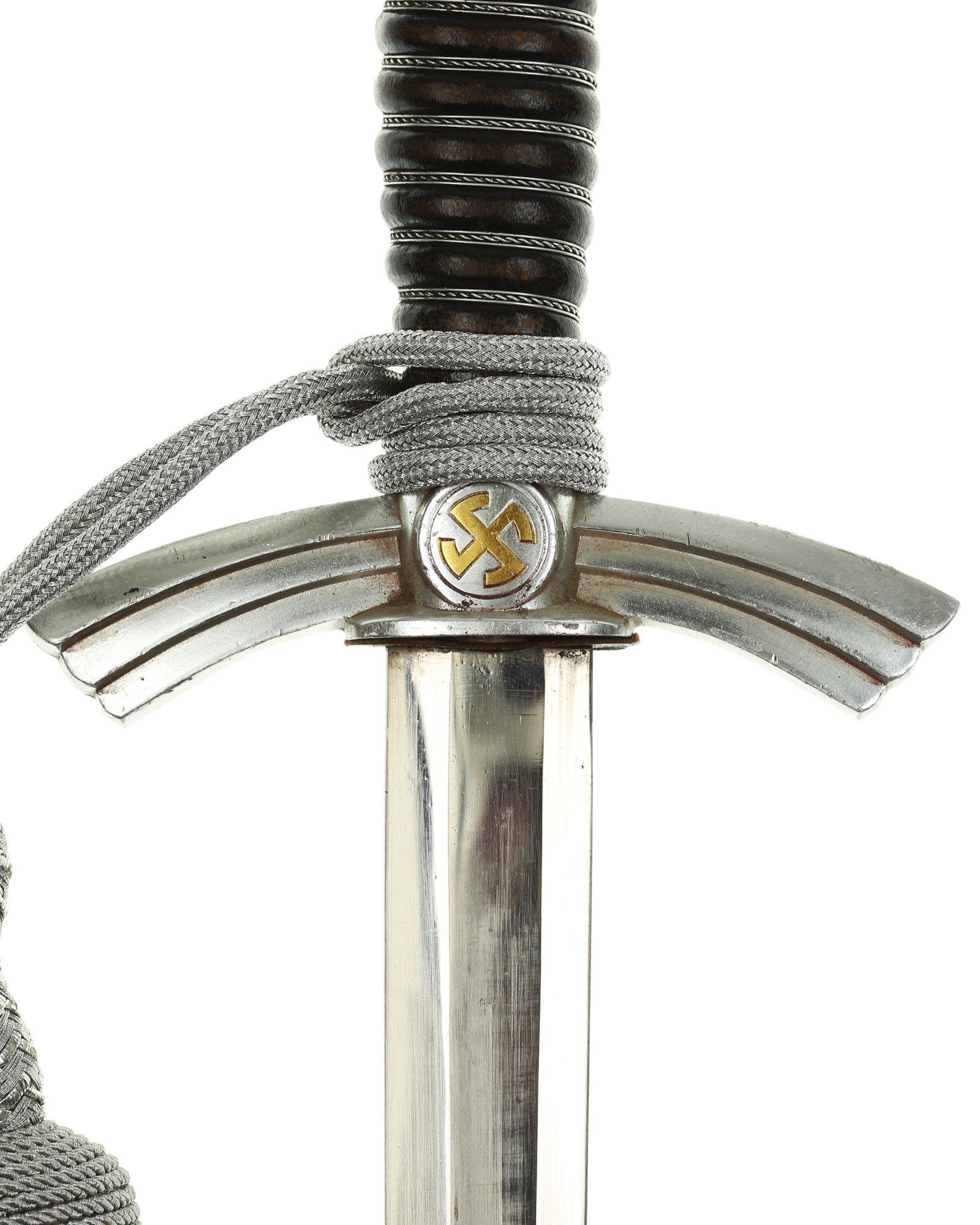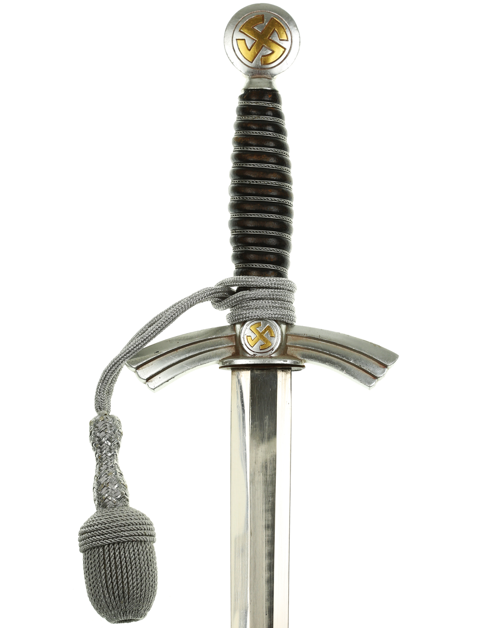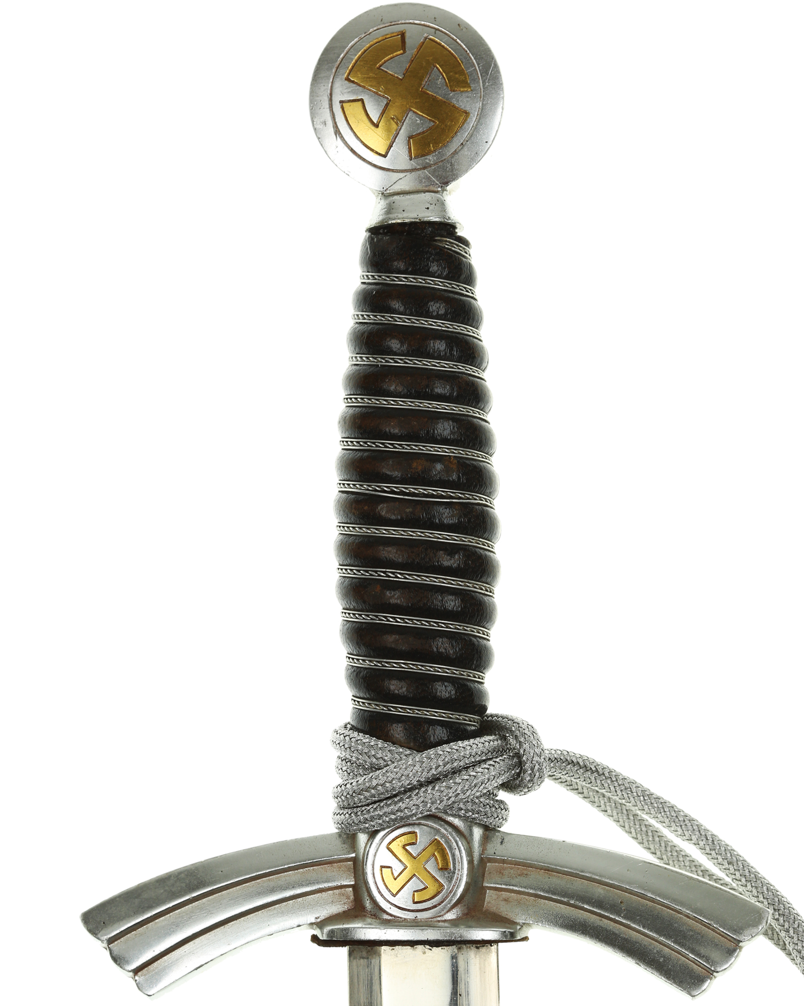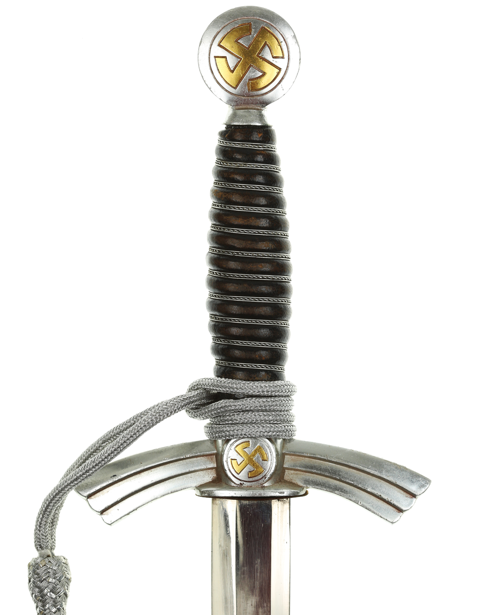 Рукоять: Рукоять деревянная, бочкообразная, покрытая темно-синей кожей, по желобкам обмотана проволокой. Нижняя гайка цилиндрическая, верхняя гайка коническая и составляет одно целое с круглой плоской головкой, навинчивающейся на хвостовик клинка. На обеих сторонах головки имеются вписанные в круг свастики. Крестовина литая, выполнена в виде трех наложенных друг на друга дужек, с загнутыми вниз концами. На перекрестье с обеих сторон на круглых медальонах имеется уменьшенное изображение свастики, как на головке. Под перекрестьем расположена массивная овальная шайба, отлитая вместе с крестовиной.