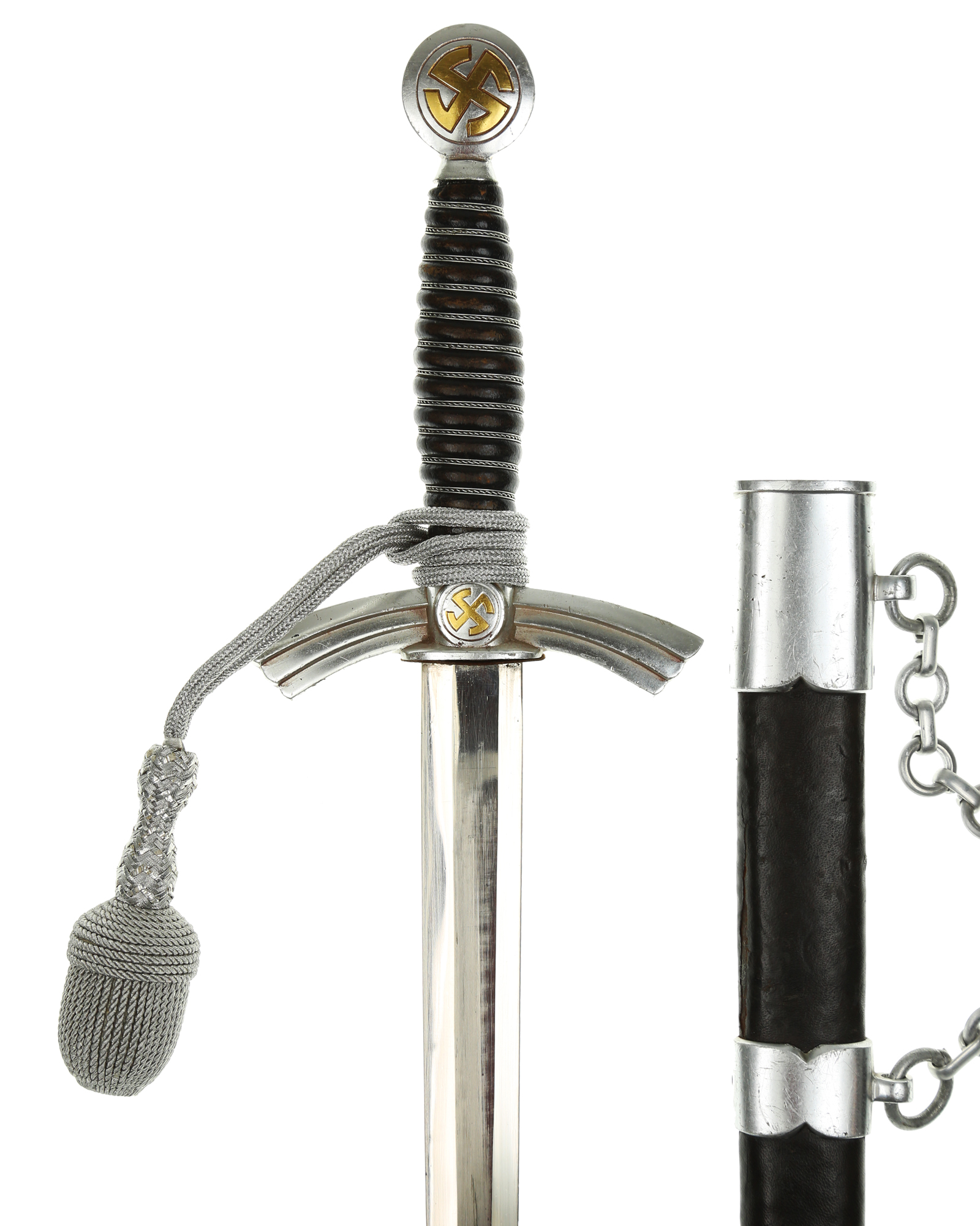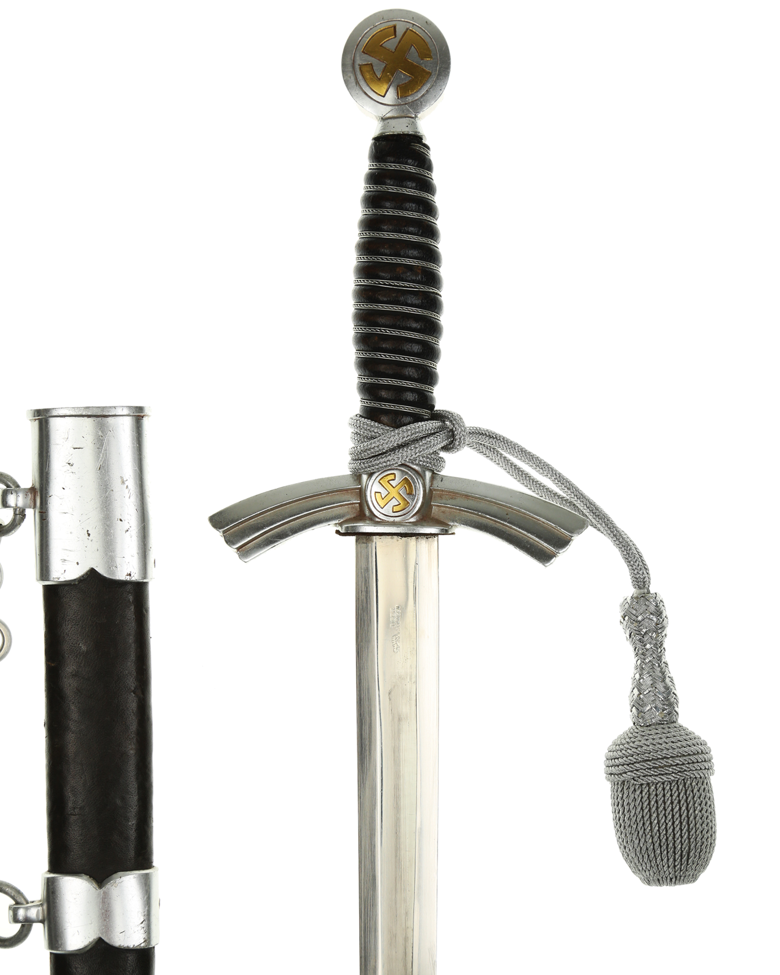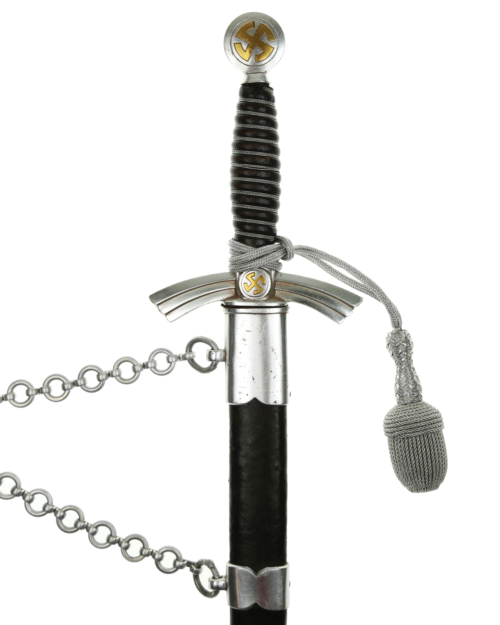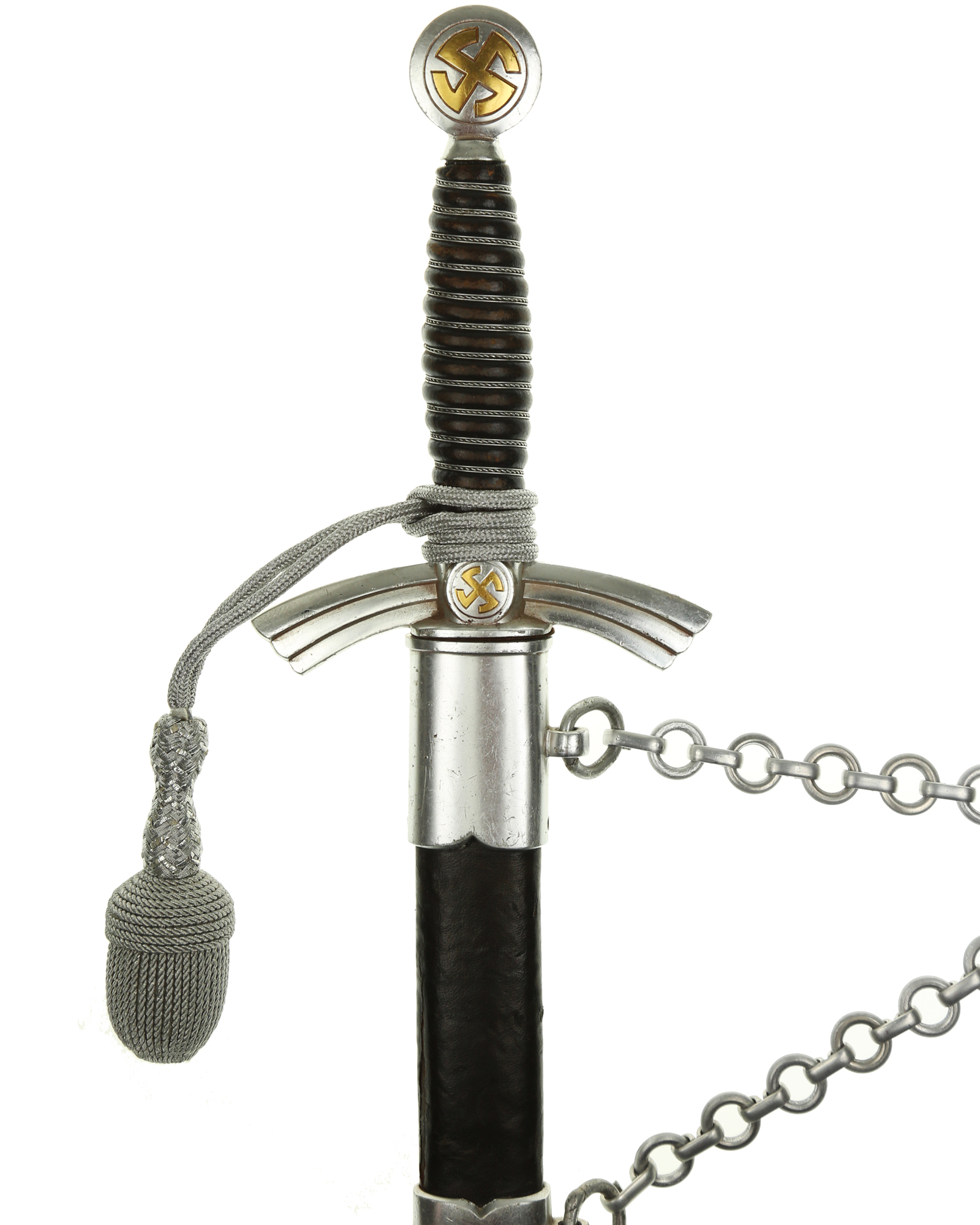 Рукоять: Рукоять деревянная, бочкообразная, покрытая темно-синей кожей, по желобкам обмотана проволокой. Нижняя гайка цилиндрическая, верхняя гайка коническая и составляет одно целое с круглой плоской головкой, навинчивающейся на хвостовик клинка. На обеих сторонах головки имеются вписанные в круг свастики. Крестовина литая, выполнена в виде трех наложенных друг на друга дужек, с загнутыми вниз концами. На перекрестье с обеих сторон на круглых медальонах имеется уменьшенное изображение свастики, как на головке. Под перекрестьем расположена массивная овальная шайба, отлитая вместе с крестовиной.