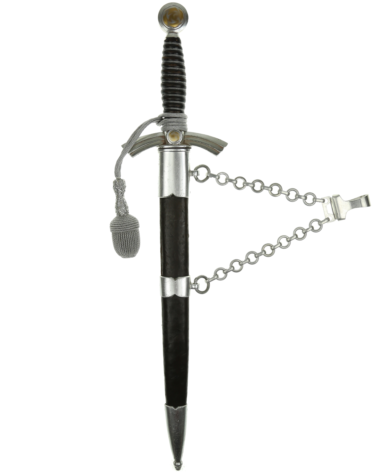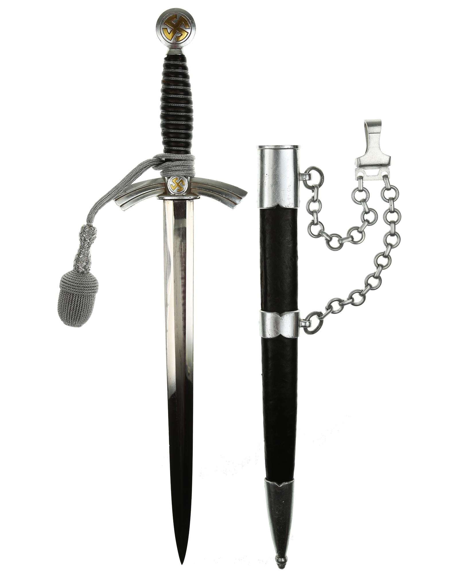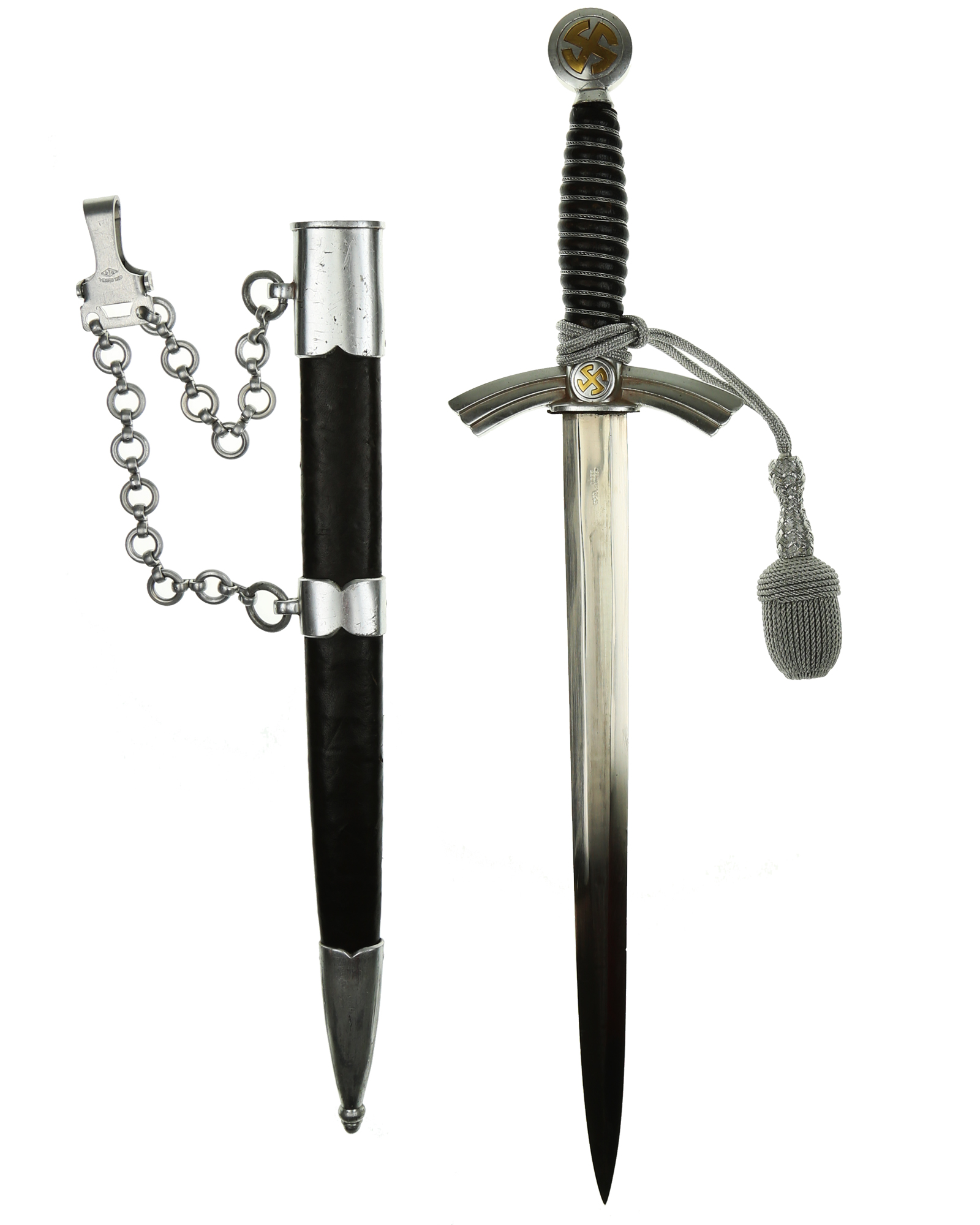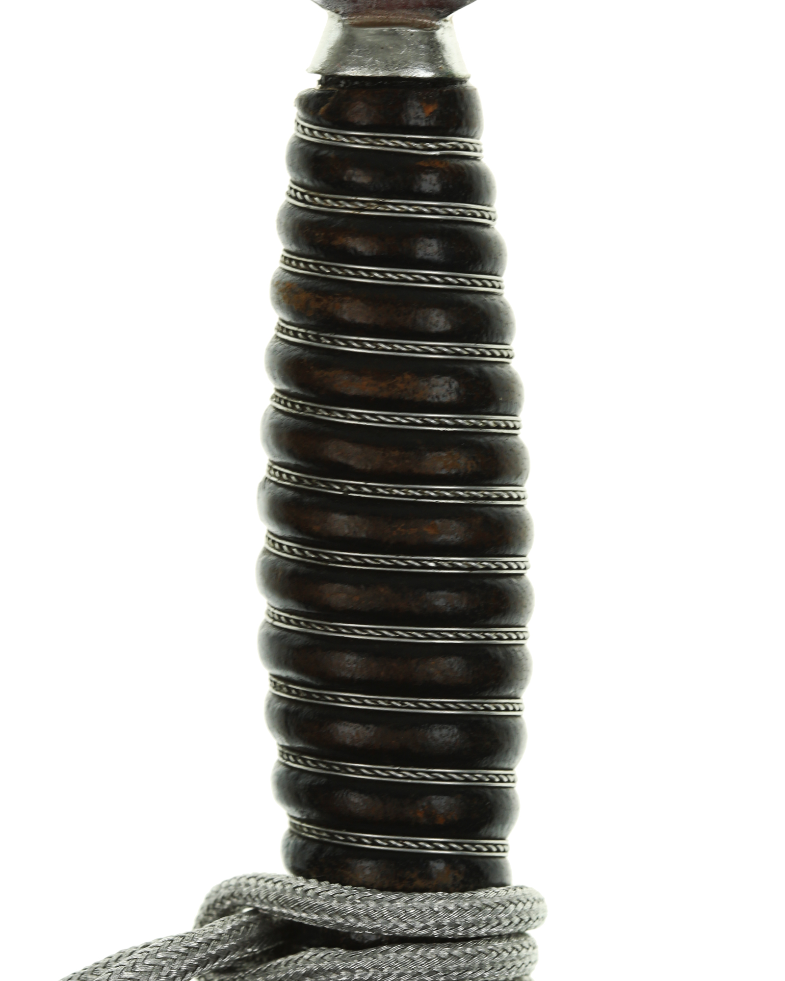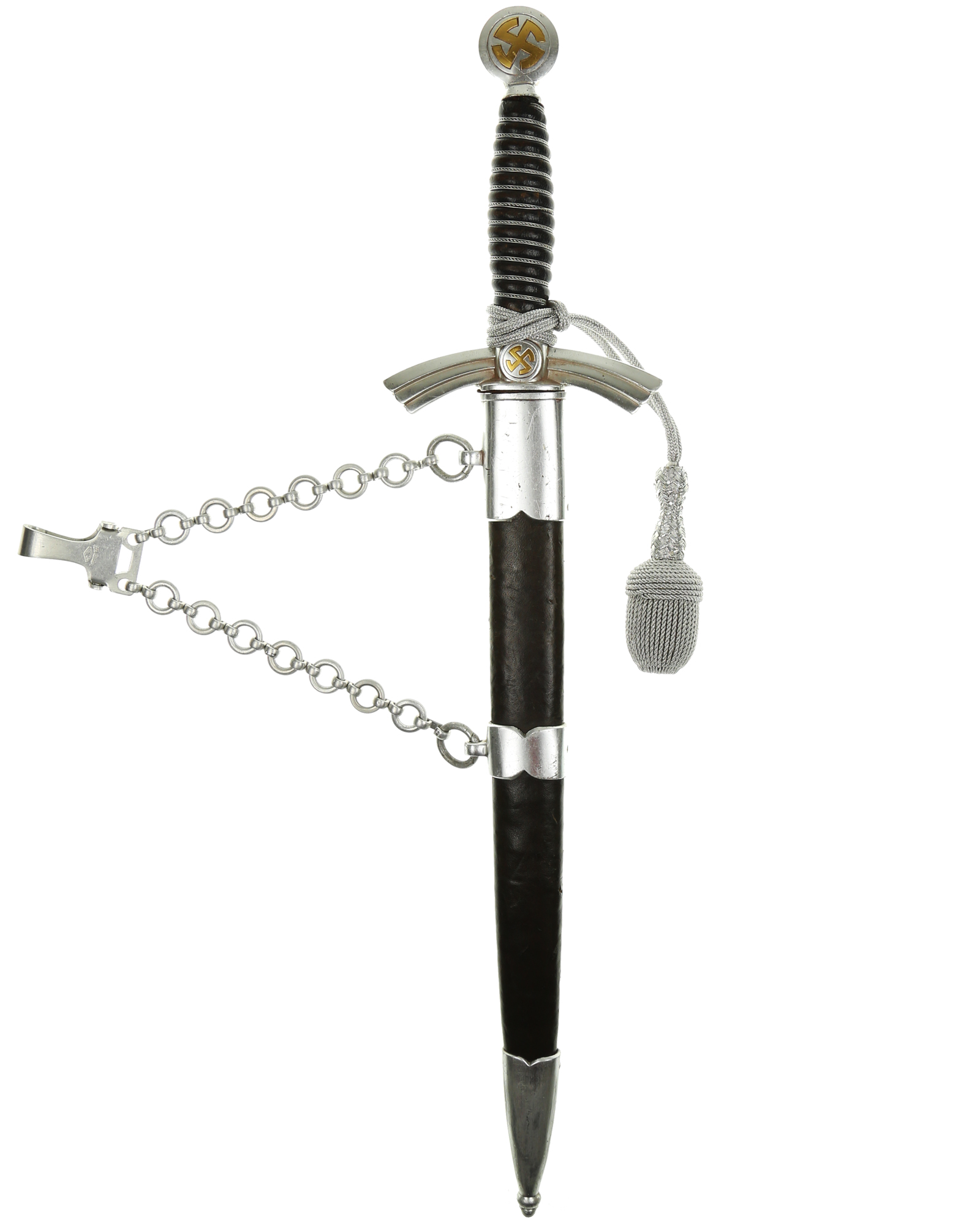 Рукоять: Рукоять деревянная, бочкообразная, покрытая темно-синей кожей, по желобкам обмотана проволокой. Нижняя гайка цилиндрическая, верхняя гайка коническая и составляет одно целое с круглой плоской головкой, навинчивающейся на хвостовик клинка. На обеих сторонах головки имеются вписанные в круг свастики. Крестовина литая, выполнена в виде трех наложенных друг на друга дужек, с загнутыми вниз концами. На перекрестье с обеих сторон на круглых медальонах имеется уменьшенное изображение свастики, как на головке. Под перекрестьем расположена массивная овальная шайба, отлитая вместе с крестовиной.